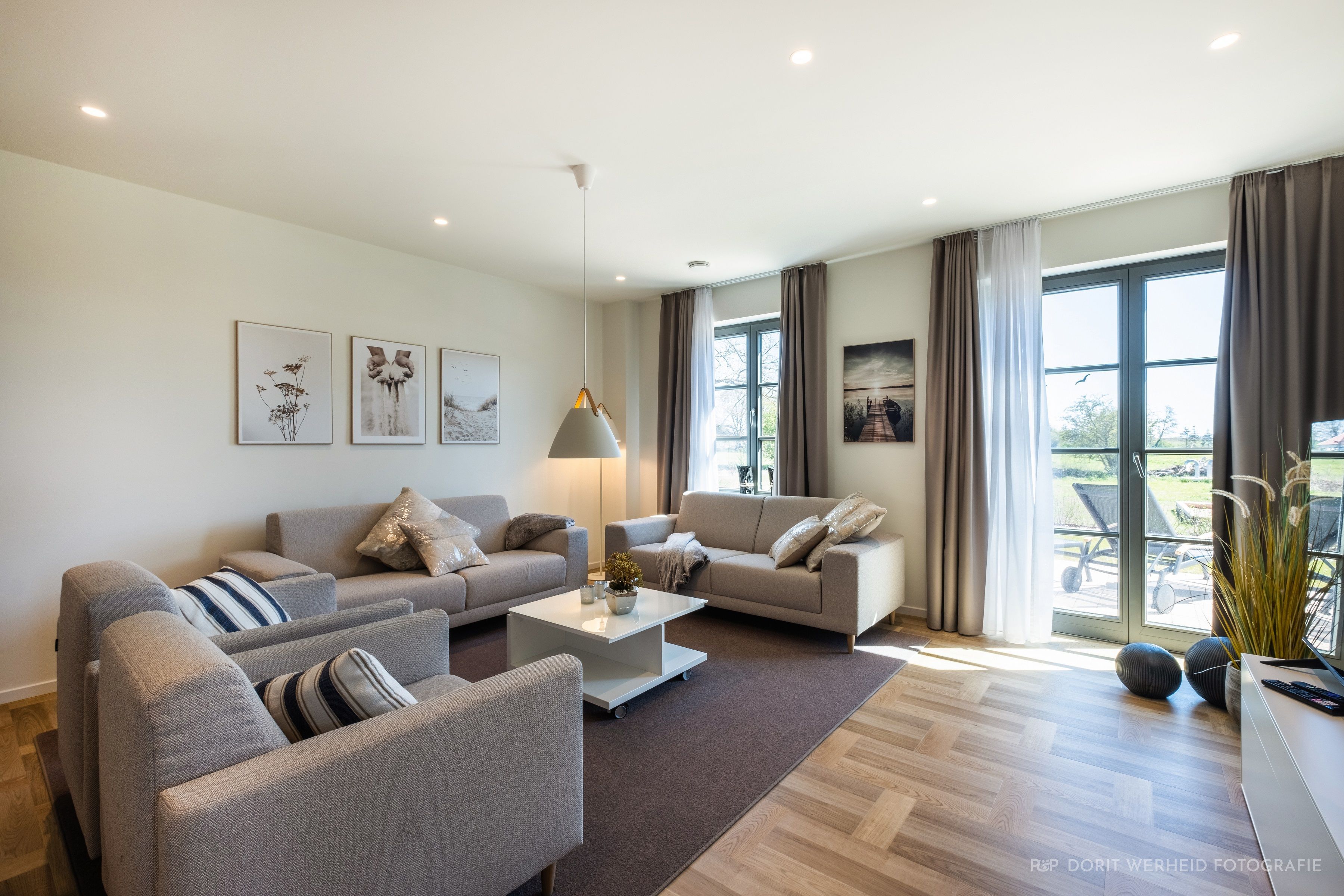Der Wohnraum bietet durch die großzügige Verglasung und einen weiten Blick über die Felder und das Haff er bietet ausreichend Platz für gemeinsames Essen und gesellige Fernseh- oder Spielabende. Ein großer Flat TV stehen Ihnen zur Verfügung. Die Wohnküche mit Vollausstattung verfügt über alle Standardgeräte, wie Kühl-/ Gefrierkombination, Spülmaschine, Backofen mit integrierter Mikrowelle, Induktionsherd, Kaffeemaschine, Wasserkocher und Toaster. Von diesem Bereich gelangen Sie direkt auf die beiden Terrassen (30m² groß) mit herrlichem Blick ins Grüne. Für gemütliche Grillabende auf der Terrasse steht ein Elektrogrill zur Verfügung. Ebenfalls befindet sich im Erdgeschoss ein Schlafzimmer mit einem Boxspringbett und Flachbild TV sowie ein kleines Badezimmer mit Waschbecken, WC und bodentiefer Dusche.