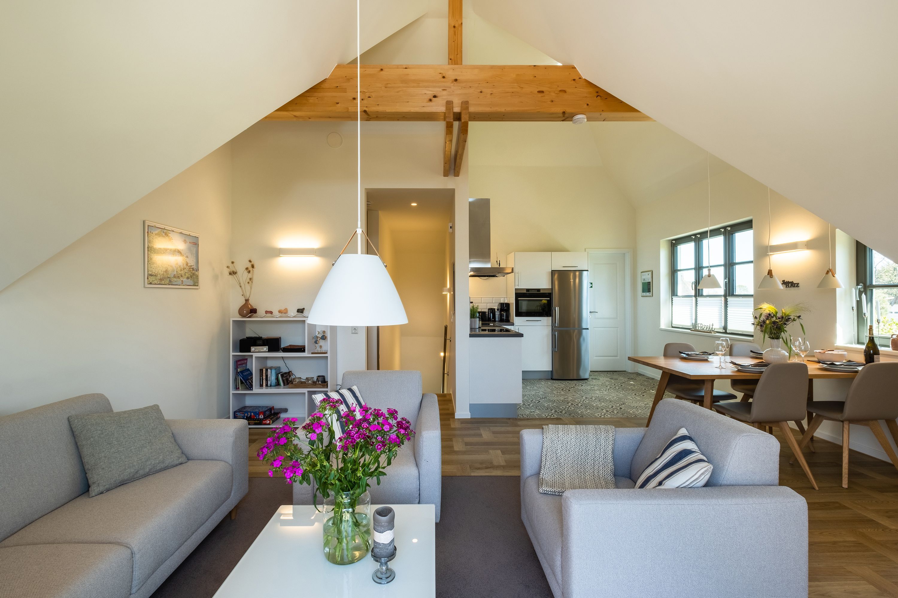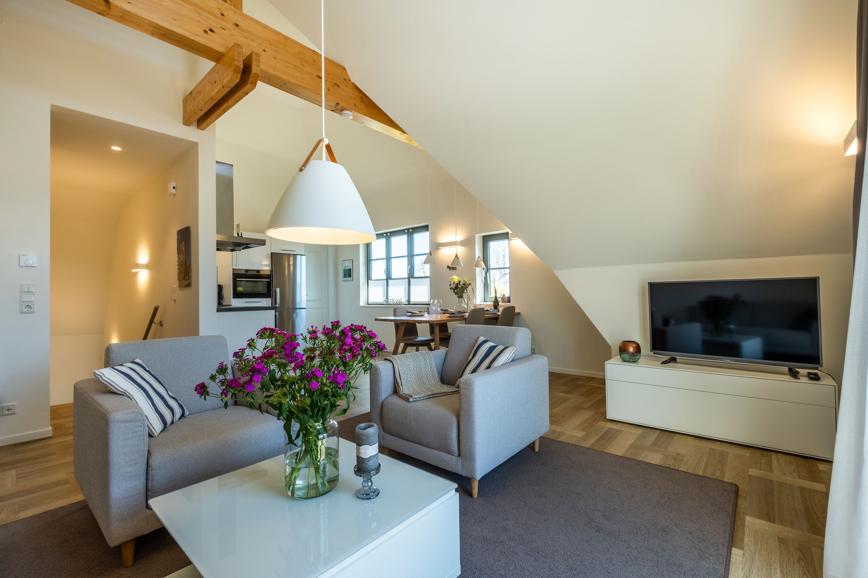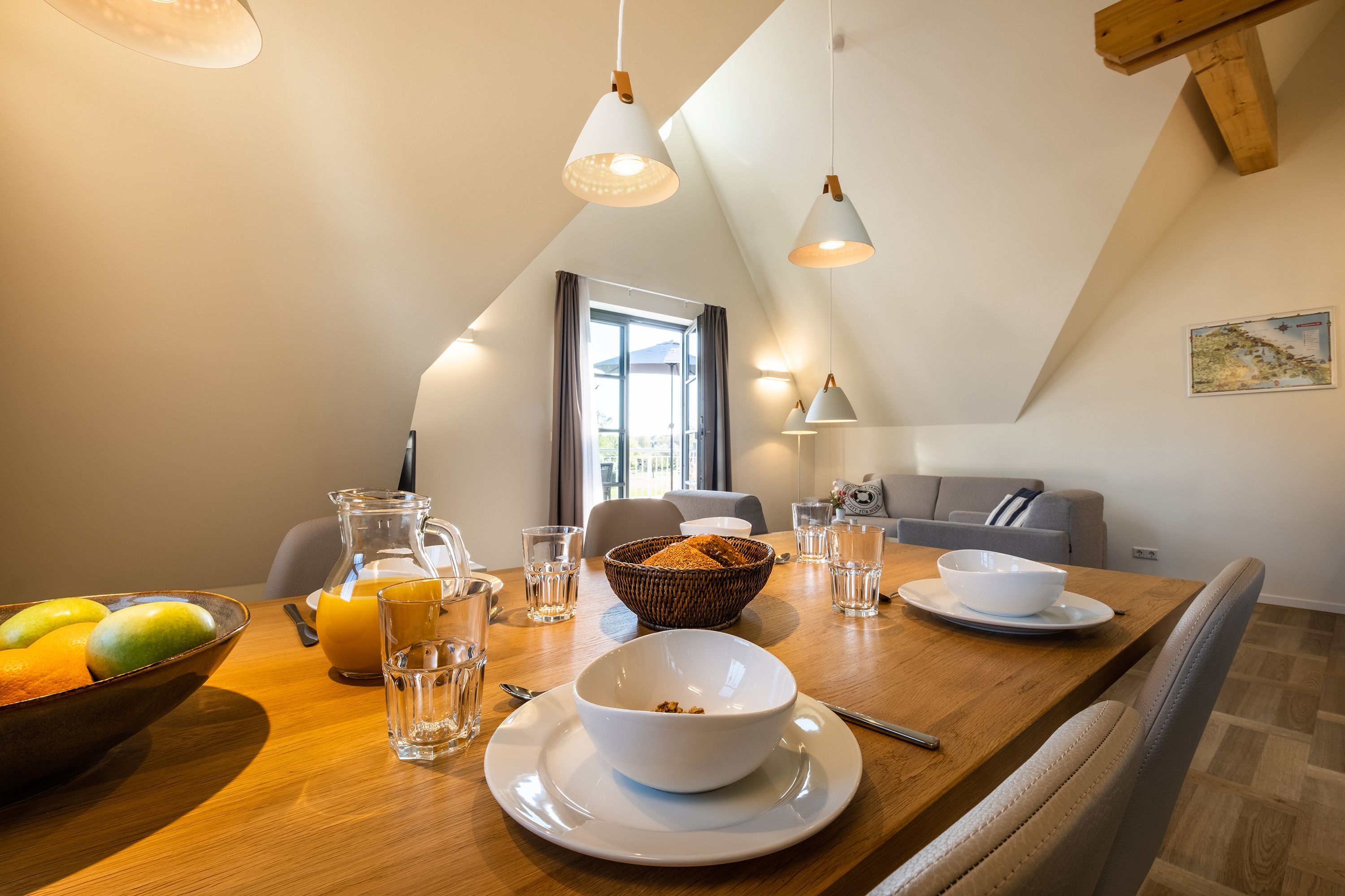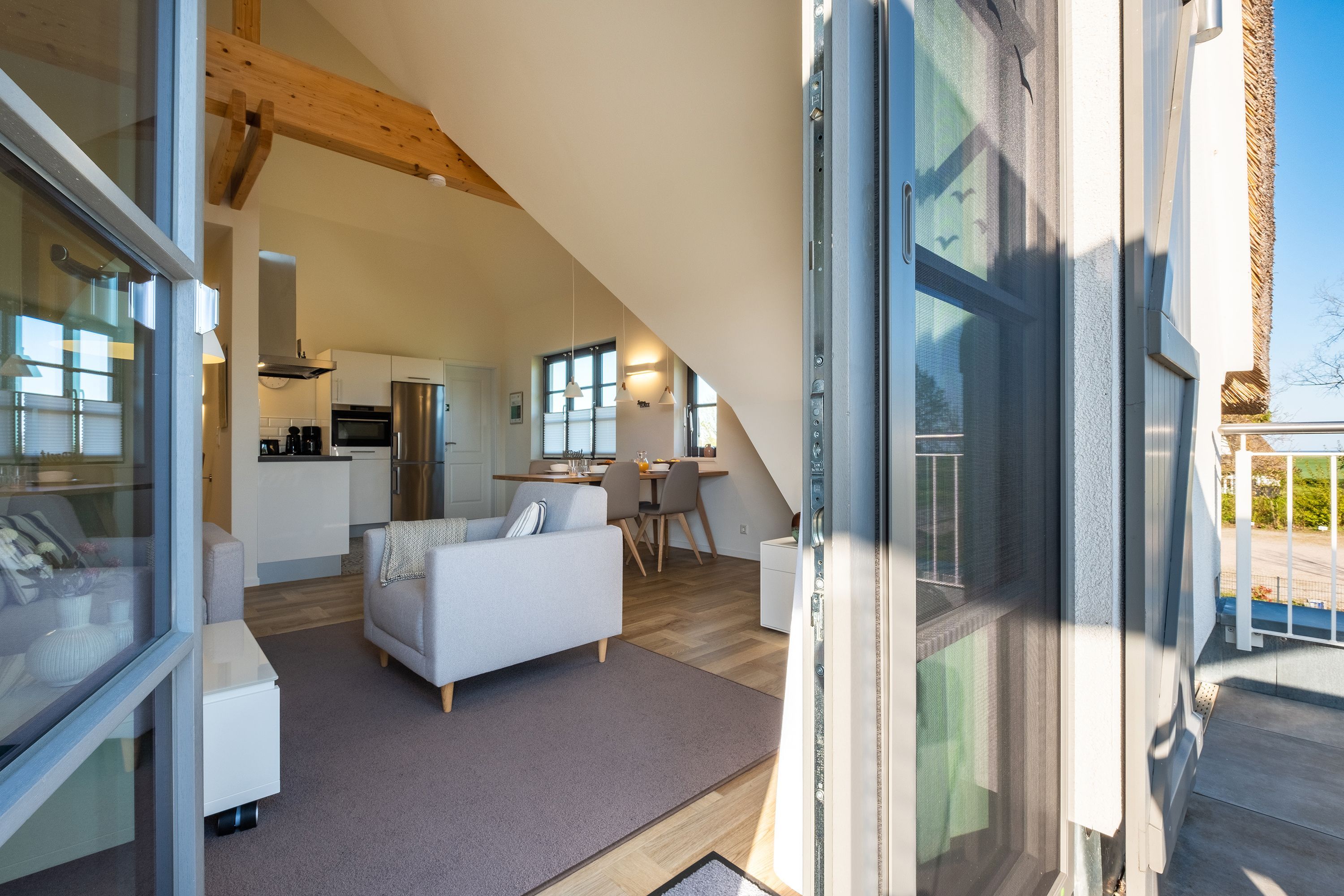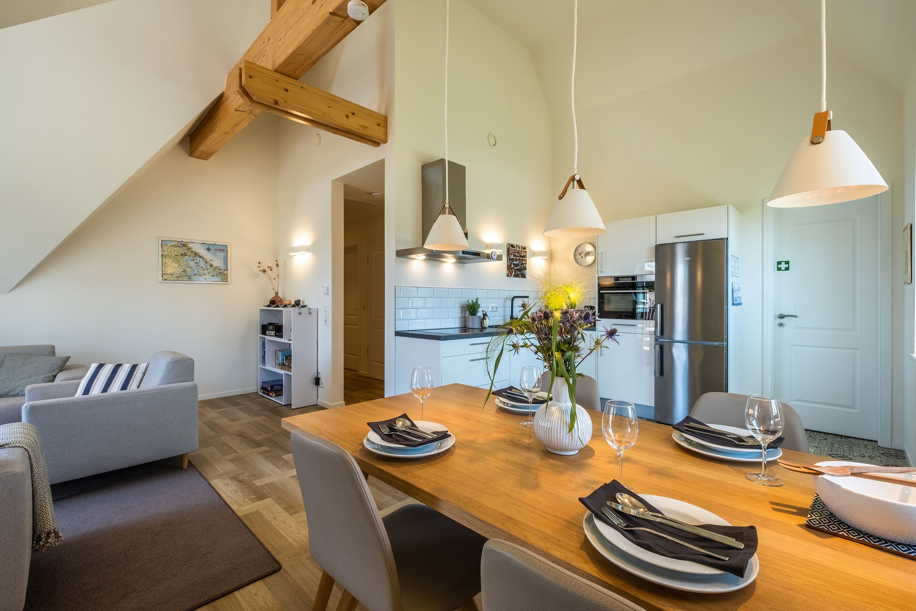 Die moderne und helle Ferienwohnung ist hochwertig ausgestattet. Sie verfügt über eine komplett eingerichtete Einbauküche mit Spülmaschine, Mikrowelle, Induktionsherd und großem Kühlraum mit separatem Gefrierabteil sowie Kaffeemaschine, Wasserkocher und Toaster. Ebenfalls verfügt die Wohnung über eine Waschmaschine. Der Wohnraum ist durch die ca. vier Meter hohe offene Decke geprägt und die fast 12m² große Dachterrasse bietet einen weiten Blick über die Felder, auf das Haff und Wasser. Das große Tageslichtbad ist mit einer bodentiefen Dusche mit Glasabtrennung ausgestattet. Das Hauptschlafzimmer verfügt über ein Doppelbett und das zweite Schlafzimmer über zwei Einzelbetten. Bei allen Betten handelt es sich um Boxspringbetten. Im Wohnzimmer, sowie in einem Schlafzimmer befinden sich jeweils ein Flachbildfernseher.