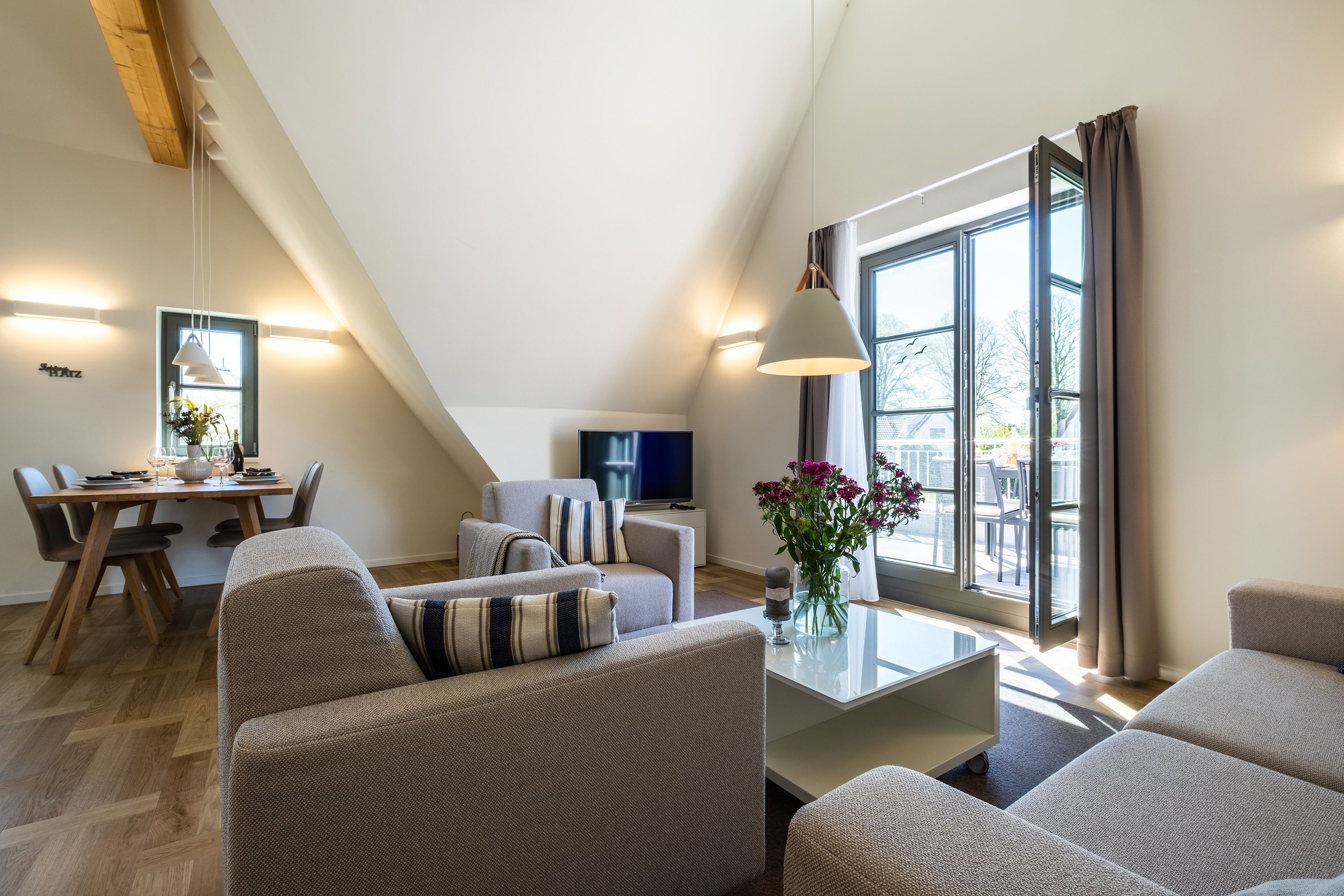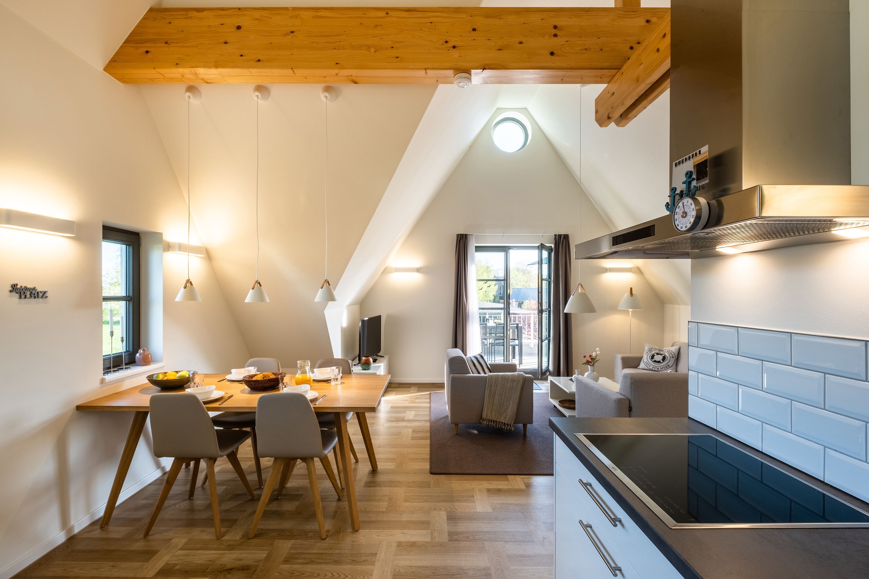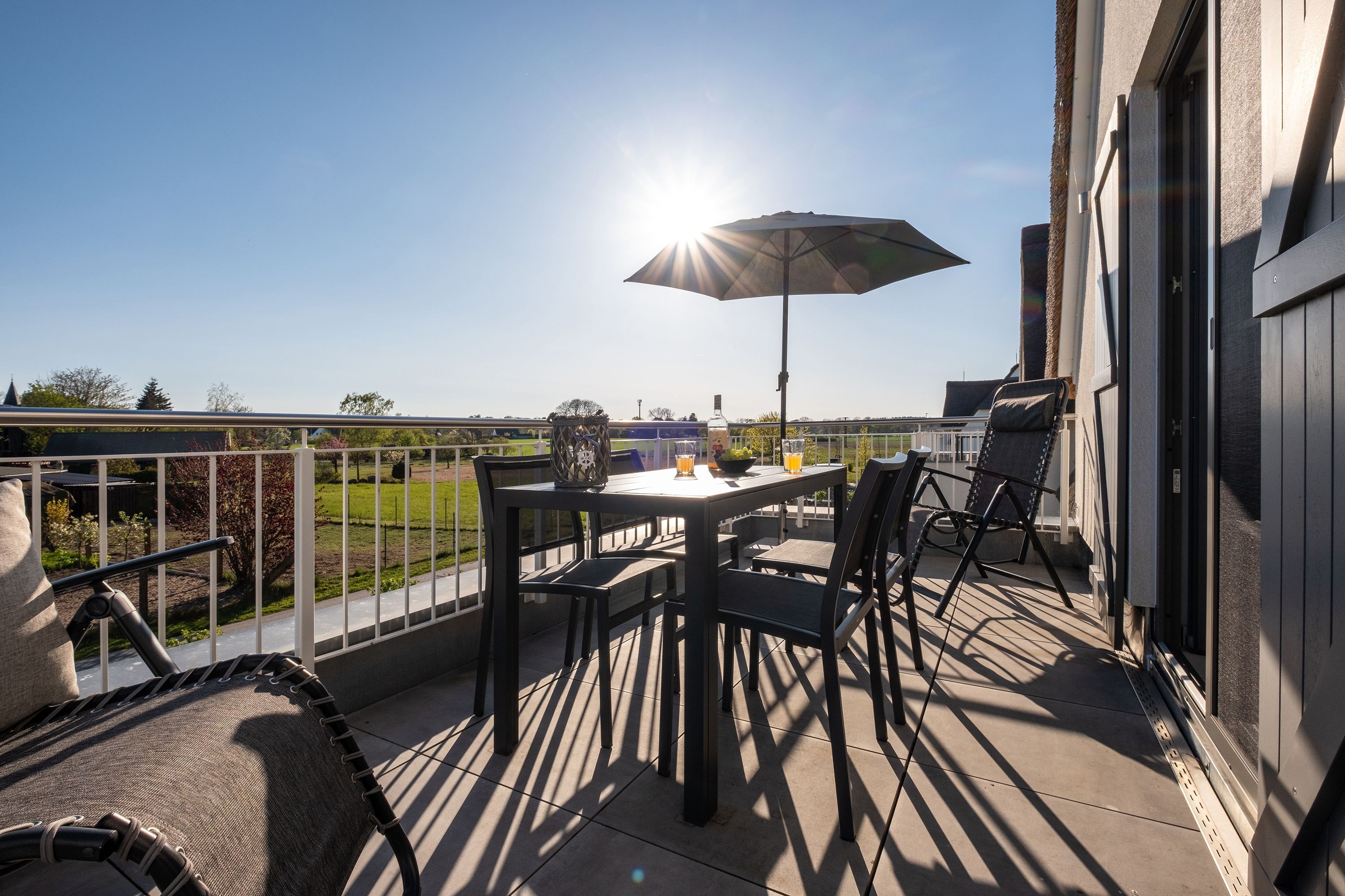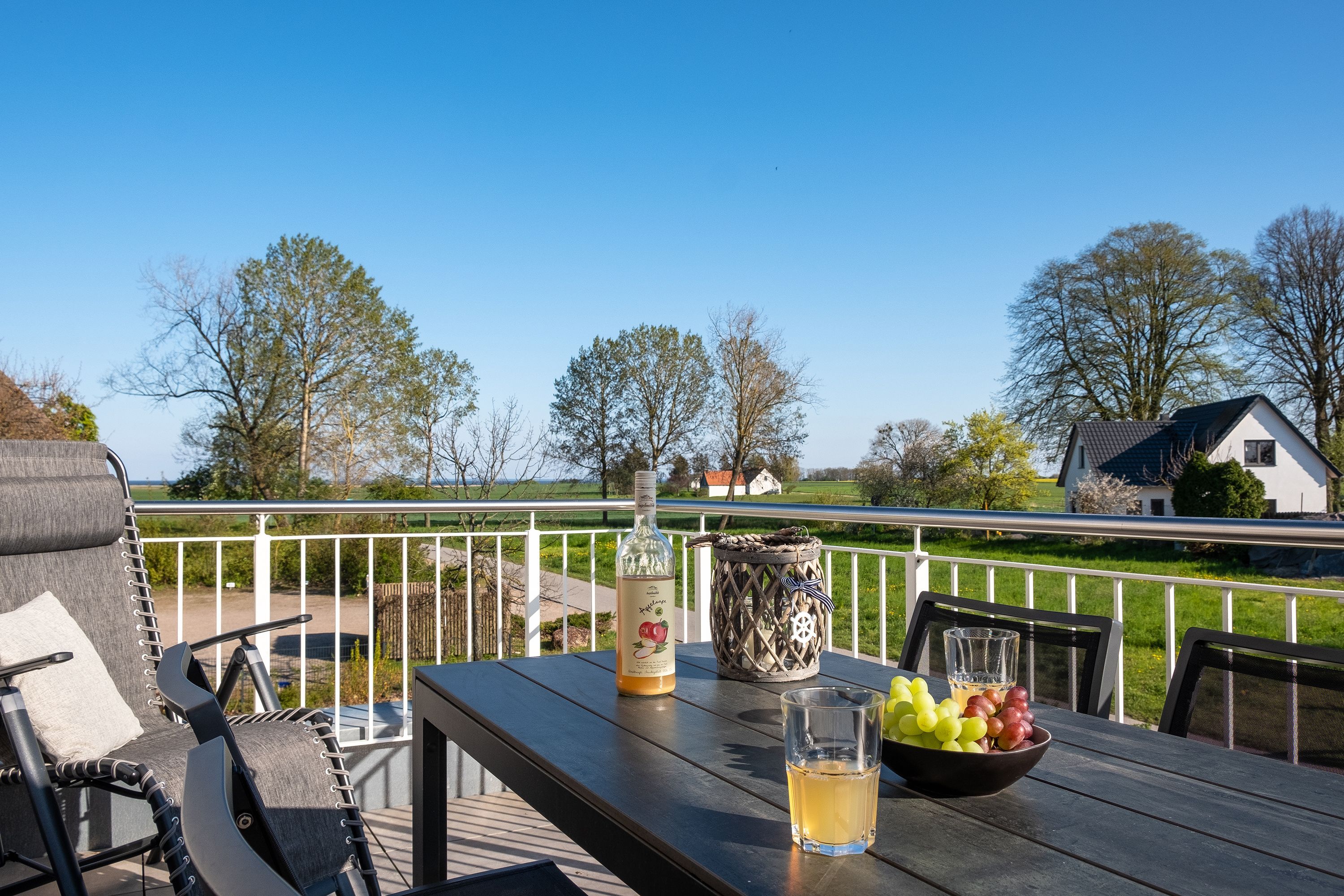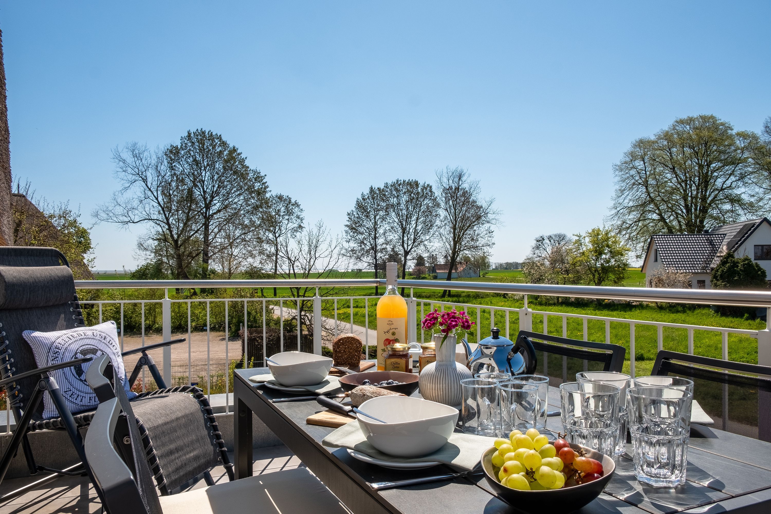 Die moderne und helle Ferienwohnung ist hochwertig ausgestattet. Sie verfügt über eine komplett eingerichtete Einbauküche mit Spülmaschine, Mikrowelle, Induktionsherd und großem Kühlraum mit separatem Gefrierabteil sowie Kaffeemaschine, Wasserkocher und Toaster. Ebenfalls verfügt die Wohnung über eine Waschmaschine. Der Wohnraum ist durch die ca. vier Meter hohe offene Decke geprägt und die fast 12m² große Dachterrasse bietet einen weiten Blick über die Felder, auf das Haff und Wasser. Das große Tageslichtbad ist mit einer bodentiefen Dusche mit Glasabtrennung ausgestattet. Das Hauptschlafzimmer verfügt über ein Doppelbett und das zweite Schlafzimmer über zwei Einzelbetten. Bei allen Betten handelt es sich um Boxspringbetten. Im Wohnzimmer, sowie in einem Schlafzimmer befinden sich jeweils ein Flachbildfernseher.