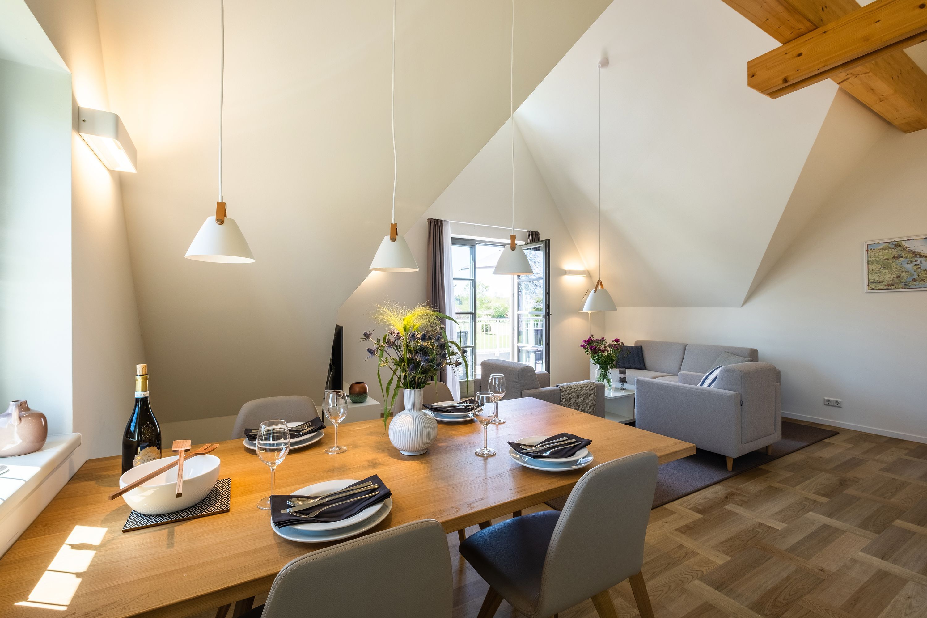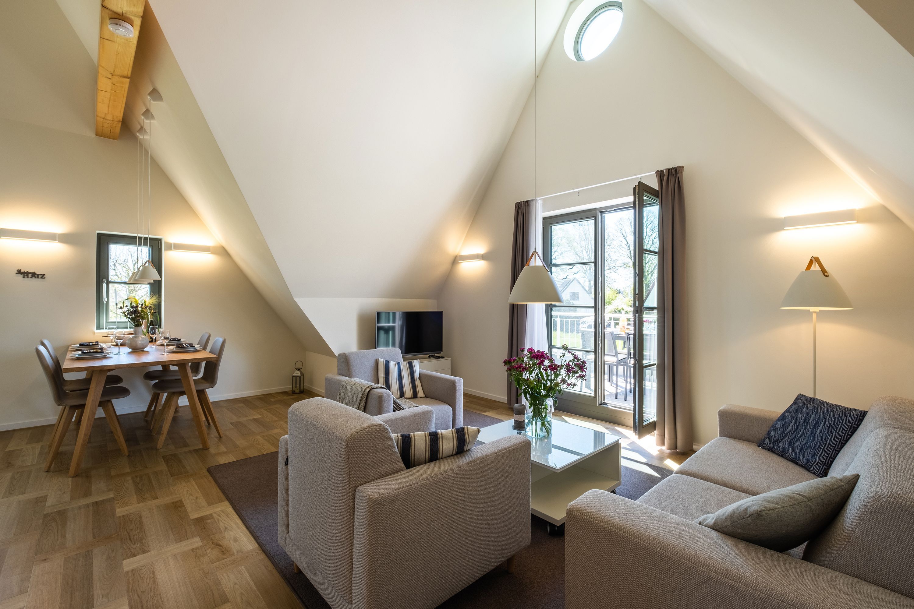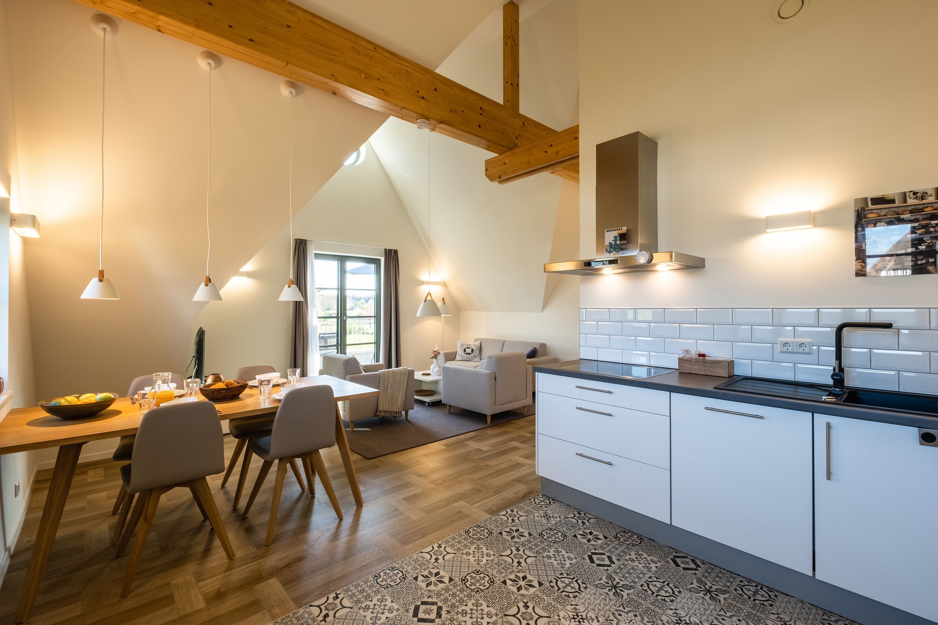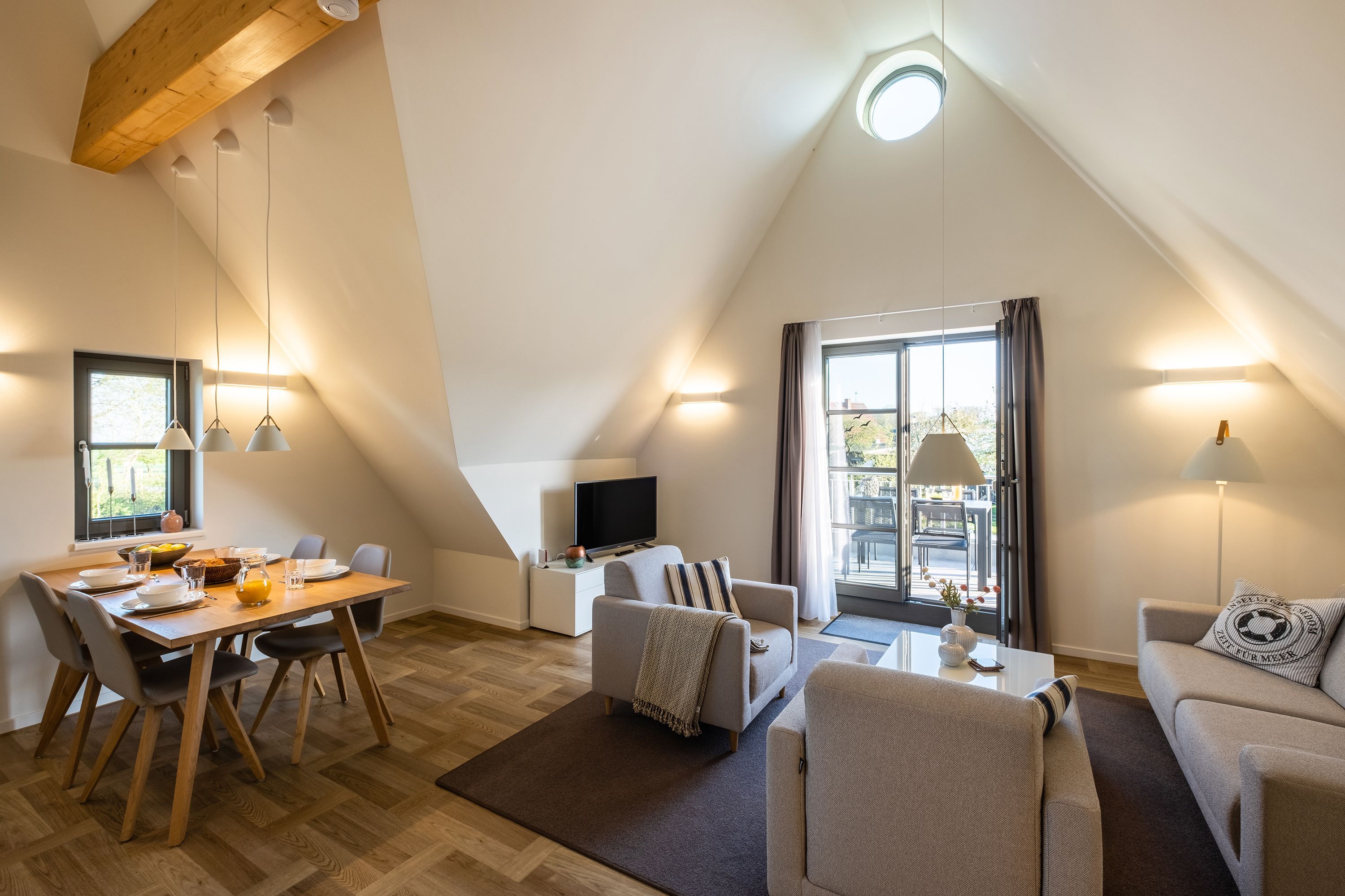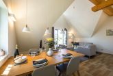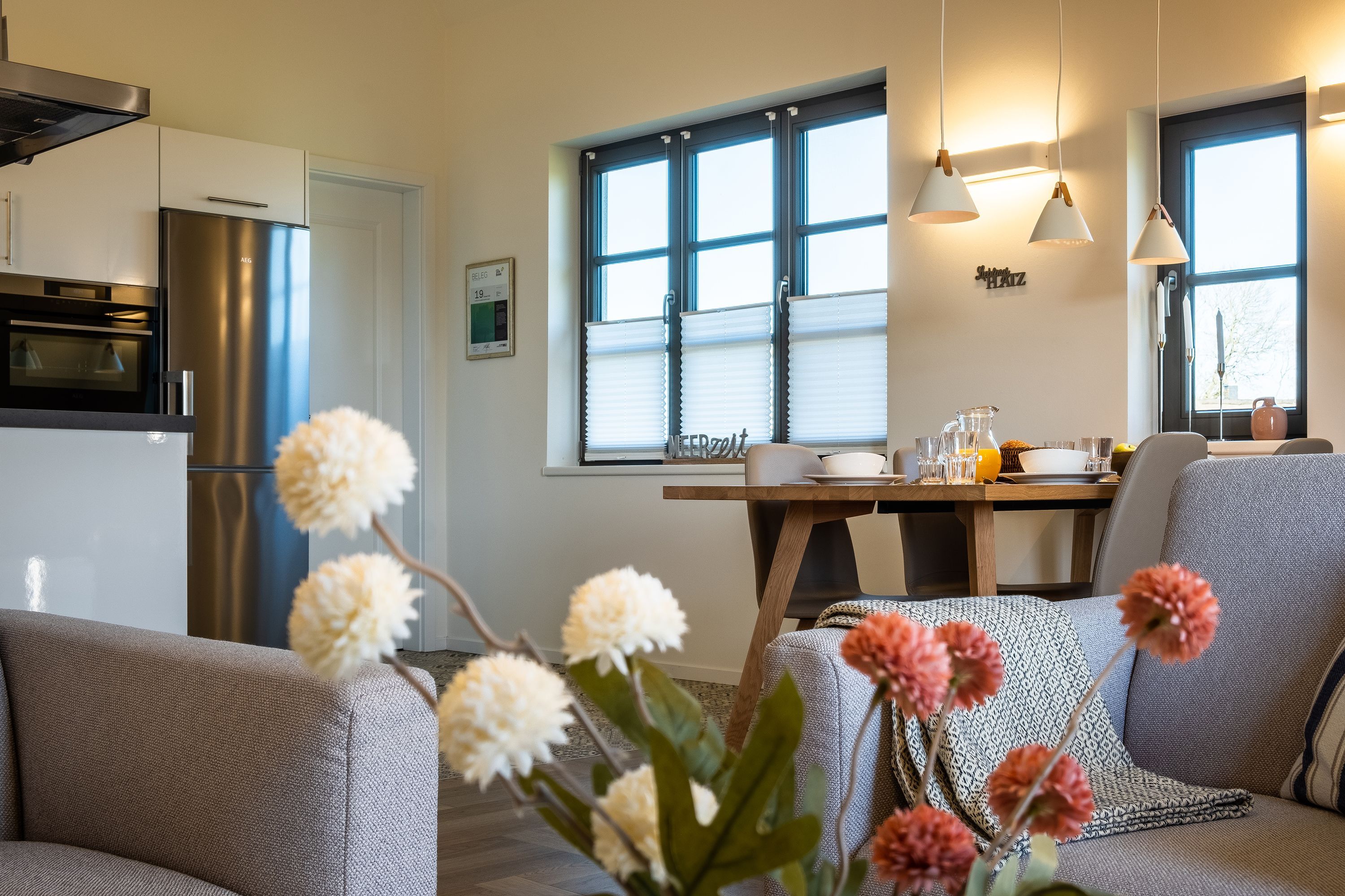 Die moderne und helle Ferienwohnung ist hochwertig ausgestattet. Sie verfügt über eine komplett eingerichtete Einbauküche mit Spülmaschine, Mikrowelle, Induktionsherd und großem Kühlraum mit separatem Gefrierabteil sowie Kaffeemaschine, Wasserkocher und Toaster. Ebenfalls verfügt die Wohnung über eine Waschmaschine. Der Wohnraum ist durch die ca. vier Meter hohe offene Decke geprägt und die fast 12m² große Dachterrasse bietet einen weiten Blick über die Felder, auf das Haff und Wasser. Das große Tageslichtbad ist mit einer bodentiefen Dusche mit Glasabtrennung ausgestattet. Das Hauptschlafzimmer verfügt über ein Doppelbett und das zweite Schlafzimmer über zwei Einzelbetten. Bei allen Betten handelt es sich um Boxspringbetten. Im Wohnzimmer, sowie in einem Schlafzimmer befinden sich jeweils ein Flachbildfernseher.
