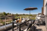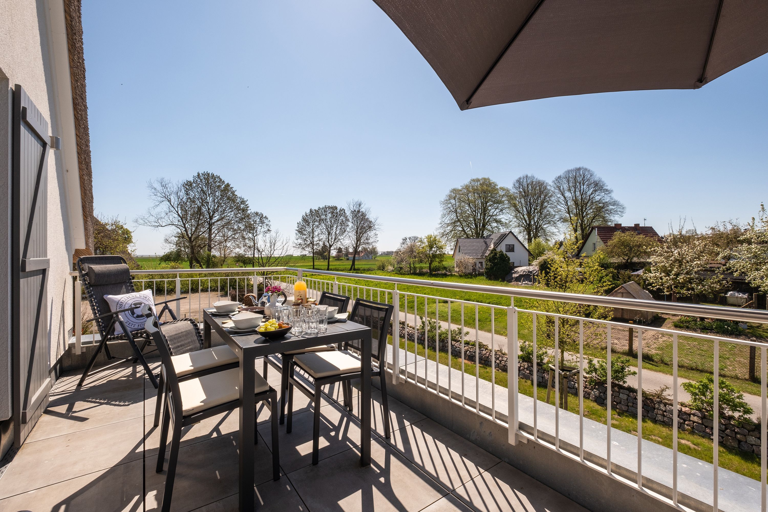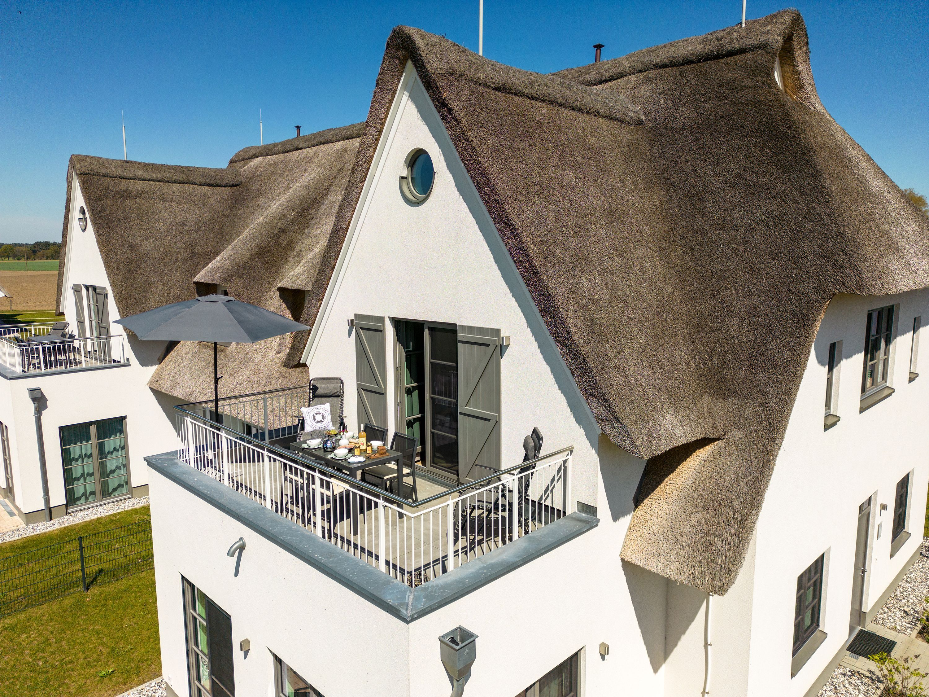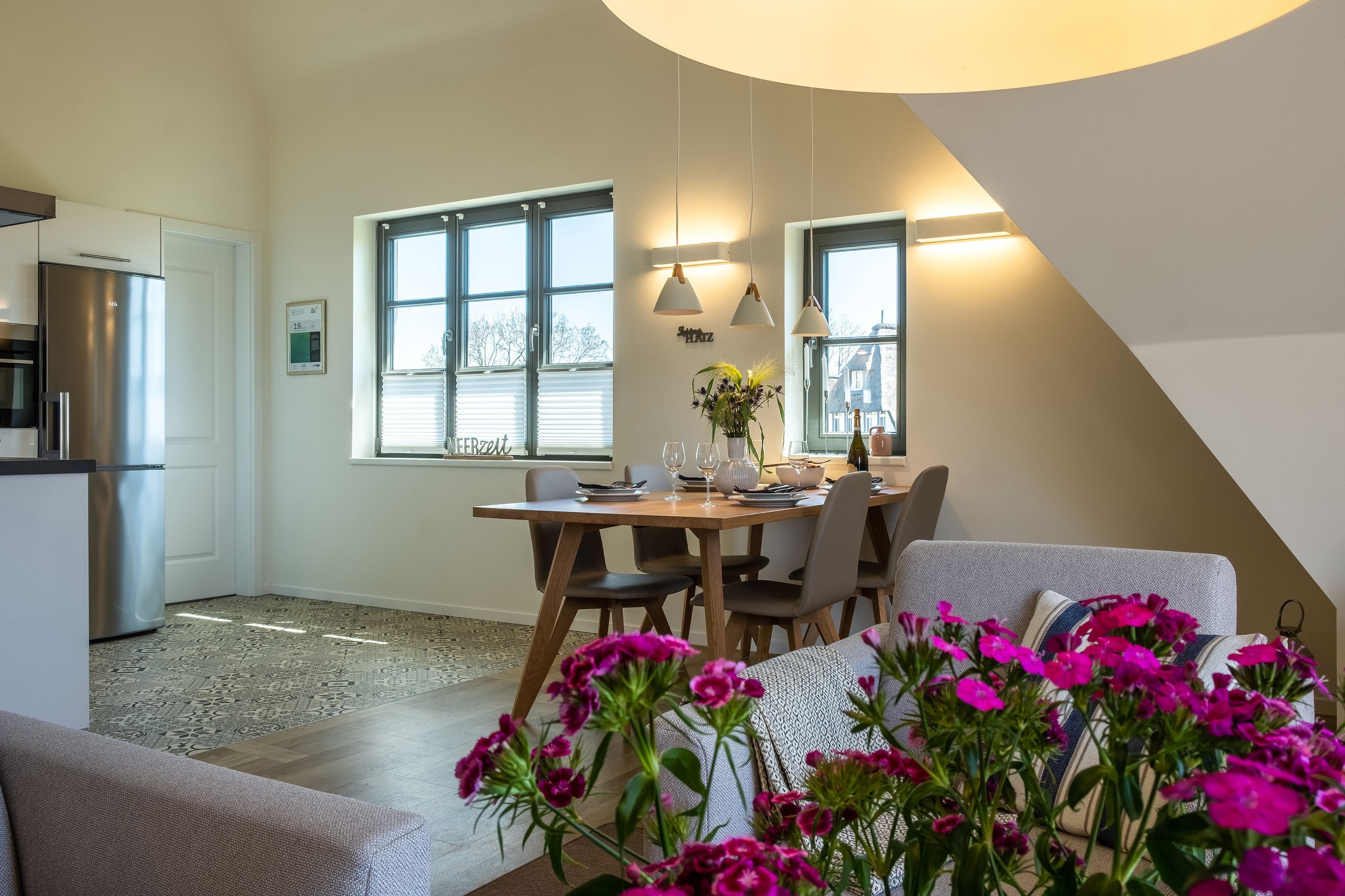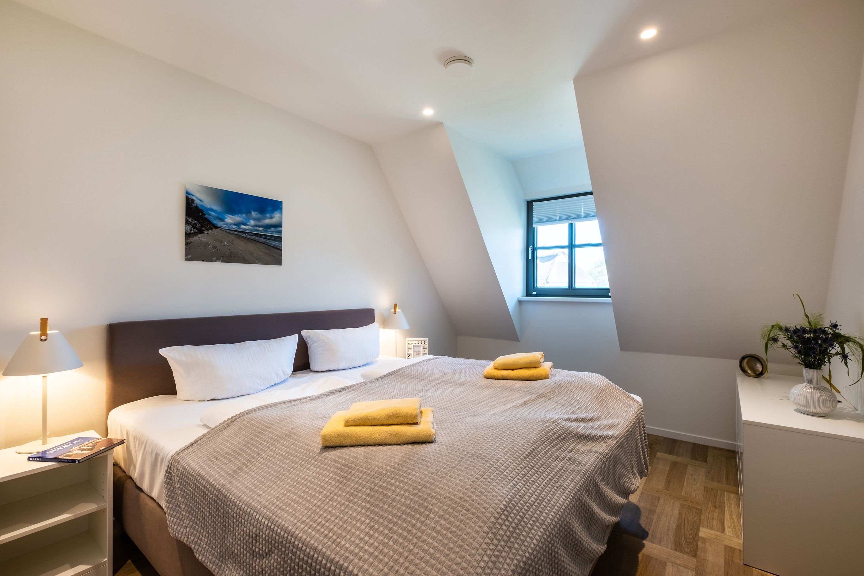 Die moderne und helle Ferienwohnung ist hochwertig ausgestattet. Sie verfügt über eine komplett eingerichtete Einbauküche mit Spülmaschine, Mikrowelle, Induktionsherd und großem Kühlraum mit separatem Gefrierabteil sowie Kaffeemaschine, Wasserkocher und Toaster. Ebenfalls verfügt die Wohnung über eine Waschmaschine. Der Wohnraum ist durch die ca. vier Meter hohe offene Decke geprägt und die fast 12m² große Dachterrasse bietet einen weiten Blick über die Felder, auf das Haff und Wasser. Das große Tageslichtbad ist mit einer bodentiefen Dusche mit Glasabtrennung ausgestattet. Das Hauptschlafzimmer verfügt über ein Doppelbett und das zweite Schlafzimmer über zwei Einzelbetten. Bei allen Betten handelt es sich um Boxspringbetten. Im Wohnzimmer, sowie in einem Schlafzimmer befinden sich jeweils ein Flachbildfernseher.