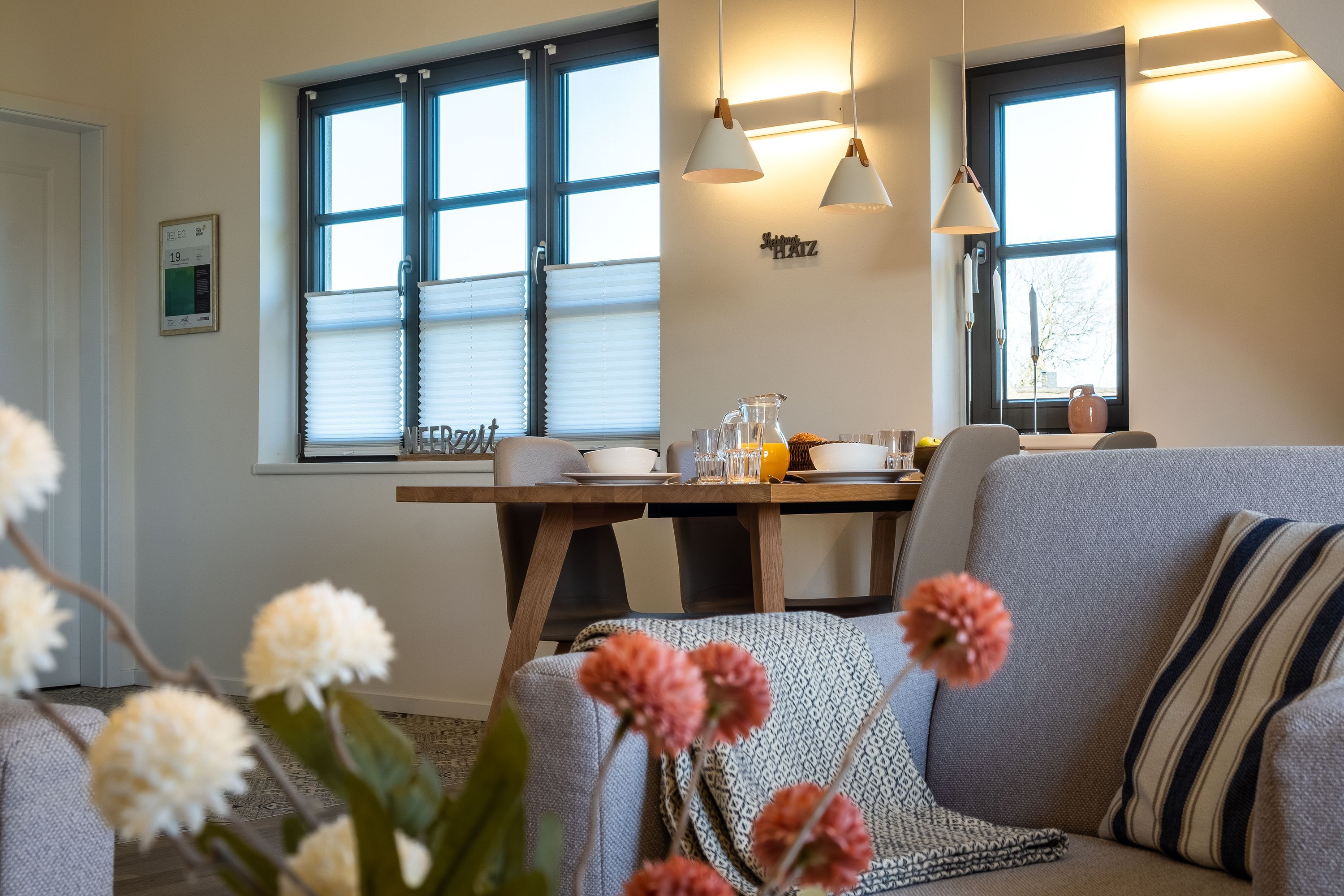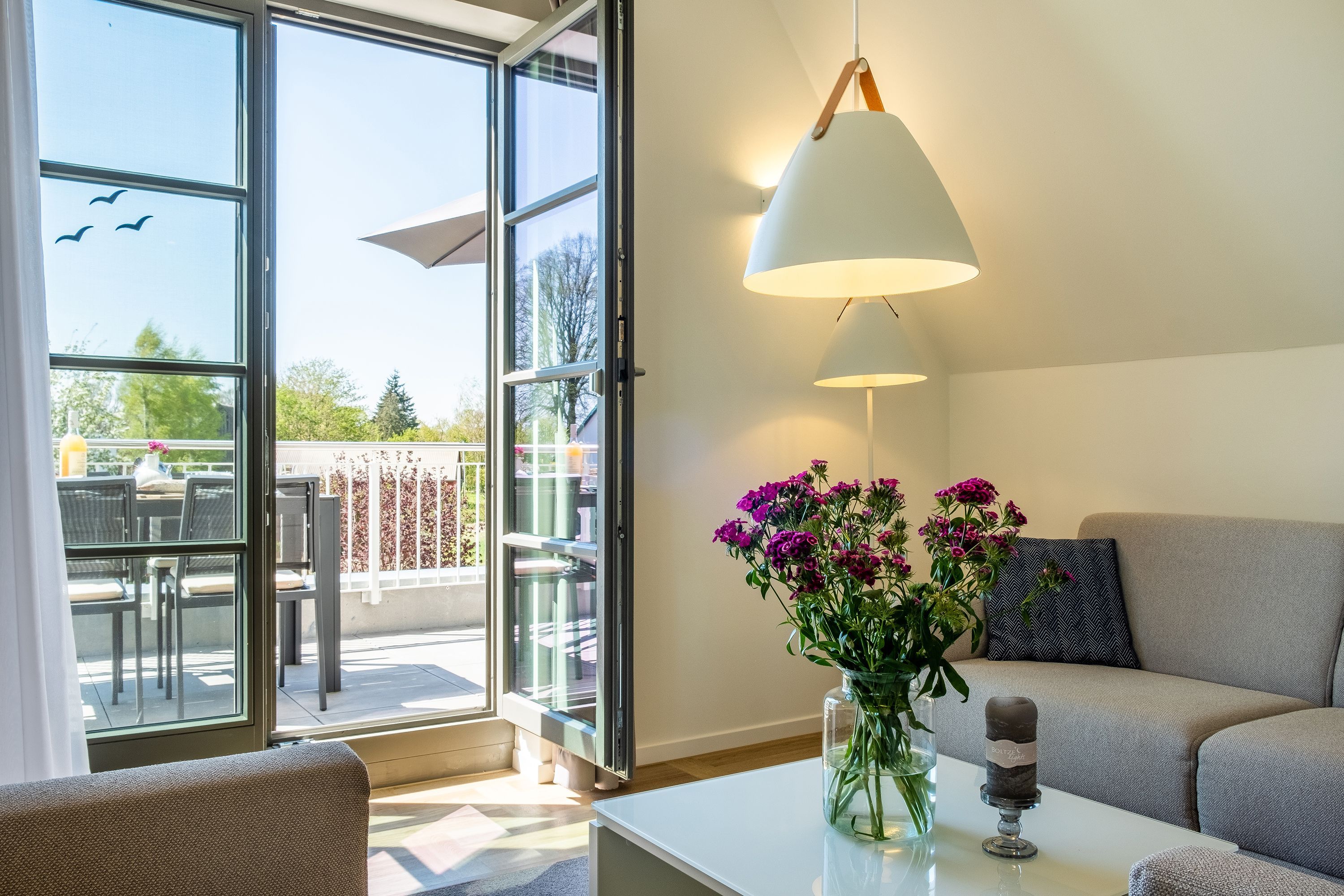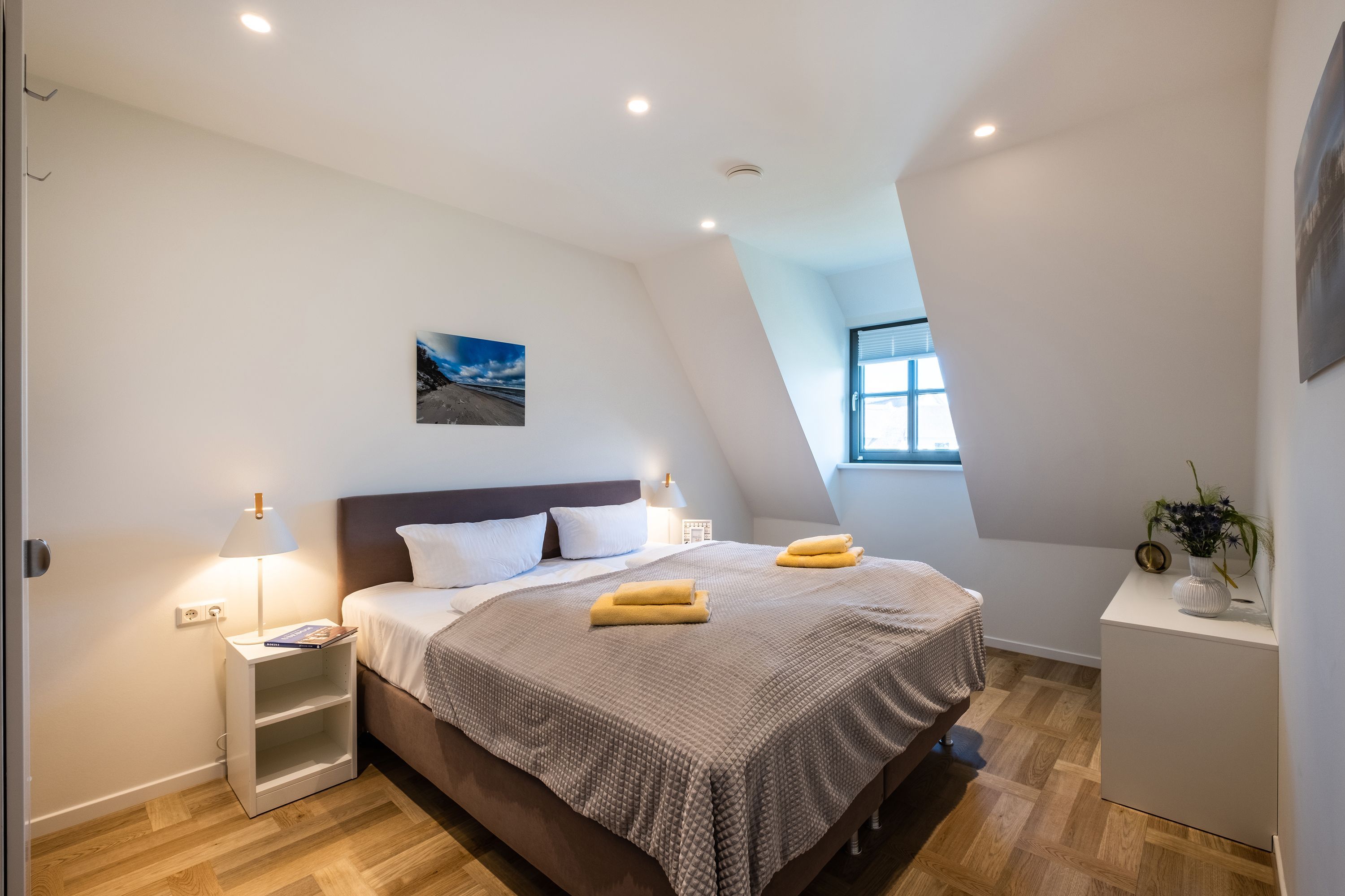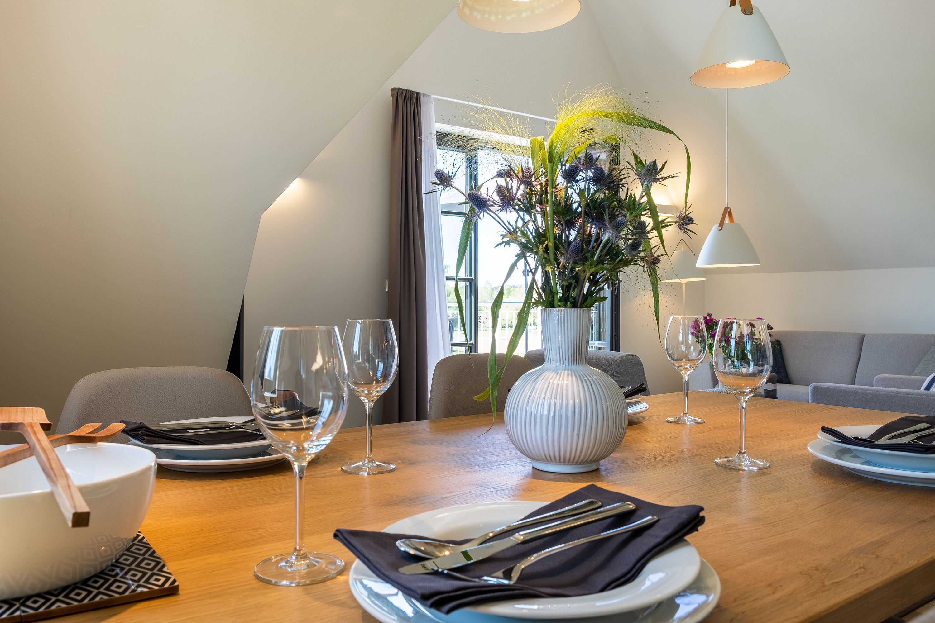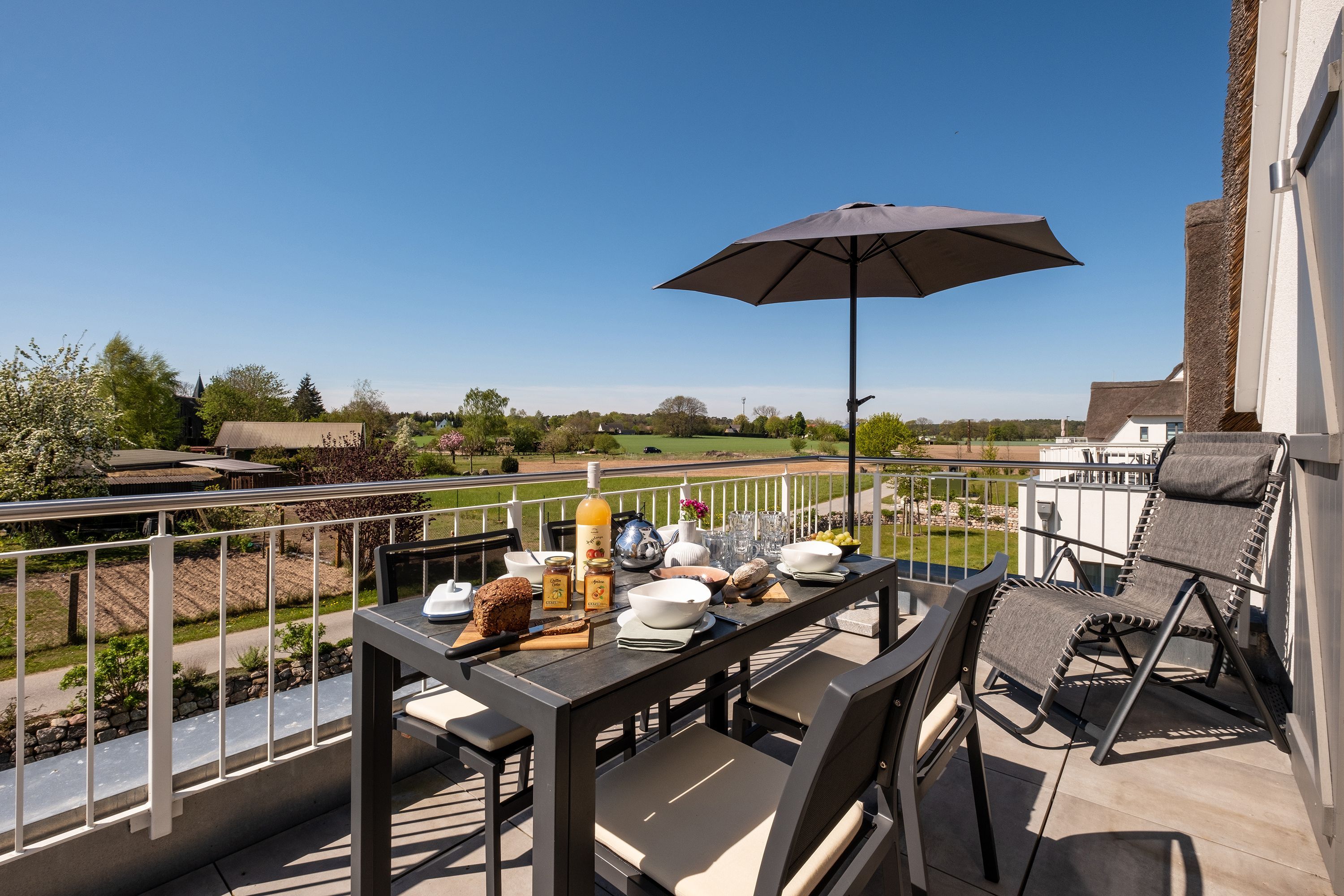 Die moderne und helle Ferienwohnung ist hochwertig ausgestattet. Sie verfügt über eine komplett eingerichtete Einbauküche mit Spülmaschine, Mikrowelle, Induktionsherd und großem Kühlraum mit separatem Gefrierabteil sowie Kaffeemaschine, Wasserkocher und Toaster. Ebenfalls verfügt die Wohnung über eine Waschmaschine. Der Wohnraum ist durch die ca. vier Meter hohe offene Decke geprägt und die fast 12m² große Dachterrasse bietet einen weiten Blick über die Felder, auf das Haff und Wasser. Das große Tageslichtbad ist mit einer bodentiefen Dusche mit Glasabtrennung ausgestattet. Das Hauptschlafzimmer verfügt über ein Doppelbett und das zweite Schlafzimmer über zwei Einzelbetten. Bei allen Betten handelt es sich um Boxspringbetten. Im Wohnzimmer, sowie in einem Schlafzimmer befinden sich jeweils ein Flachbildfernseher.