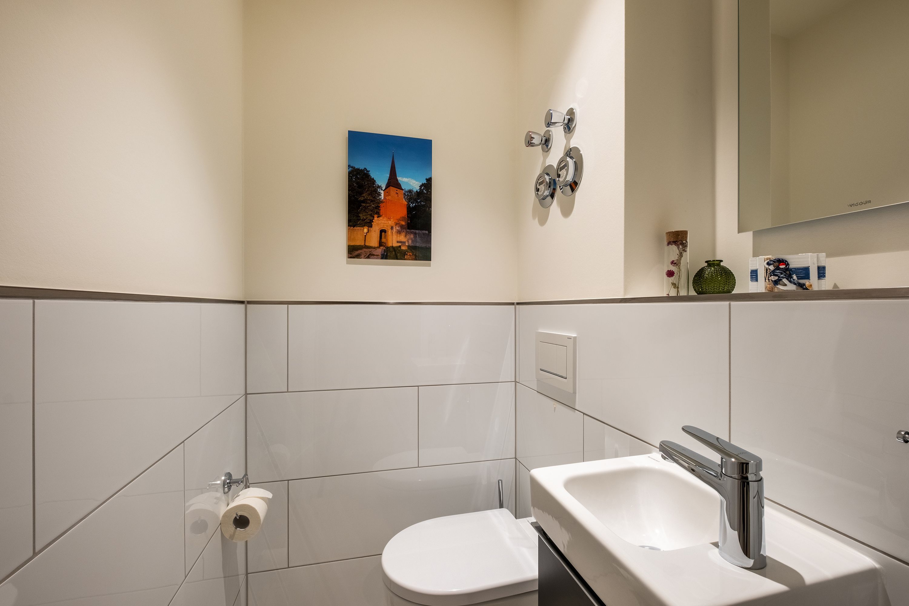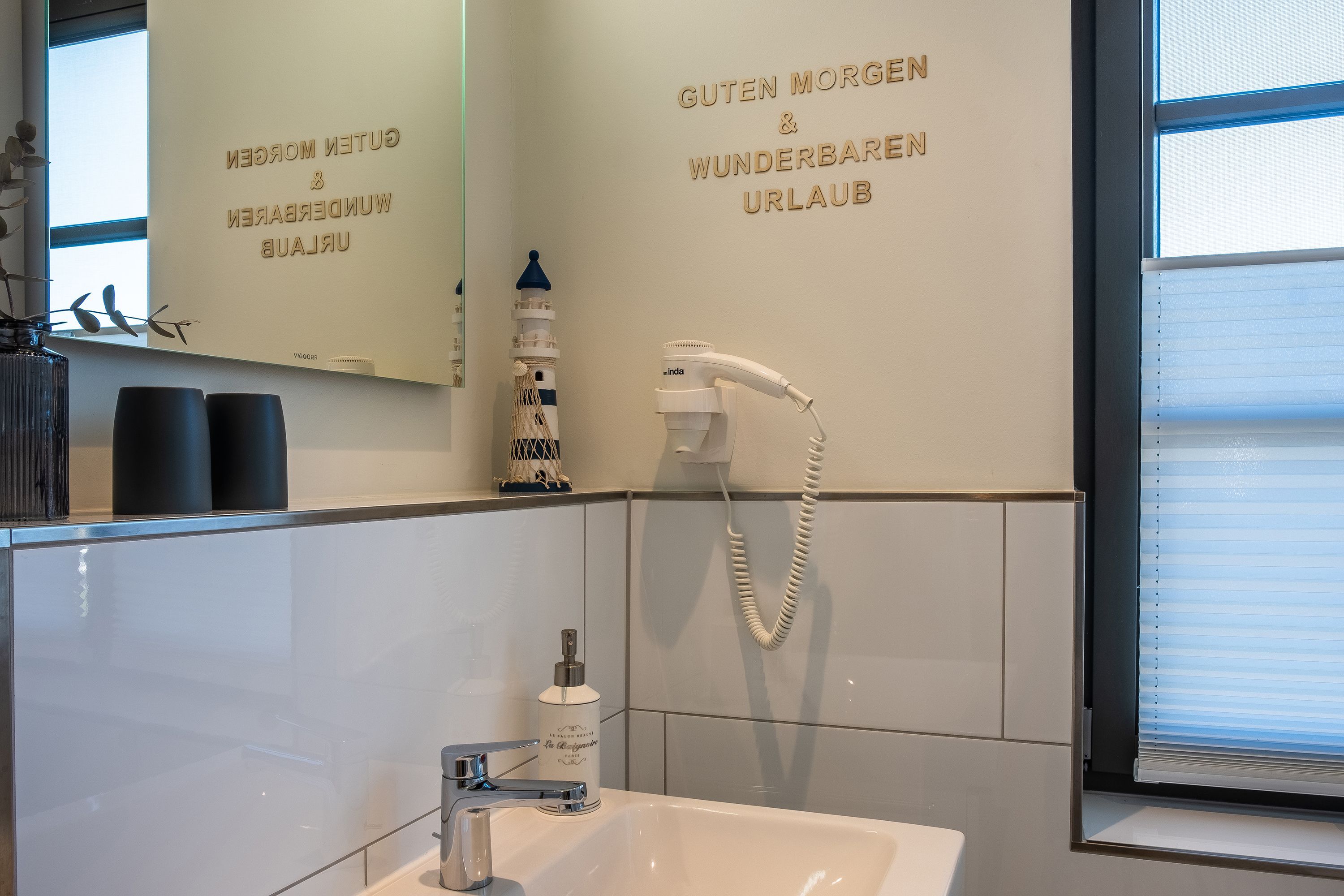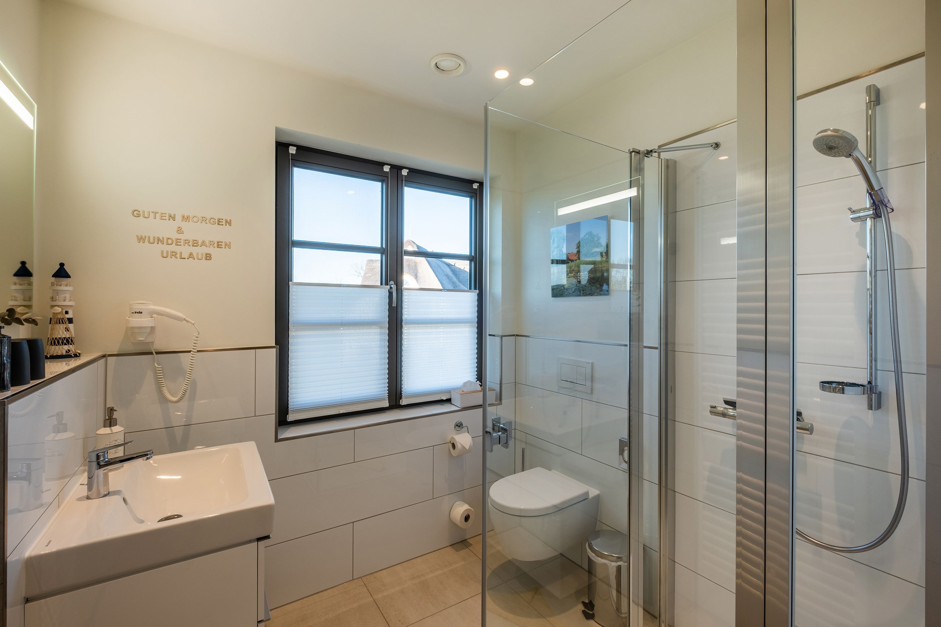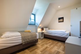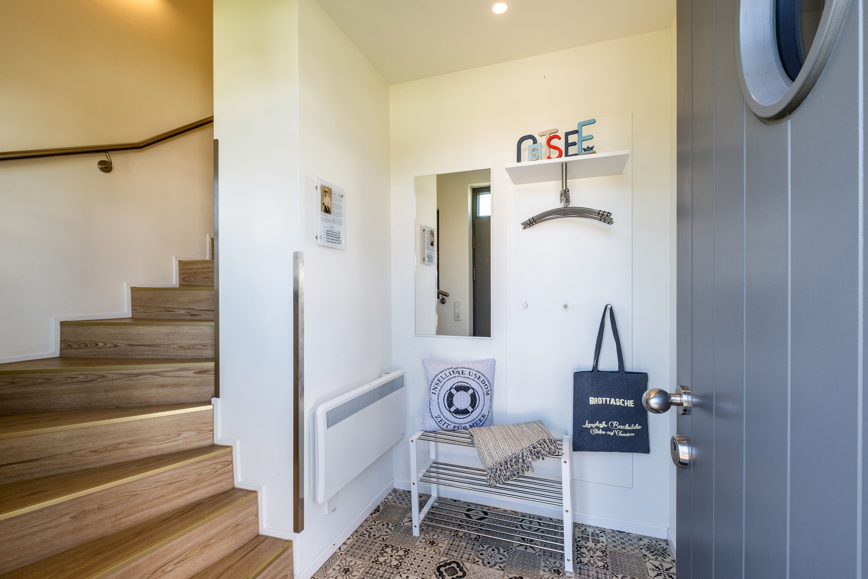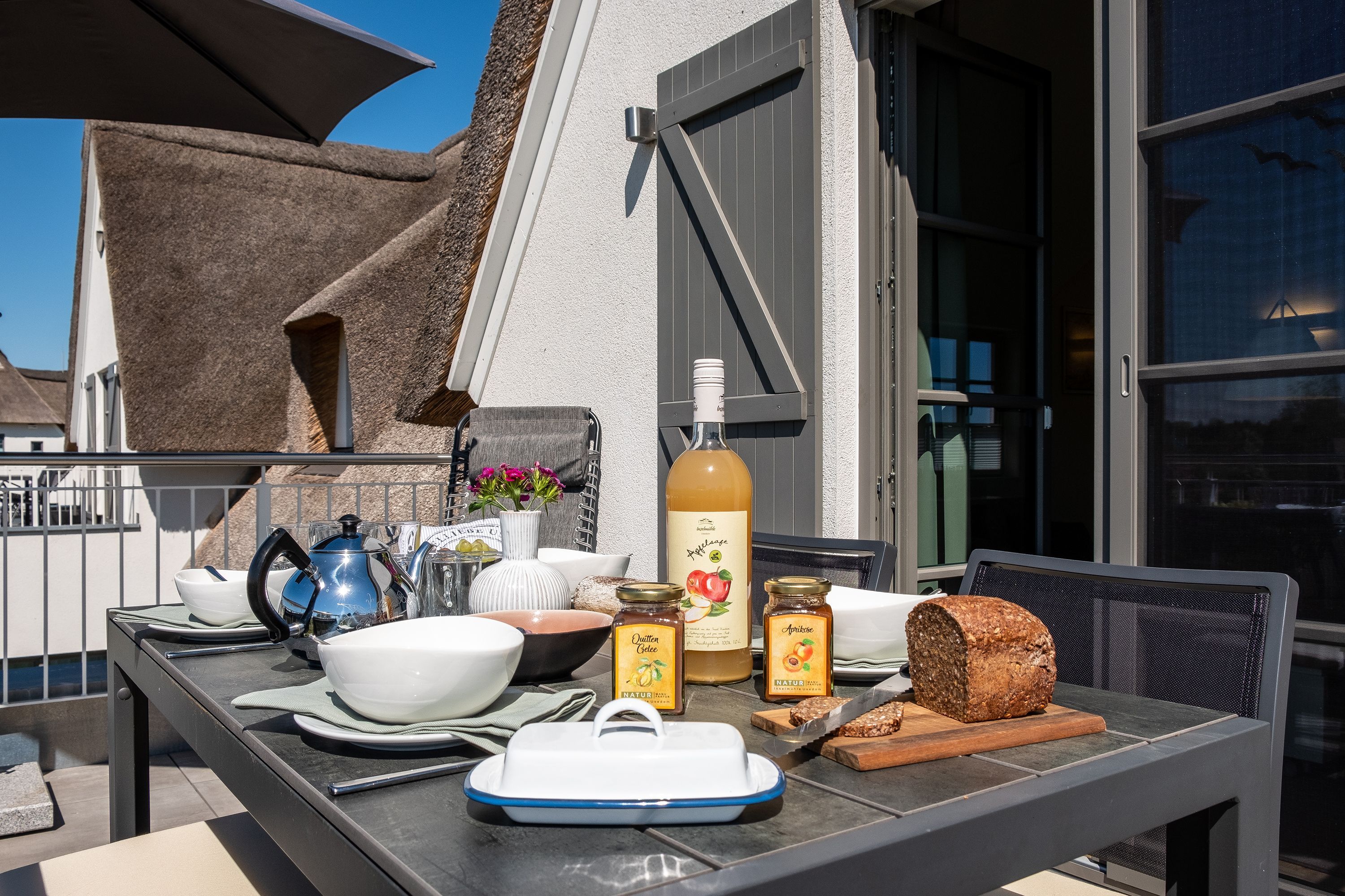 Die moderne und helle Ferienwohnung ist hochwertig ausgestattet. Sie verfügt über eine komplett eingerichtete Einbauküche mit Spülmaschine, Mikrowelle, Induktionsherd und großem Kühlraum mit separatem Gefrierabteil sowie Kaffeemaschine, Wasserkocher und Toaster. Ebenfalls verfügt die Wohnung über eine Waschmaschine. Der Wohnraum ist durch die ca. vier Meter hohe offene Decke geprägt und die fast 12m² große Dachterrasse bietet einen weiten Blick über die Felder, auf das Haff und Wasser. Das große Tageslichtbad ist mit einer bodentiefen Dusche mit Glasabtrennung ausgestattet. Das Hauptschlafzimmer verfügt über ein Doppelbett und das zweite Schlafzimmer über zwei Einzelbetten. Bei allen Betten handelt es sich um Boxspringbetten. Im Wohnzimmer, sowie in einem Schlafzimmer befinden sich jeweils ein Flachbildfernseher.
