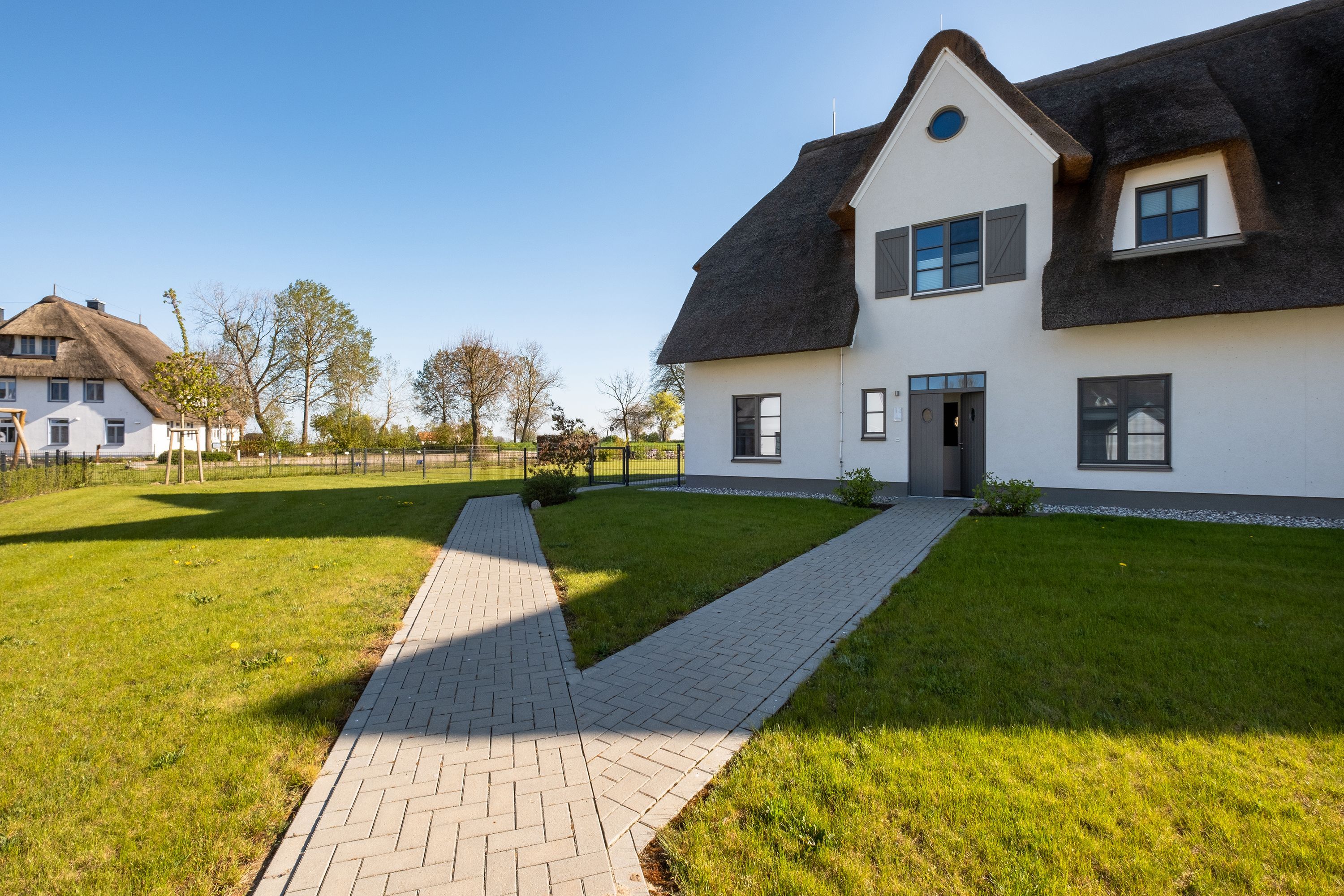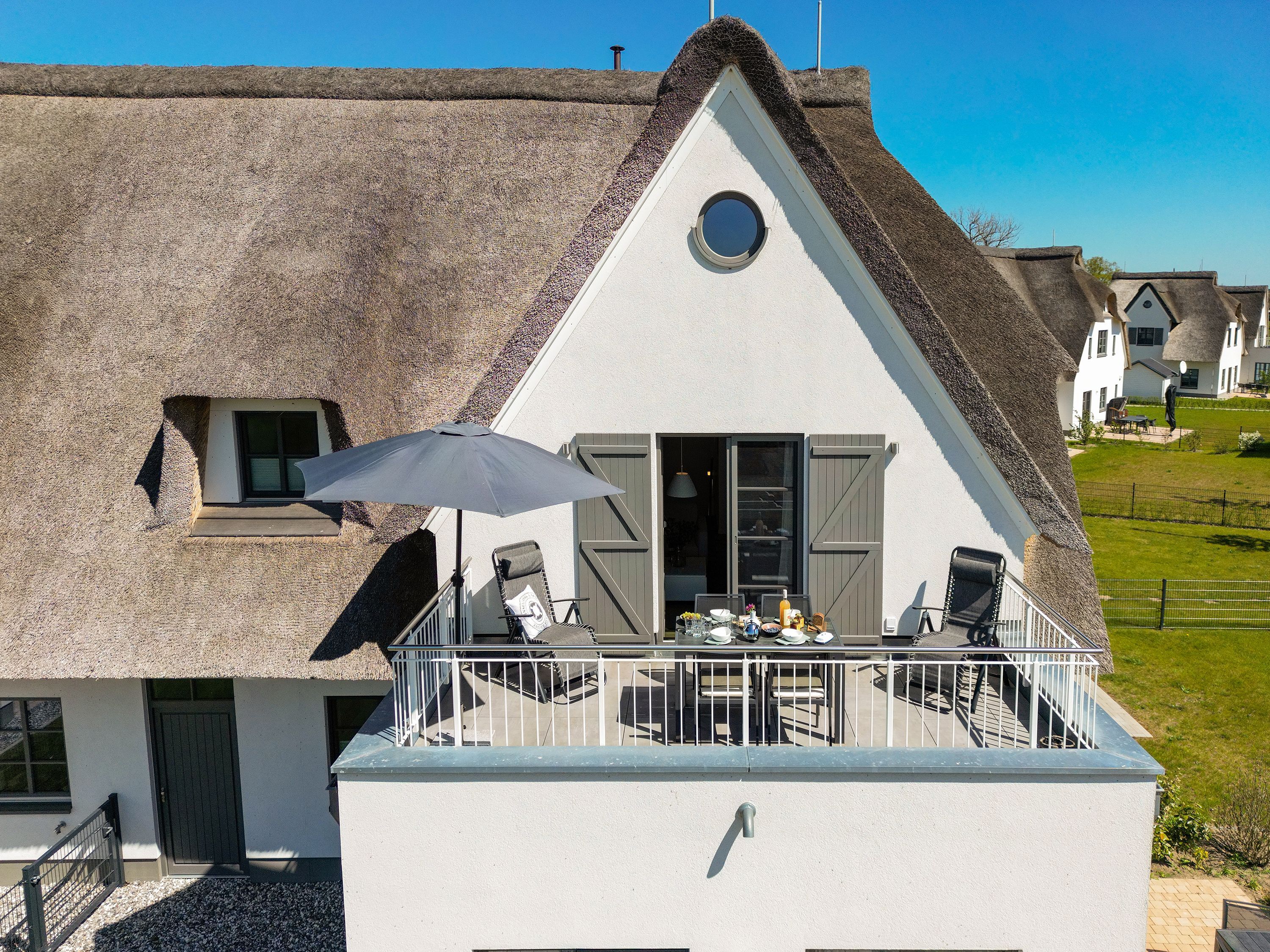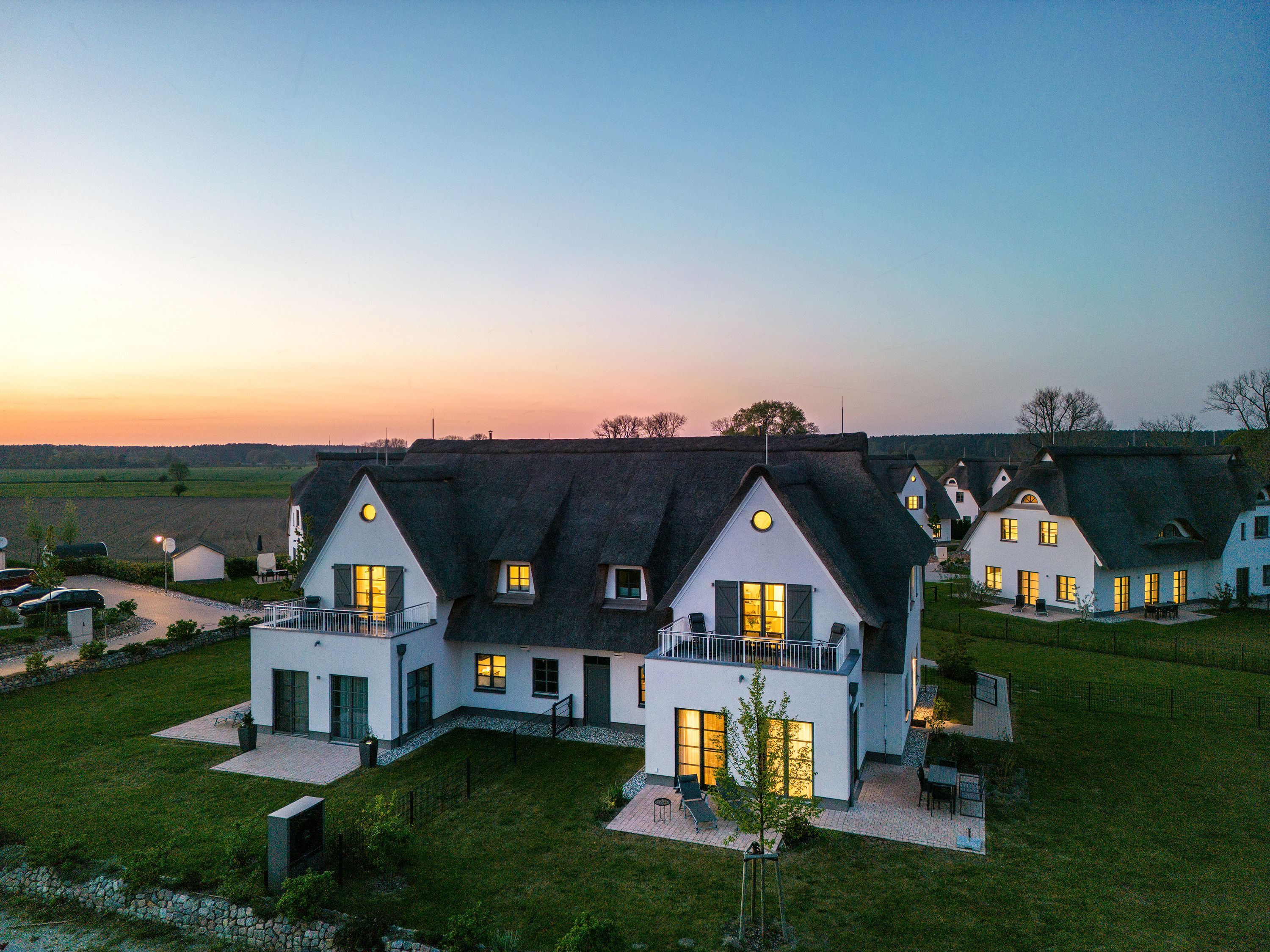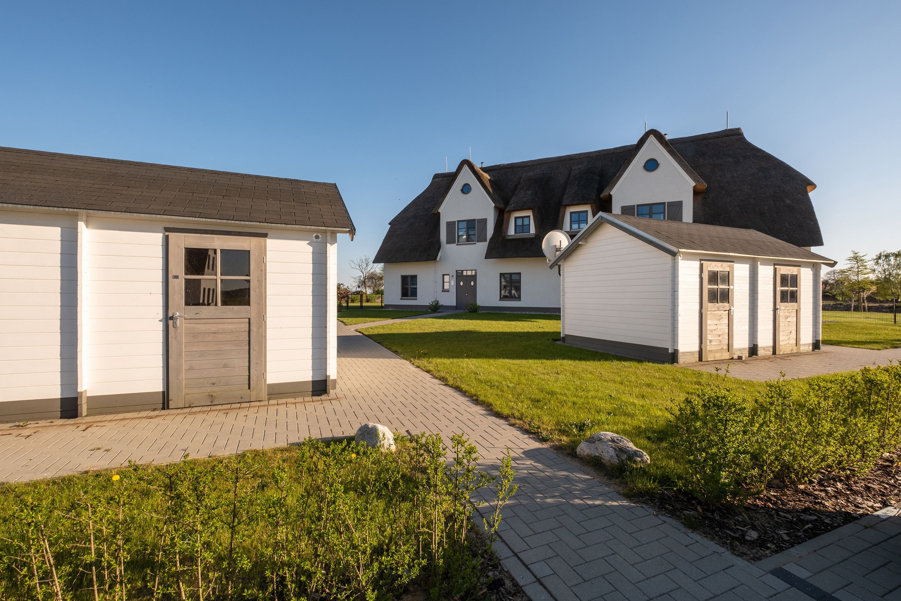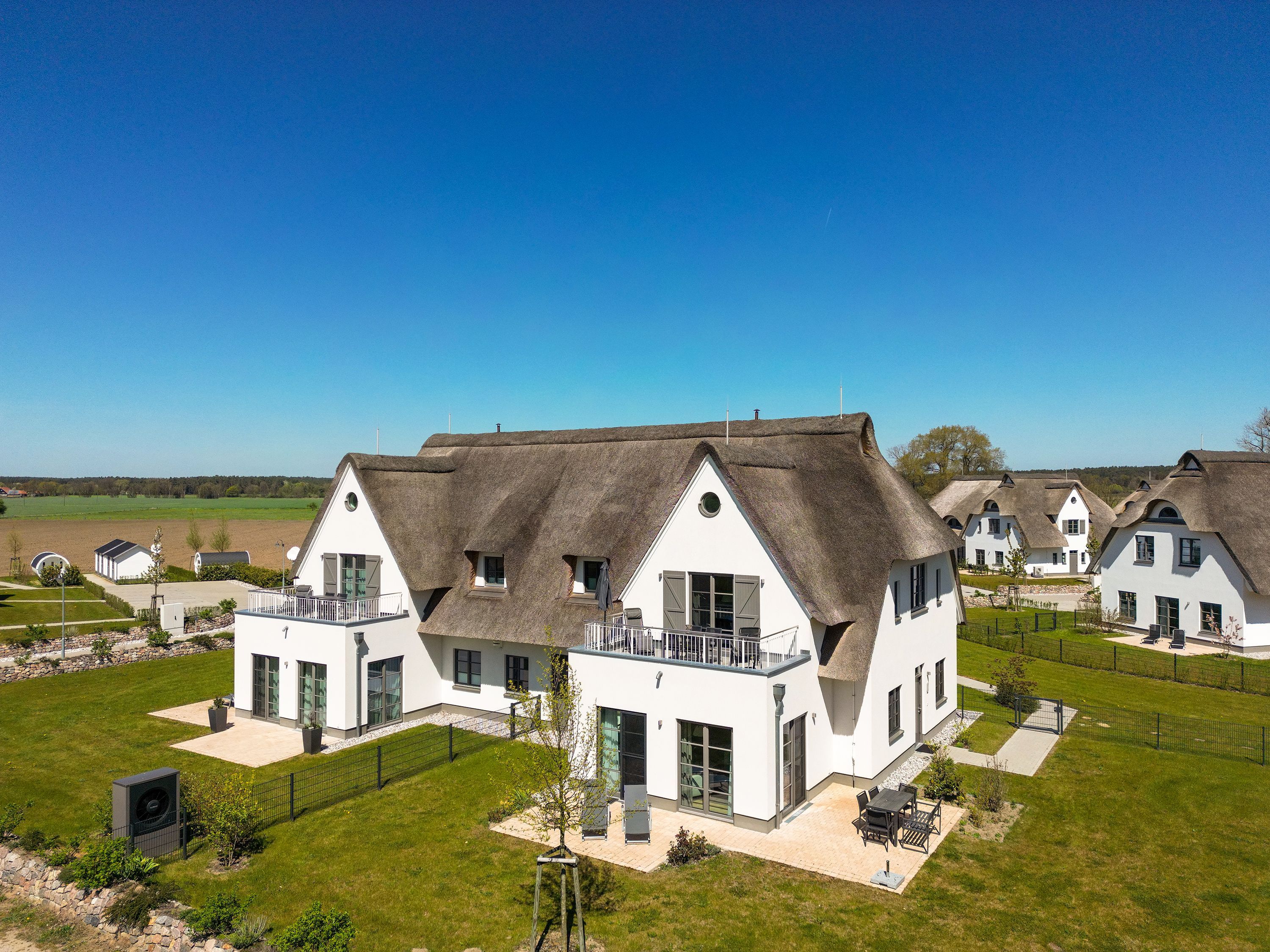 Die Reet gedeckten Häuser wurden in nachhaltiger Holzbauweise errichtet und die Einrichtung ist durch helle sowie freundliche Farben geprägt. Der Blick auf die Haffküste und die umliegende Natur machen Ihren Urlaub einzigartig.