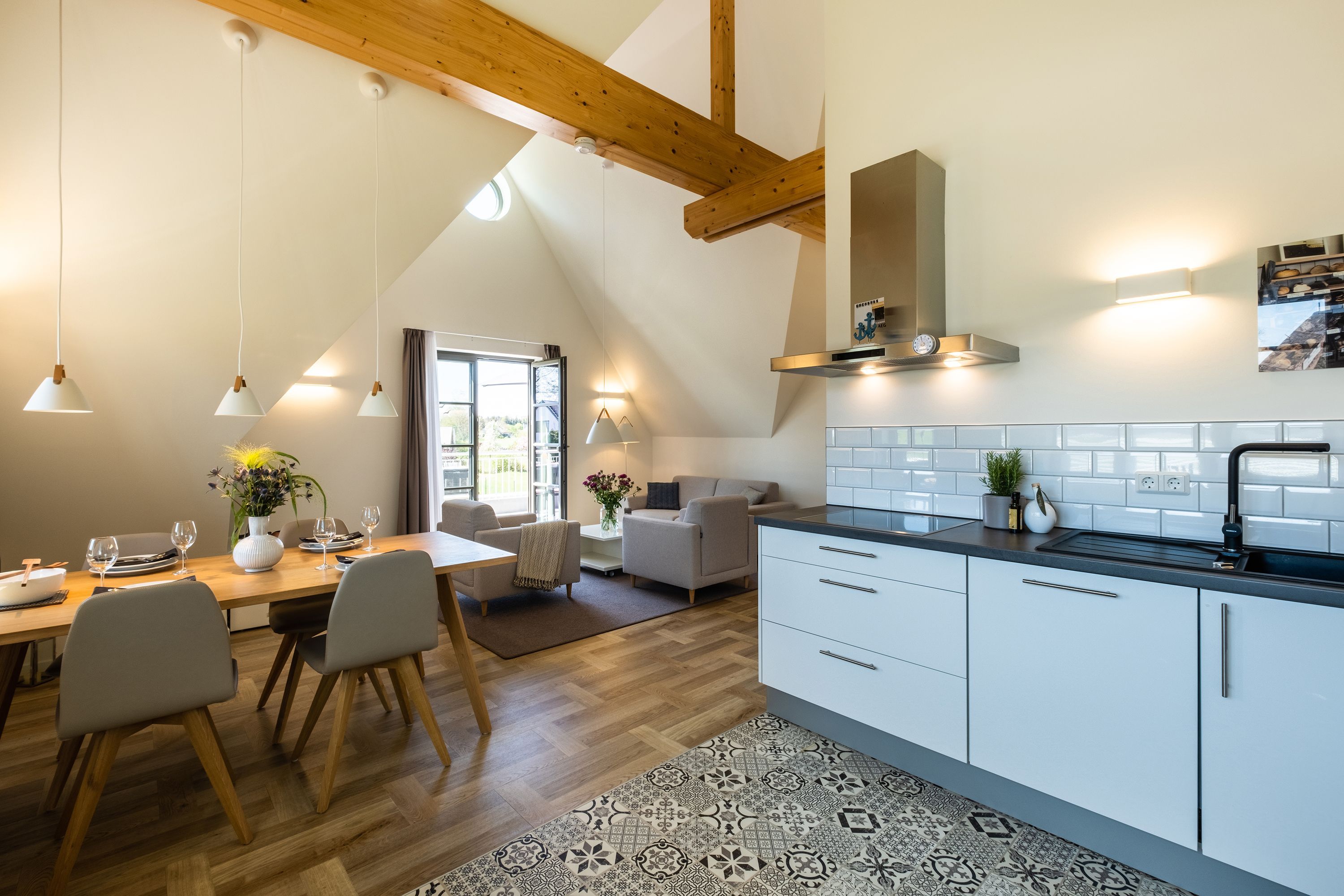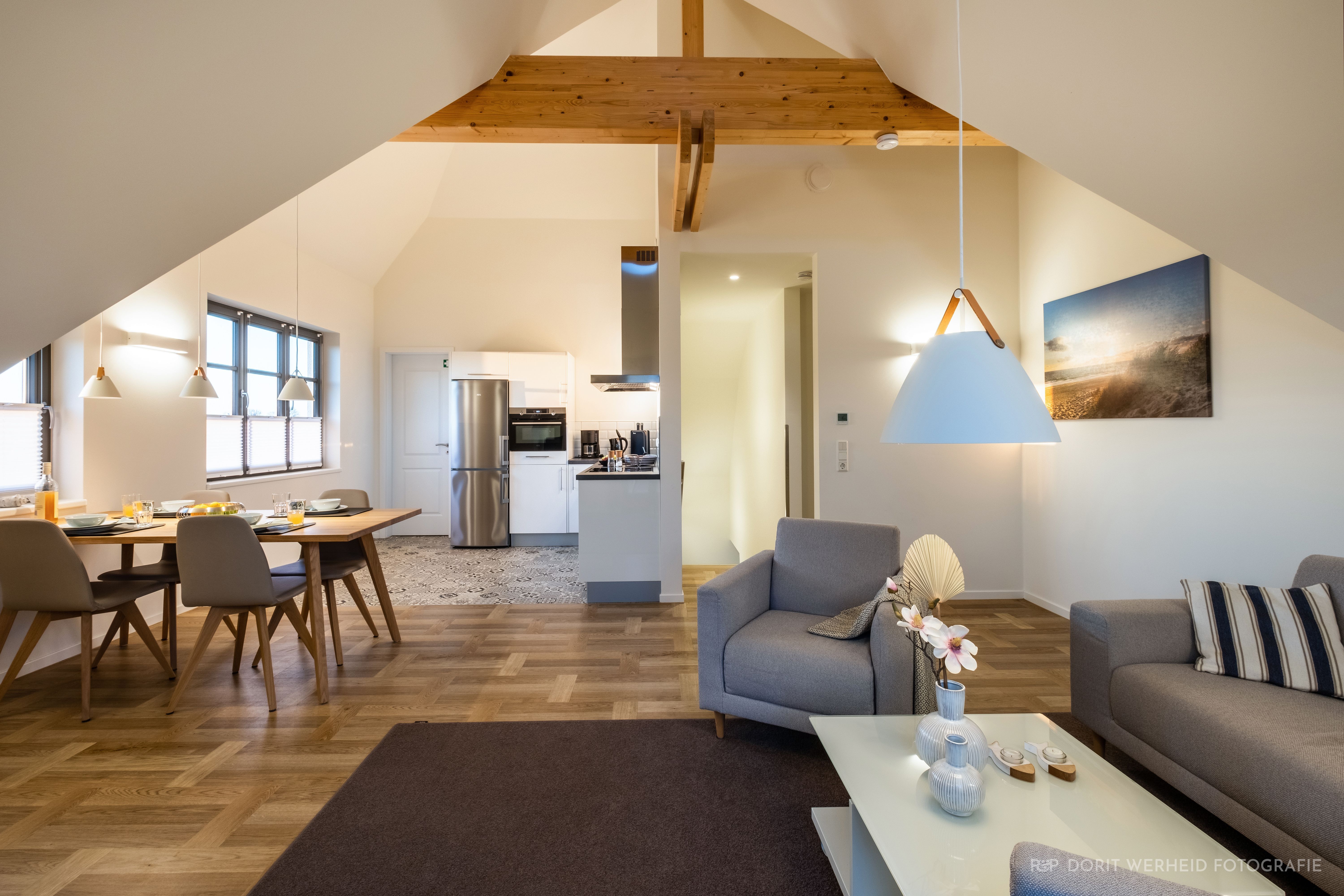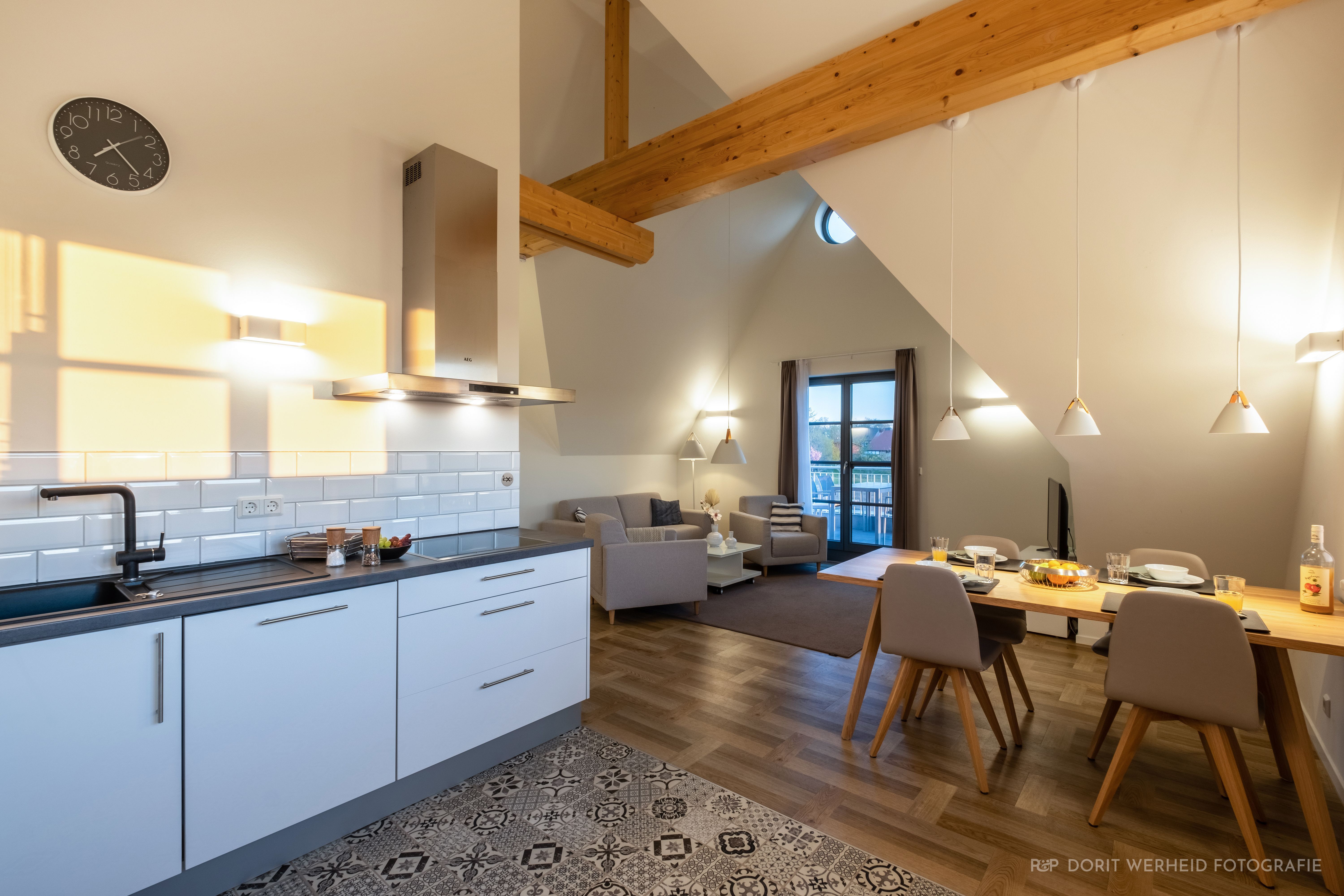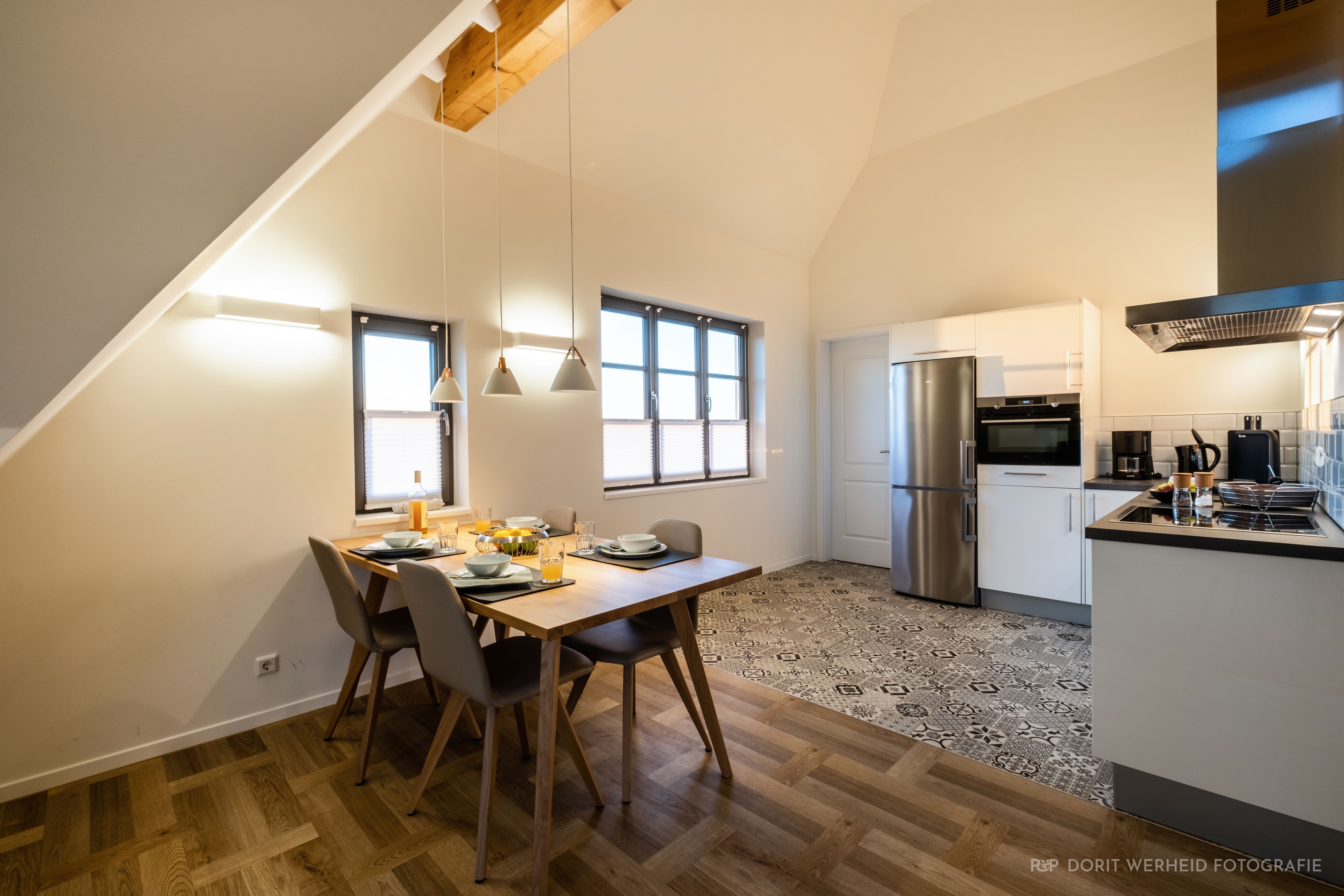 Die Wohnung hat W-LAN und LAN und ist hochwertig ausgestattet. Sie verfügt über eine komplett eingerichtete Einbauküche mit Spülmaschine, Mikrowelle, Toaster, Kaffeemaschine, Wasserkocher, Induktionsherd und großem Kühlraum mit separatem Gefrierabteil. Ebenfalls verfügt die Wohnung über eine Waschmaschine. Der Wohnraum ist durch die ca. vier Meter hohe offene Decke geprägt und die fast 12 qm große Dachterrasse mit Elektrogrill bietet einen weiten Blick über die Felder auf das Haff und das Wasser.