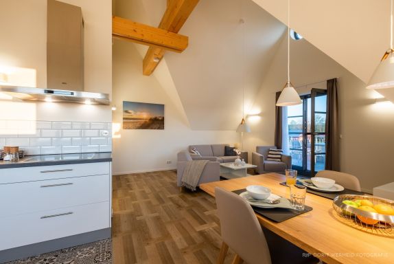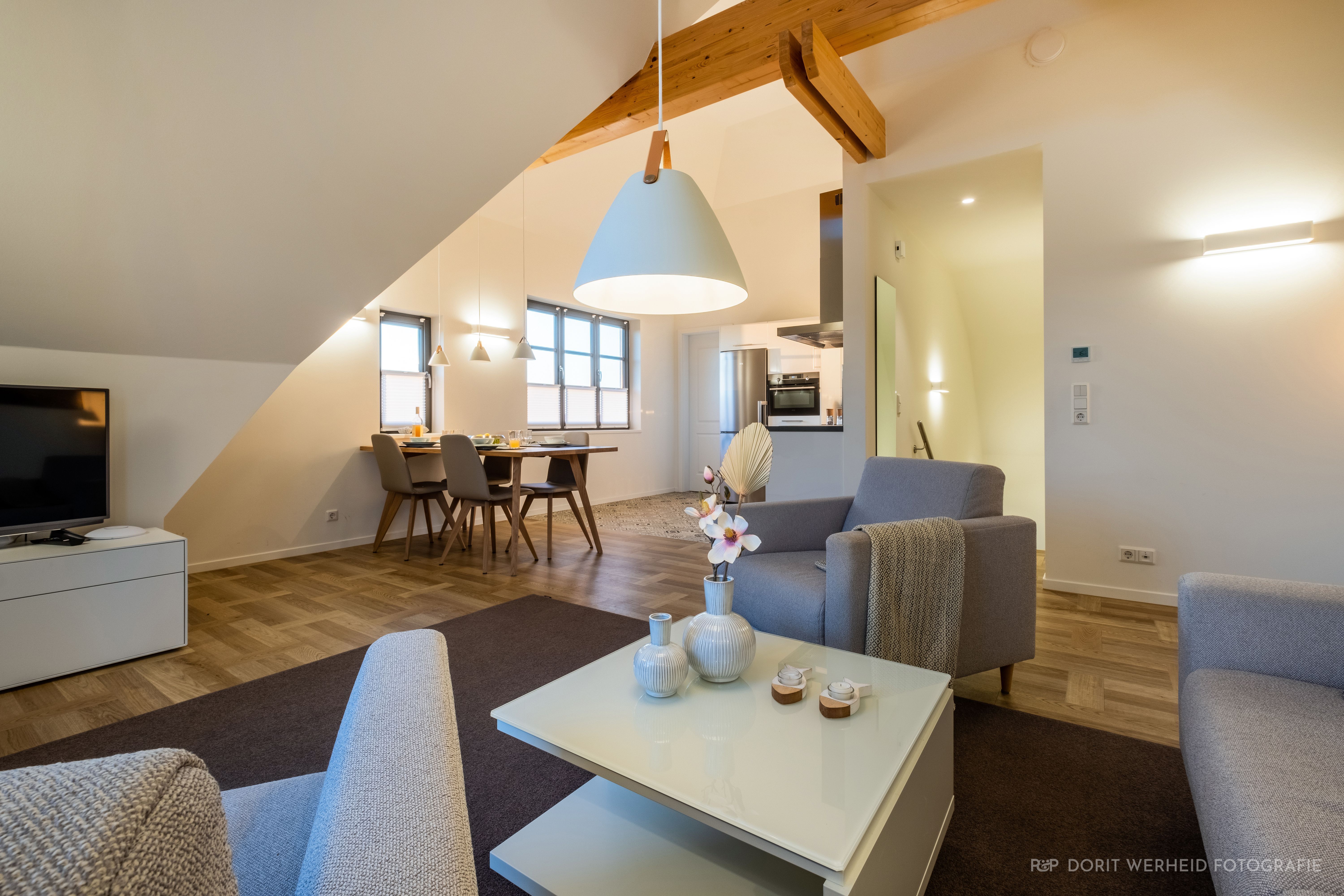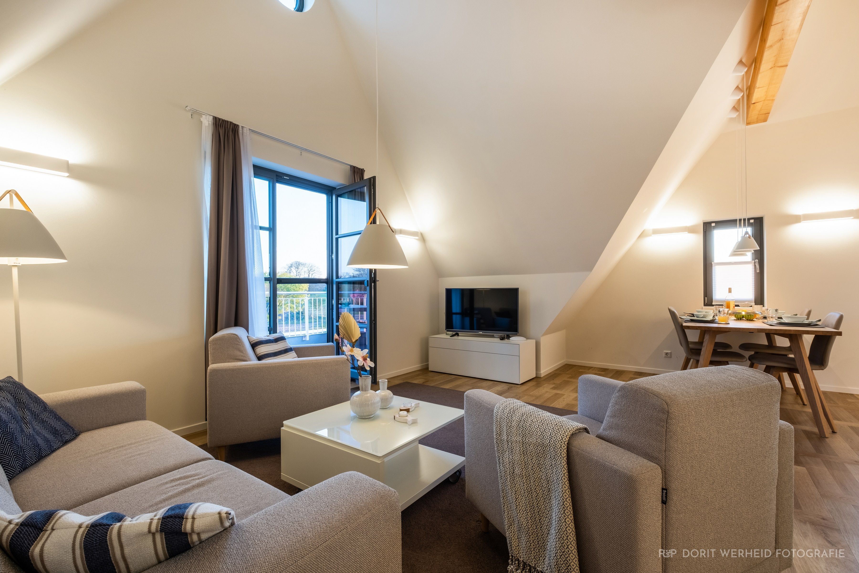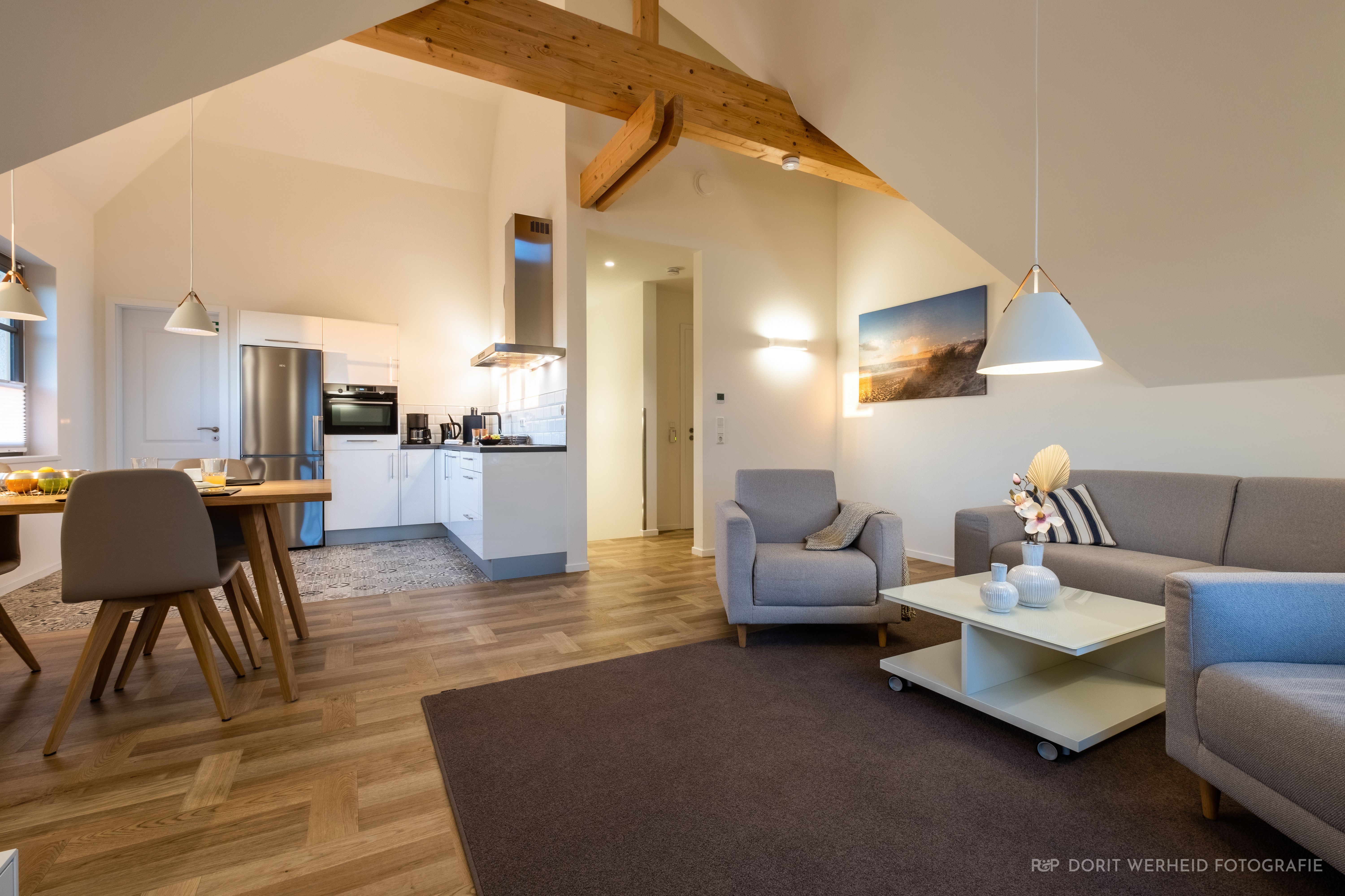 Die Wohnung hat W-LAN und LAN und ist hochwertig ausgestattet. Sie verfügt über eine komplett eingerichtete Einbauküche mit Spülmaschine, Mikrowelle, Toaster, Kaffeemaschine, Wasserkocher, Induktionsherd und großem Kühlraum mit separatem Gefrierabteil. Ebenfalls verfügt die Wohnung über eine Waschmaschine. Der Wohnraum ist durch die ca. vier Meter hohe offene Decke geprägt und die fast 12 qm große Dachterrasse mit Elektrogrill bietet einen weiten Blick über die Felder auf das Haff und das Wasser.