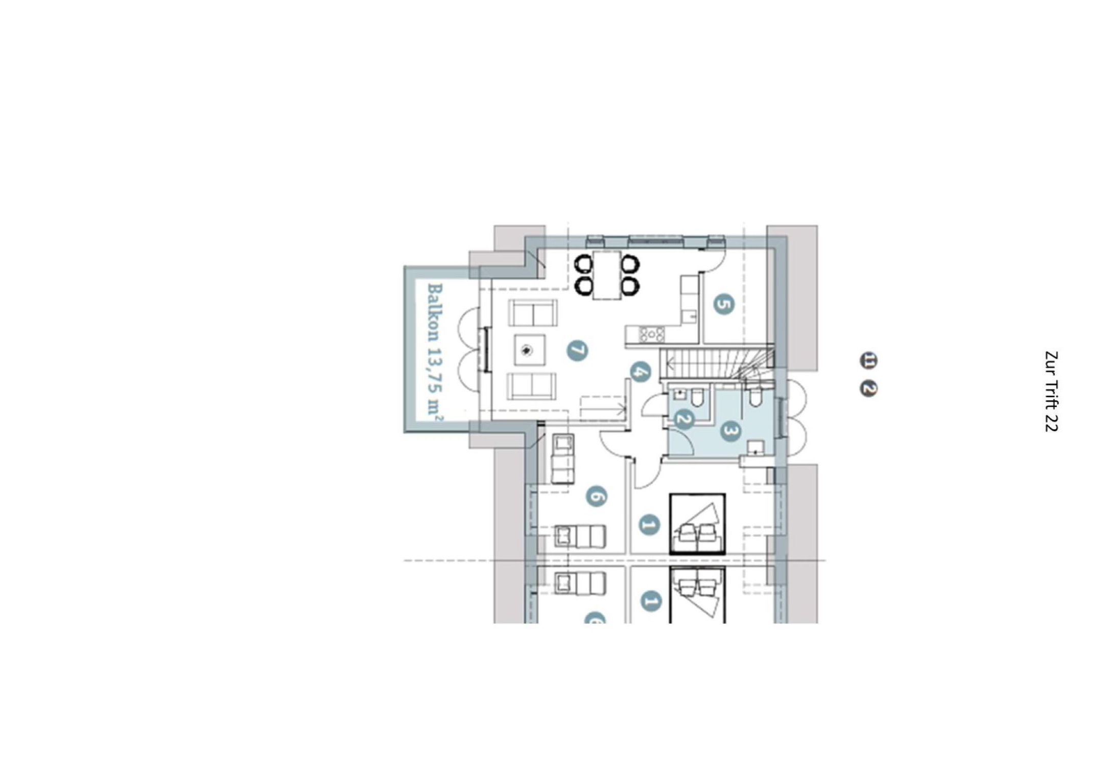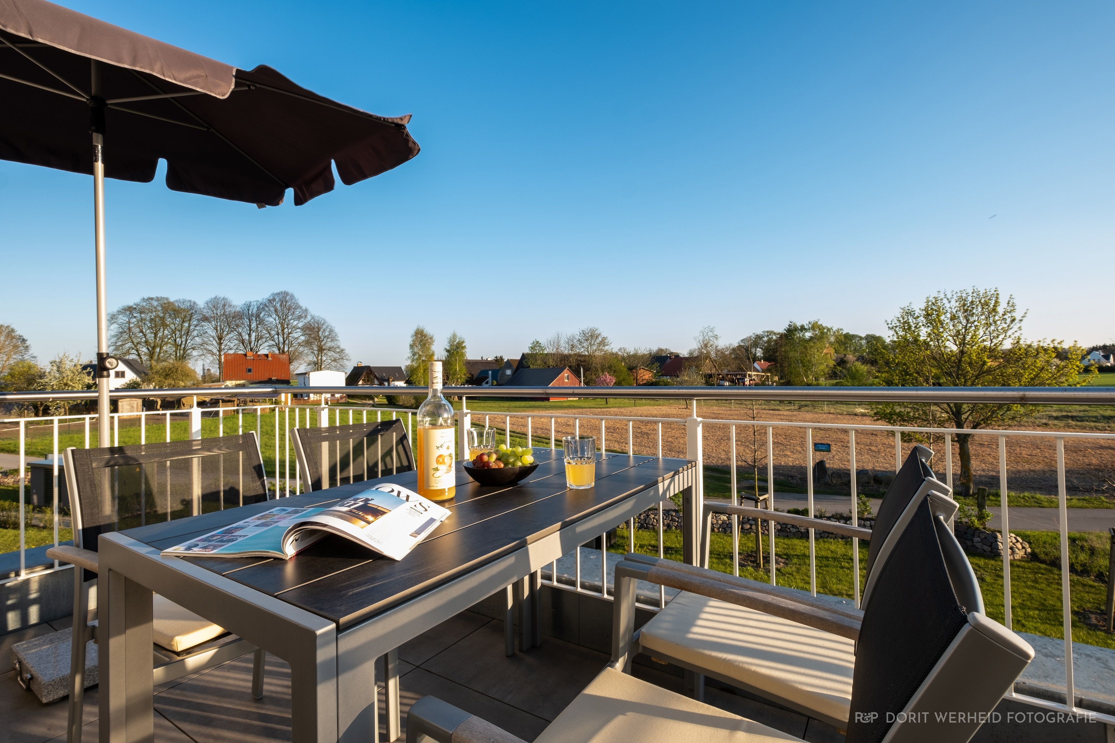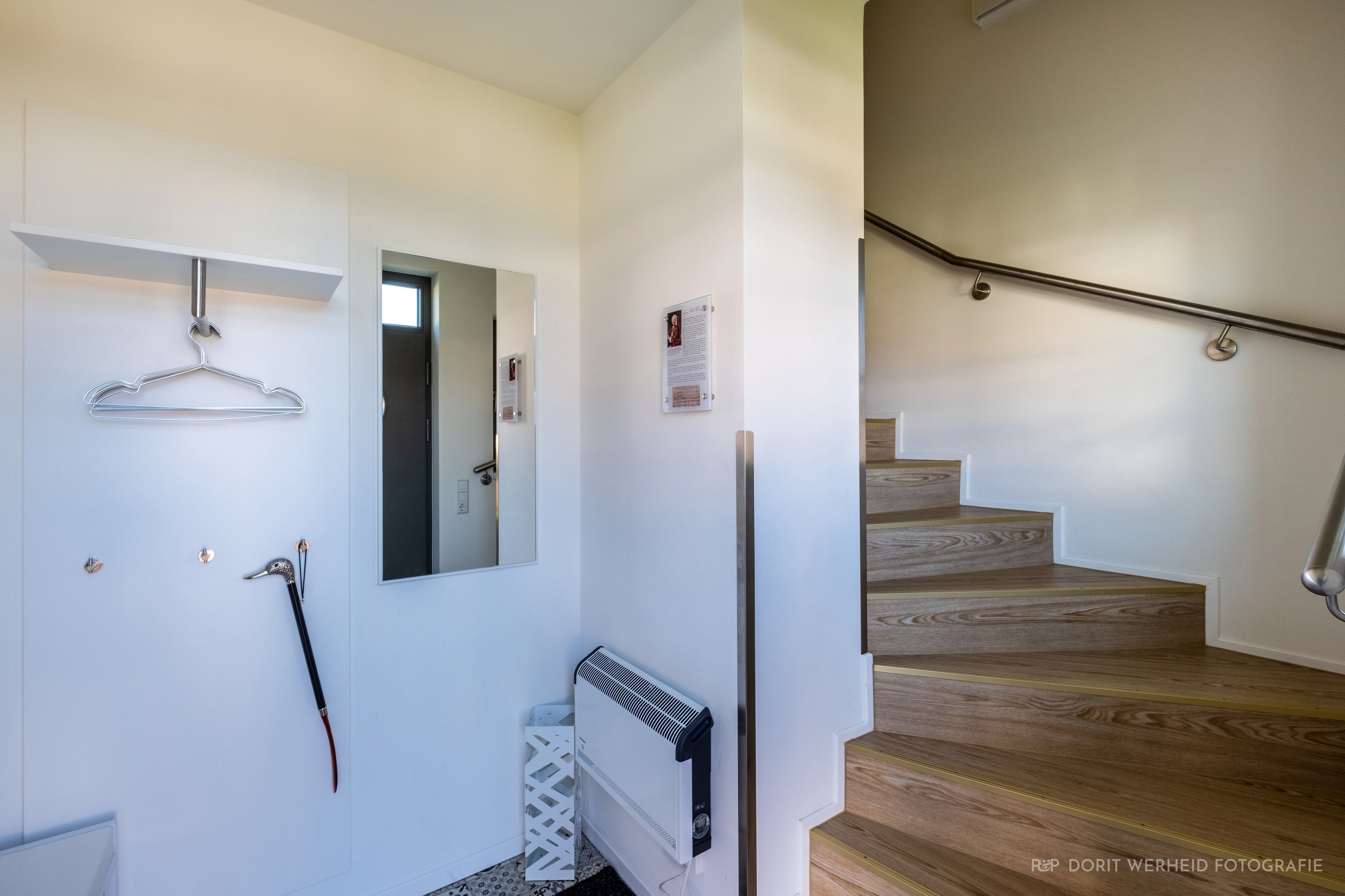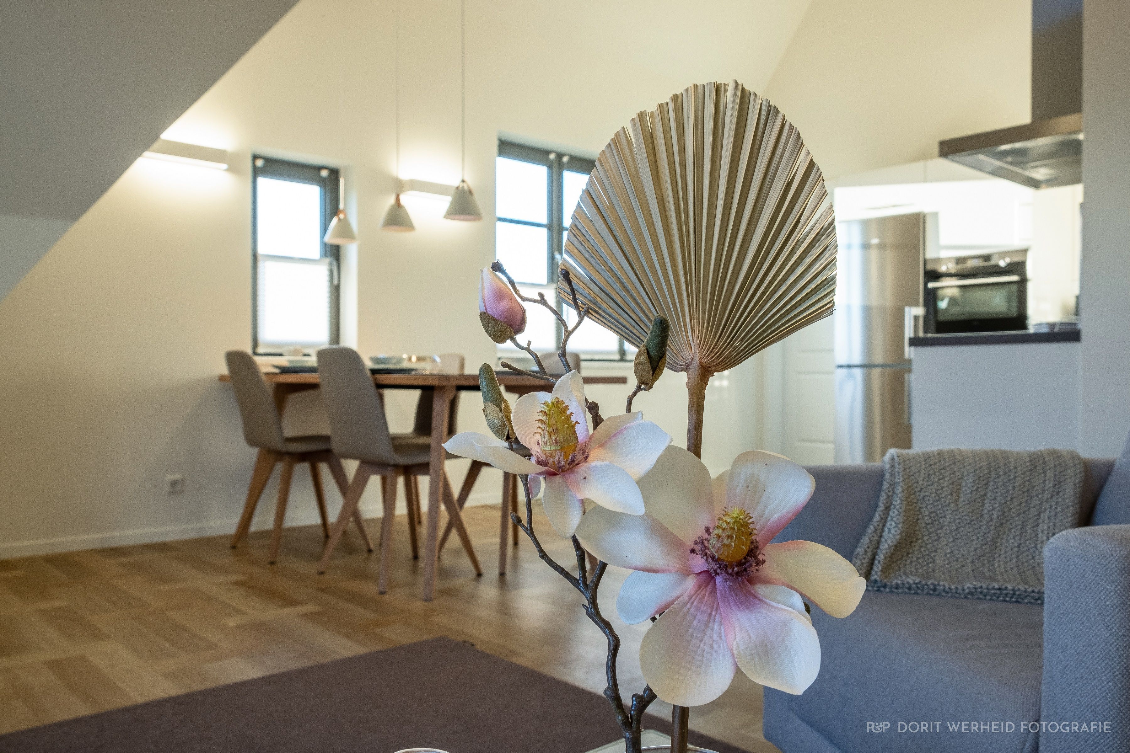 Die Wohnung hat W-LAN und LAN und ist hochwertig ausgestattet. Sie verfügt über eine komplett eingerichtete Einbauküche mit Spülmaschine, Mikrowelle, Toaster, Kaffeemaschine, Wasserkocher, Induktionsherd und großem Kühlraum mit separatem Gefrierabteil. Ebenfalls verfügt die Wohnung über eine Waschmaschine. Der Wohnraum ist durch die ca. vier Meter hohe offene Decke geprägt und die fast 12 qm große Dachterrasse mit Elektrogrill bietet einen weiten Blick über die Felder auf das Haff und das Wasser.