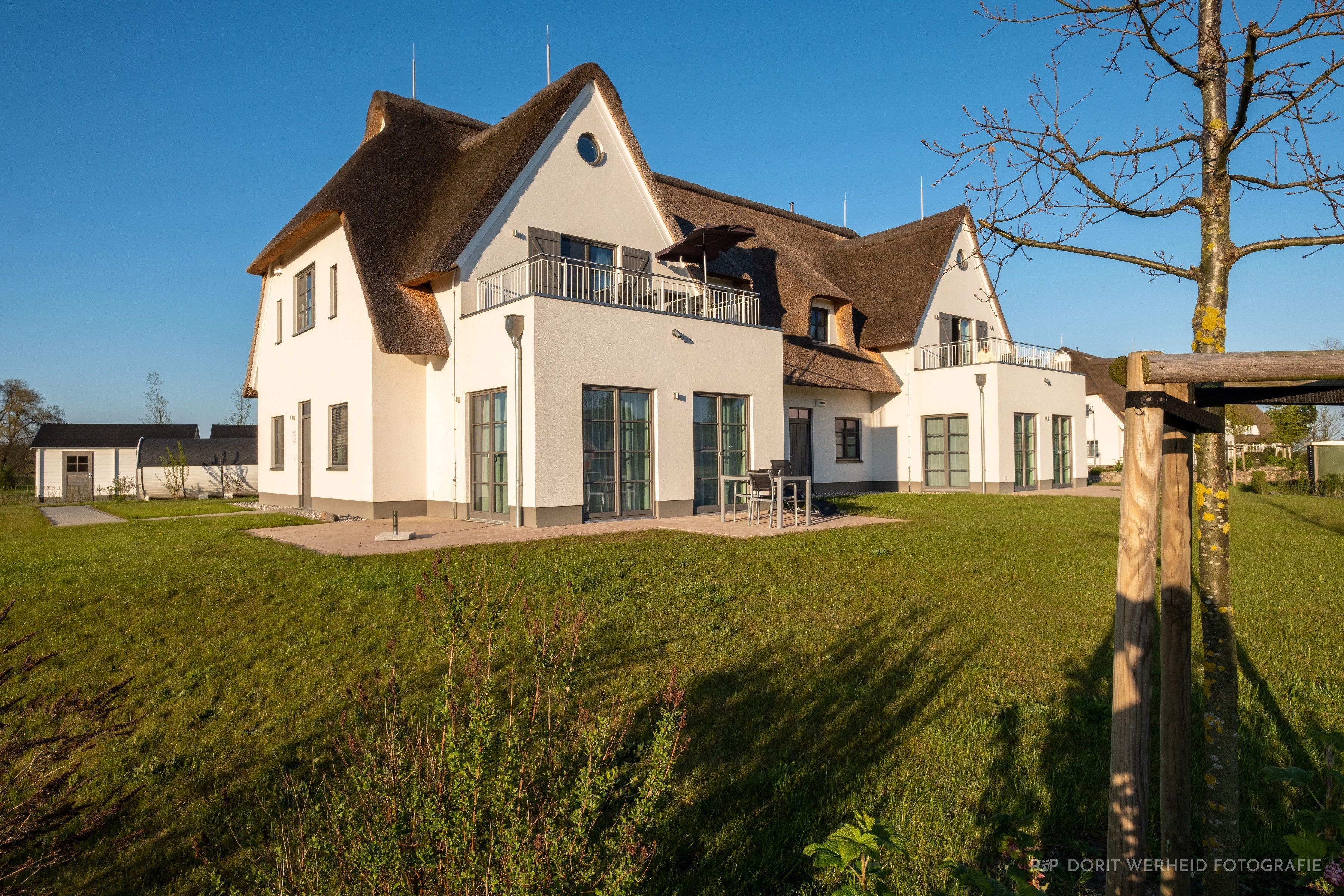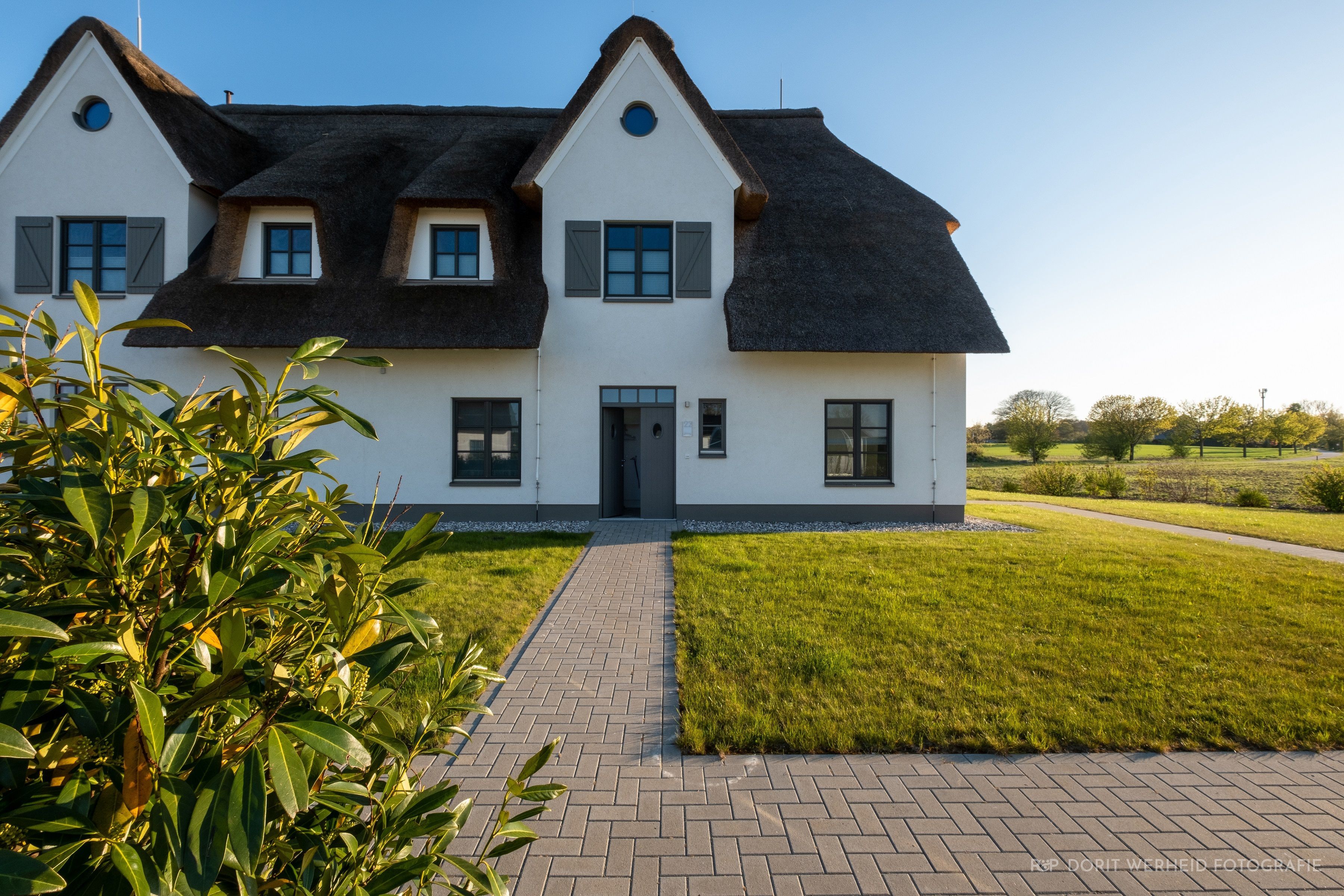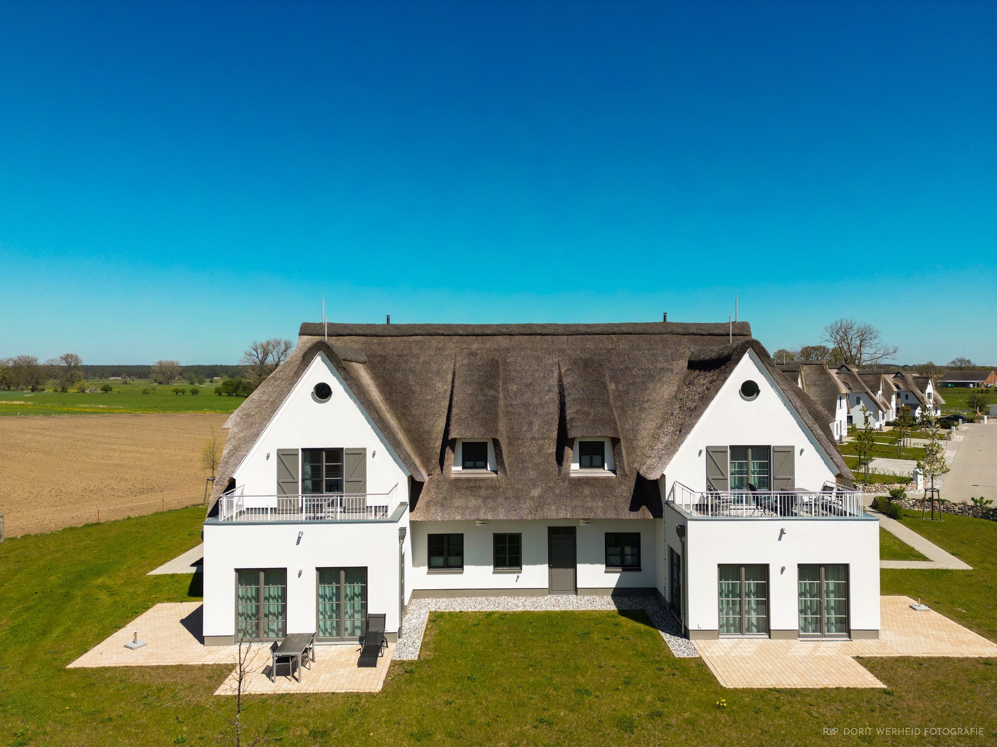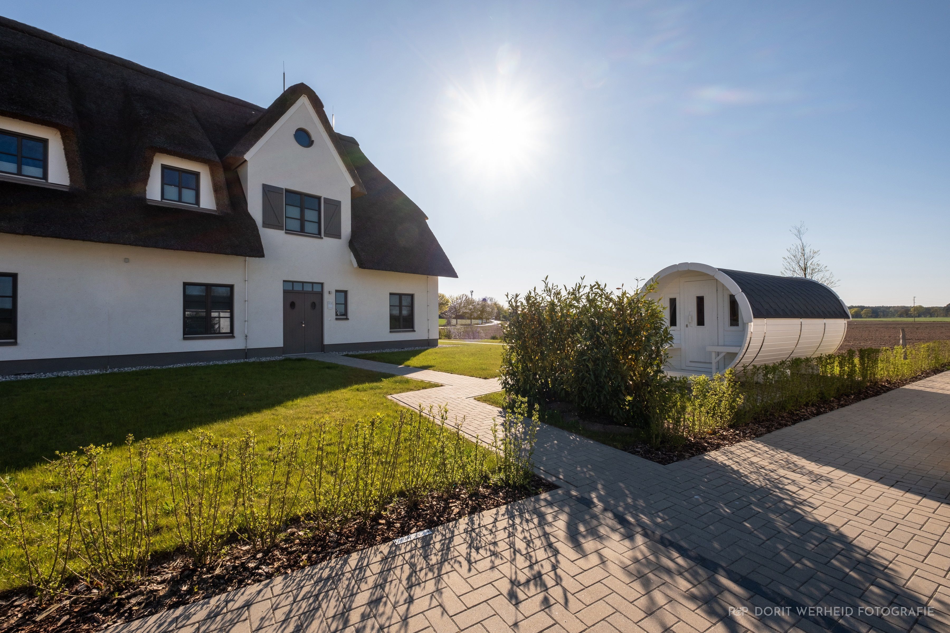 Die Reet gedeckten Häuser wurden in nachhaltiger Holzbauweise errichtet und die Einrichtung ist durch helle sowie freundliche Farben geprägt. Der Blick auf die Haffküste und die umliegende Natur machen Ihren Urlaub einzigartig.