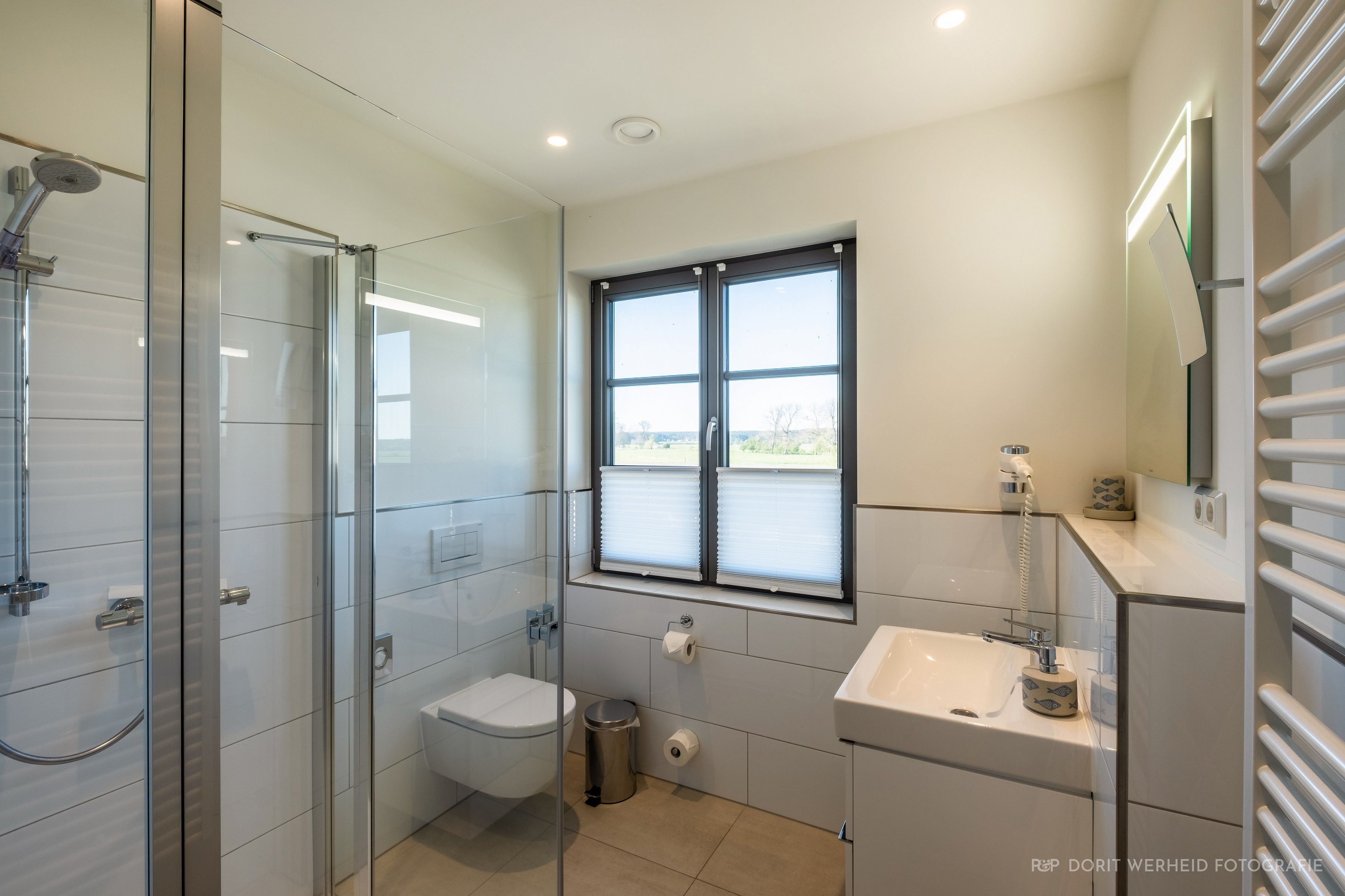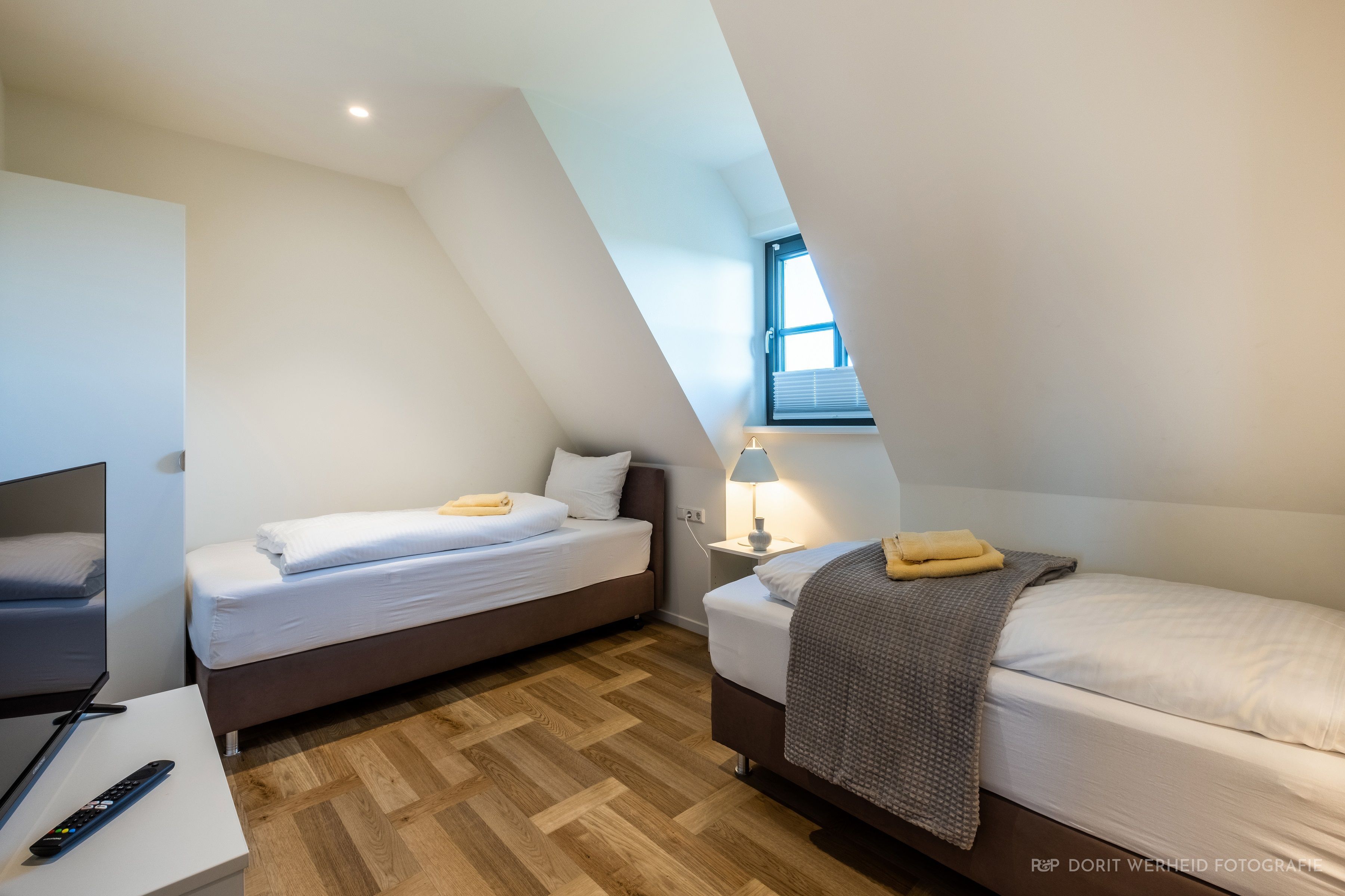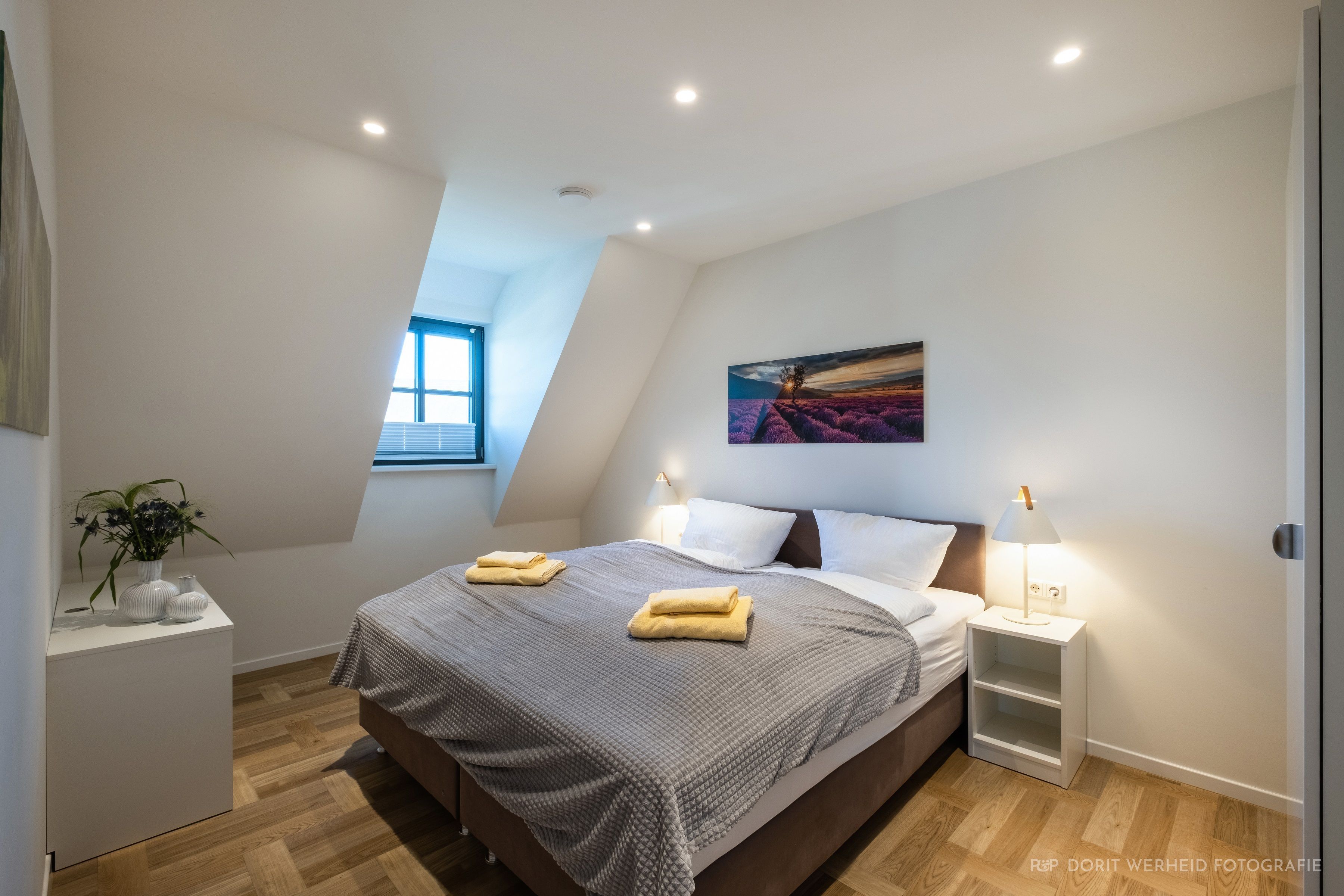 Das große Tageslichtbad ist mit einer bodentiefen Dusche mit Glasabtrennung ausgestattet. Das Hauptschlafzimmer verfügt über ein Doppelbett und das zweite Schlafzimmer über zwei Einzelbetten. Bei allen Betten handelt es sich um Boxspringbetten. Im Wohnzimmer sowie in einem der beiden Schlafzimmer befindet sich jeweils ein Flachbildschirm.