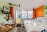 Es befinden sich auf dem Grundstück fünf Ferienunterkünfte - ein kleines freistehendes Ferienhaus mit zwei Ferienwohnungen im 1. OG (Balkonstudio links & rechts) und einer großen Ferienwohnung im Erdgeschoss, sowie ein Bungalow mit zwei Ferienwohnungen (Bungalow links & rechts). Die Wohnungen im Bungalow können mittels einer Zwischentür auch zusammengelegt werden.