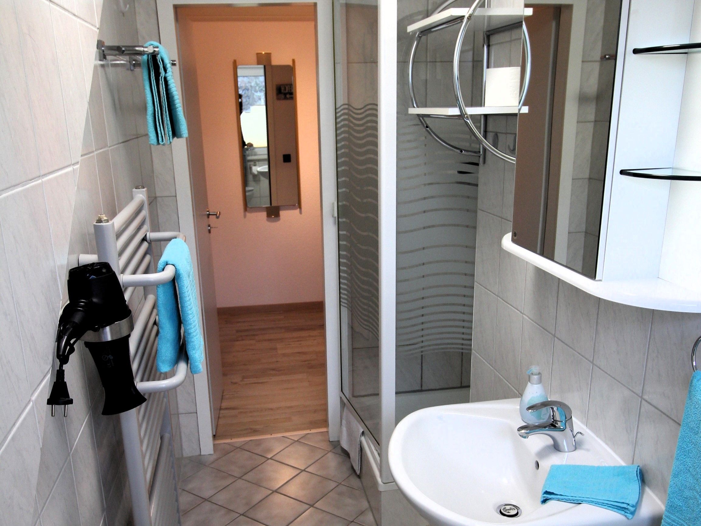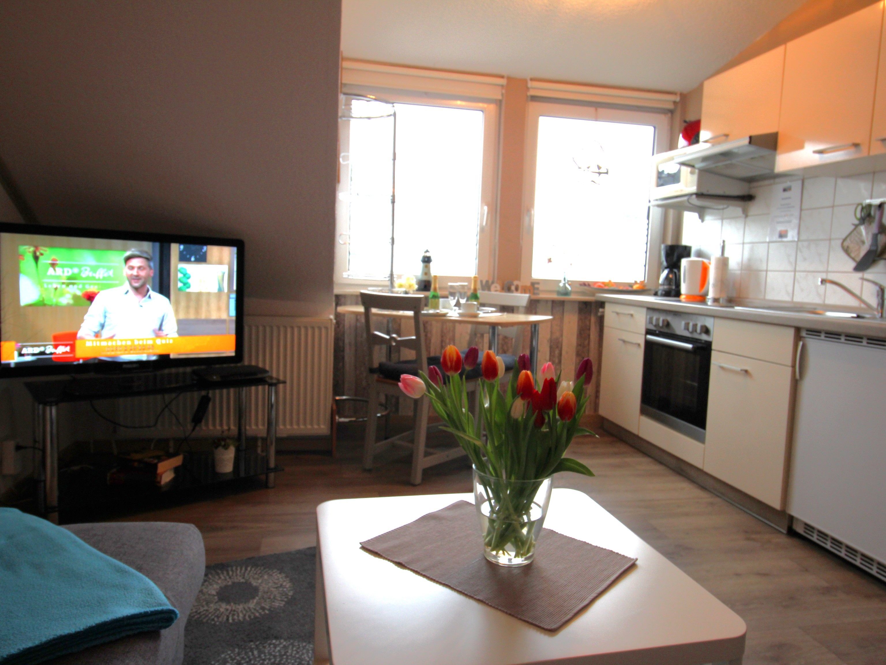 Sie wohnen in einem modernen, ca. 40 m² großen 2-Zimmer Appartement fur bis zu 2 Personen im 1. Obergeschoss mit separatem Eingang. Im Flur finden Sie an der Garderobe genugend Platz fur Ihre Jacken und Mäntel. Der sich anschließende Wohnbereich empfängt Sie mit einer gemutlichen Wohnlandschaft und einem Flachbild-TV mit Mediareceiver fur den Empfang von Magenta-TV und Radio. Gegenuberliegend befindet sich eine komplett ausgestattete Kuchenzeile mit Backofen, Mikrowelle, Kaffeemaschine und weiteren E-Geräten fur den täglichen Bedarf sowie der separate Essplatz. Vom Flur ausgehend betreten Sie das Tageslicht-Duschbad mit WC, selbstverständlich gehört auch ein Föhn zu Ihren Annehmlichkeiten. Im Schlafzimmer finden Sie ein großes Doppelbett sowie einen geräumigen Kleiderschrank und fur eine erholsame Nachtruhe elektrische Außenjalousien. In der gesamten Wohnung haben Sie kostenfreien WLAN Internetzugang und vor dem Haus befinden sich Parkmöglichkeiten.