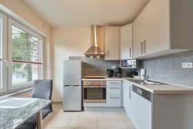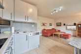 Die offene Einbauküche ist komplett ausgestattet mit einem Herd inkl. Backofen und Cerankochfeld, Geschirrspüler, Kühlschrank mit Gefrierfach, Kaffeemaschine, Toaster, Mikrowelle und Wasserkocher.