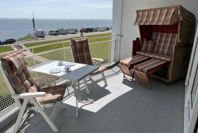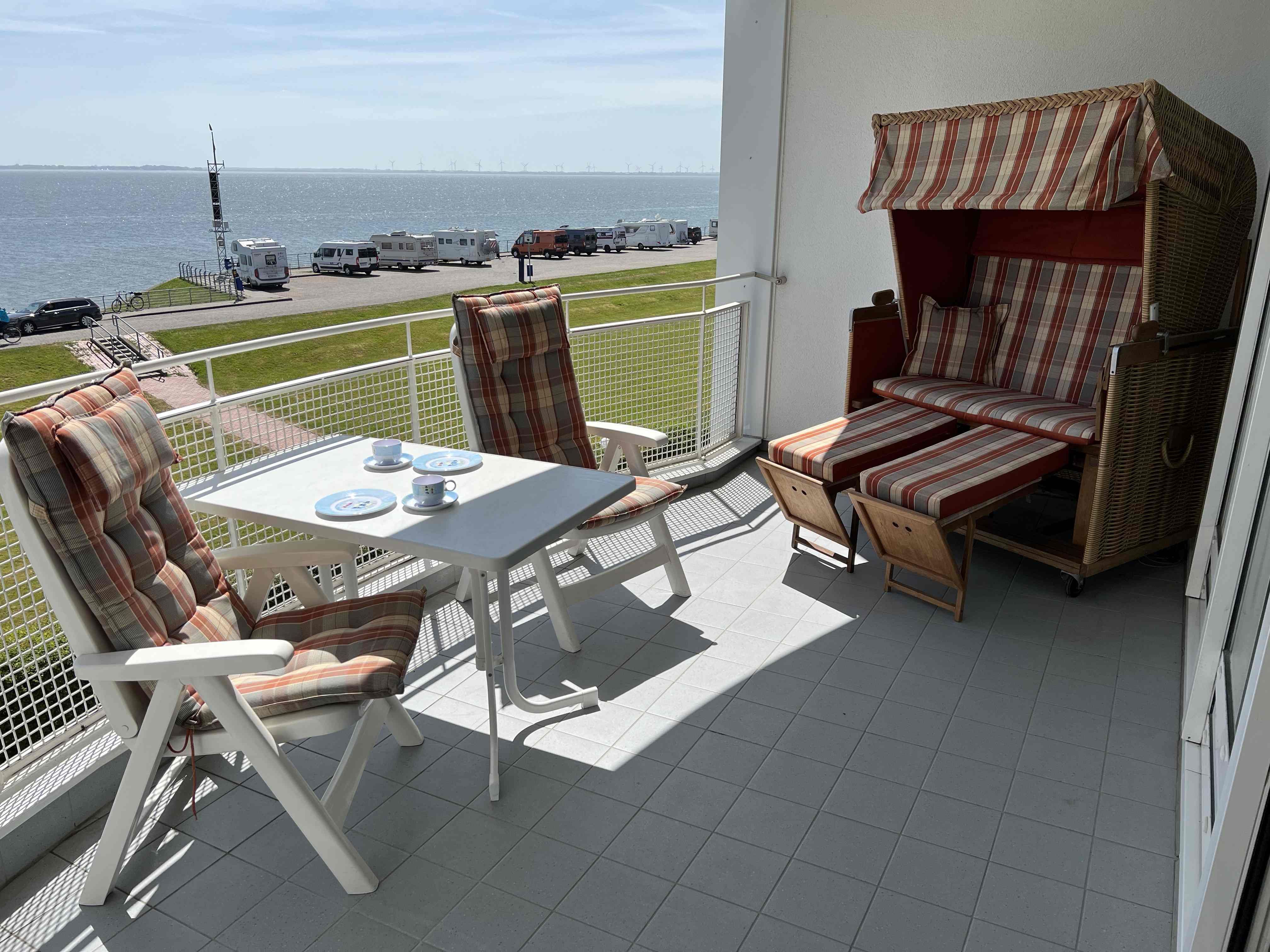 Genießen Sie in einmaliger Lage am Südstrand von Wilhelmshaven den Meerblick vom Balkon und die Aussicht auf den Binnenhafen vom Küchenfenster aus. Die im maritimen Stil ausgestattete Ferienwohnung befindet sich in der 4. Etage im Helgolandhaus AVANTGARDE am Südstrand, welche Sie bequem mit dem Fahrstuhl erreichen. Der große 13qm Balkon in Südlage mit Blick auf die Nordsee verfügt über einen Strandkorb und Gartenmöbel. Die Wohnung lädt zum gemütlichen und komfortabelen Verweilen ein