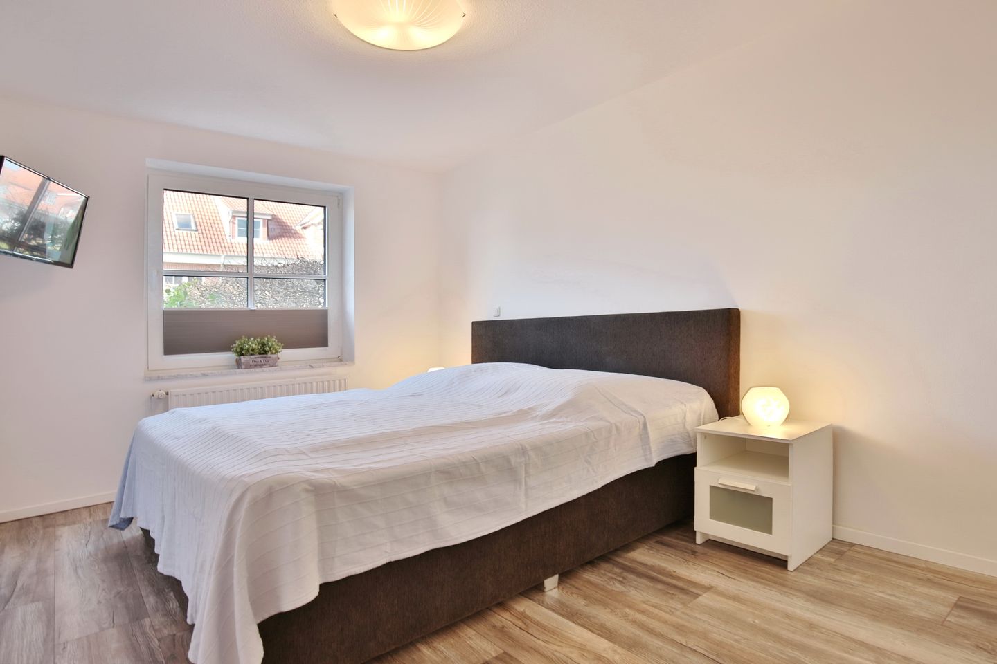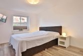 Das separate Schlafzimmer ist vom Flur aus erreichbar und verfügt über ein Doppelbett (180x200cm), Kleiderschrank, Nachtschränken und Verdunkelungsplissees.
