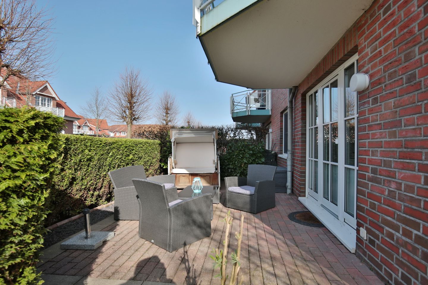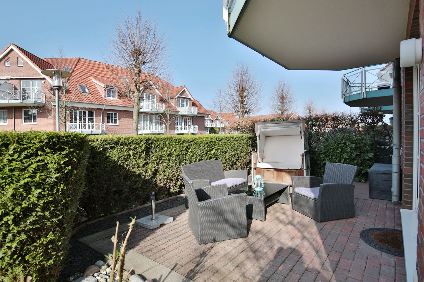 Vom Wohnbereich aus haben Sie direkten Zugang zur sonnigen Terrasse, auf dieser Ihnen ein gemütlicher Strandkorb sowie eine Loungesitzgruppe zur Verfügung steht.