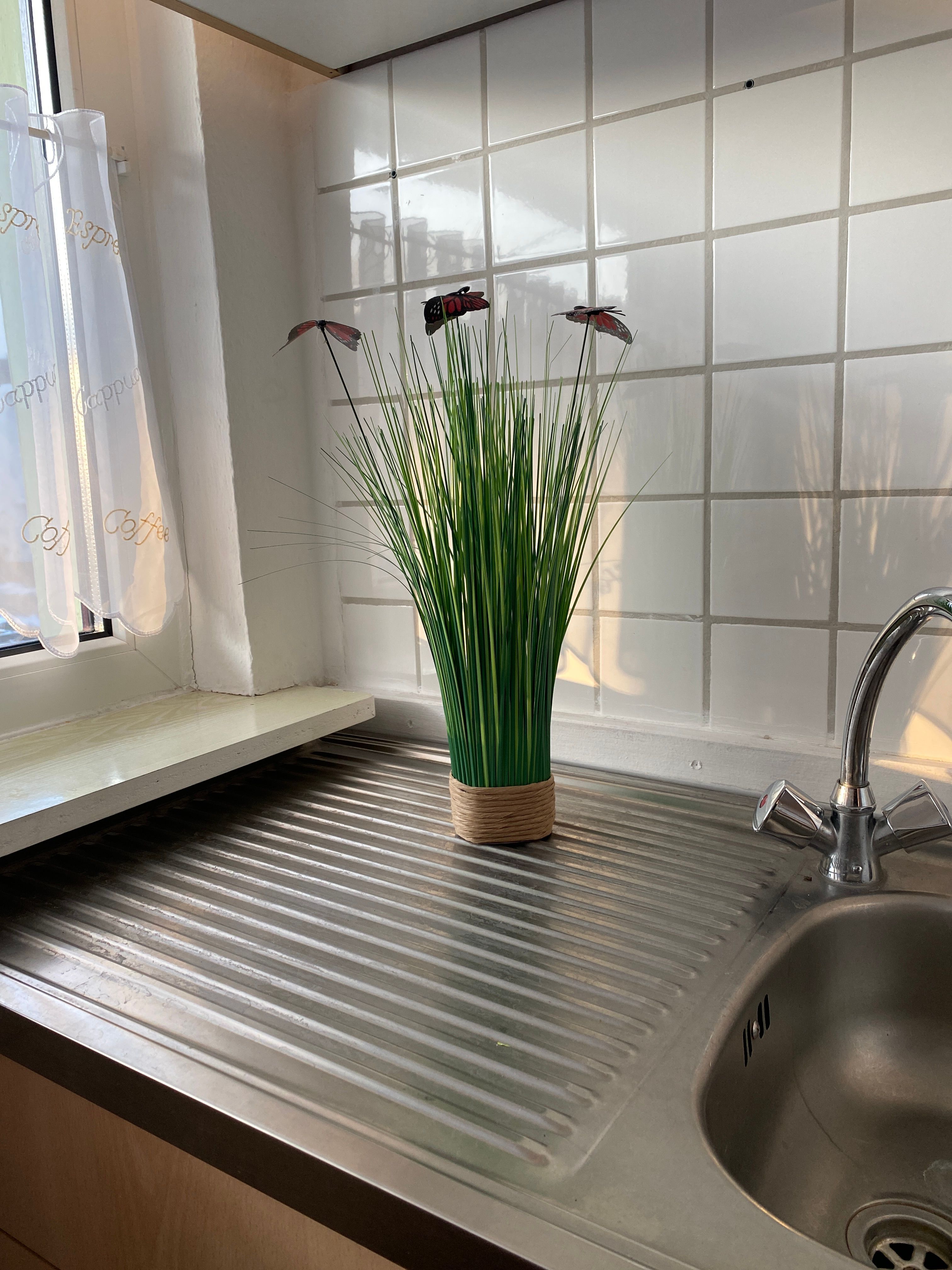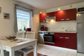 • Küchenzeile: 4er-Ceran-Herd, Backofen, Kühlschrank mit Gefrierfach, Spülmaschine, Wasserkocher, Kaffeemaschine, Toaster, Mikrowelle