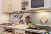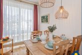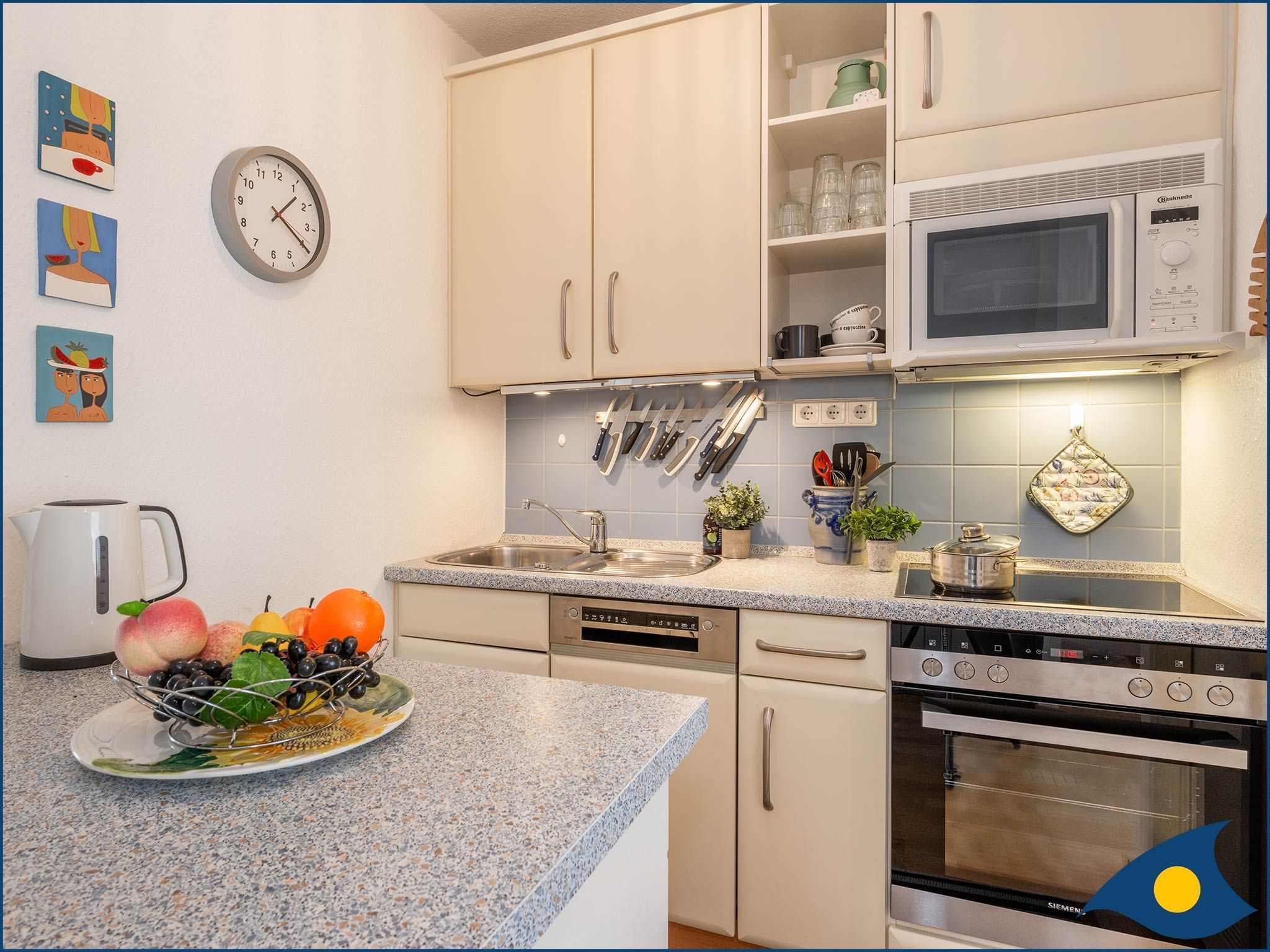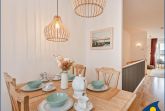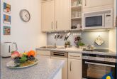 Der Eingangs- und Wohnbereich des Appartements befindet sich in der 2. Etage des Hauses. Hier gibt es neben dem Essbereich eine vollausgestattete offene Küche mit Geschirrspüler, Backofen, großem Ceran-Kochfeld, Mikrowelle und Kühlschrank mit Gefriermöglichkeit.