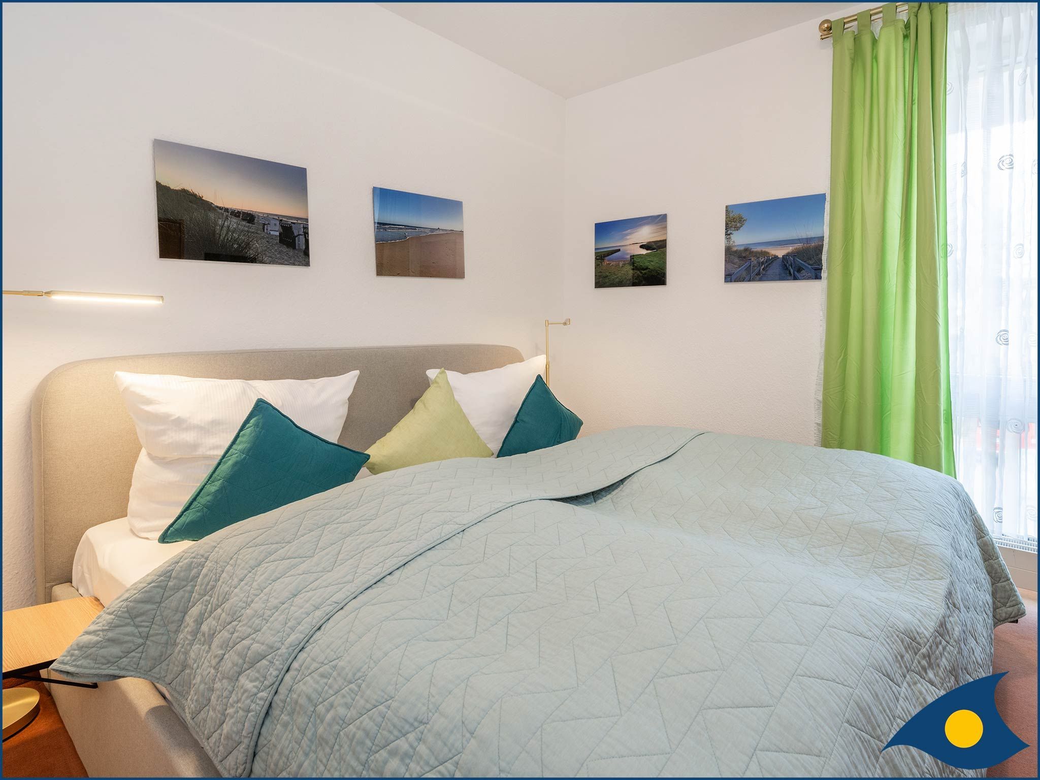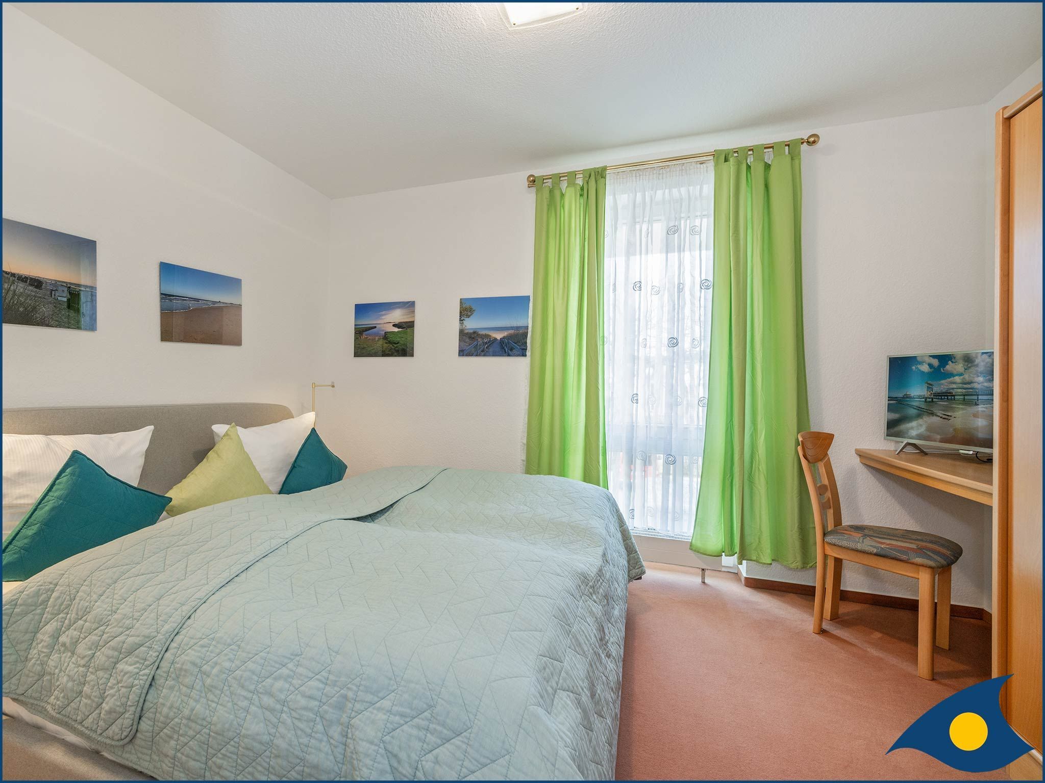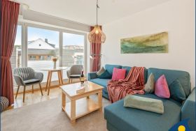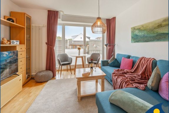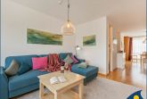 Des Weiteren finden Sie hier eine gemütliche Sitzecke, bestehend aus Sofa und Sessel direkt an dem französischen Balkon. Seitlich zur Ostsee gelegen, haben Sie von hier aus sogar Meerblick. Abgerundet wird die Ausstattung durch einen Smart-TV.