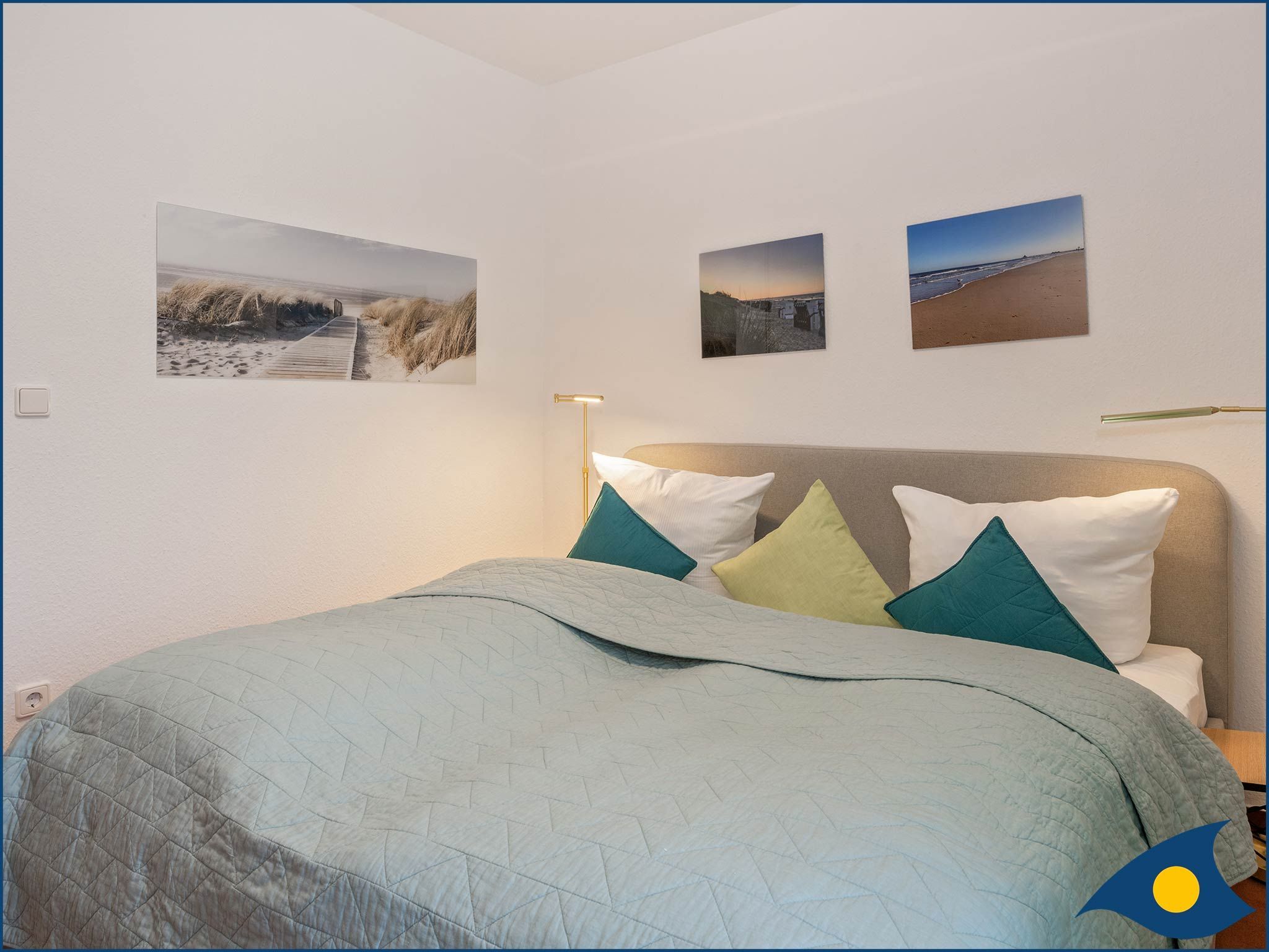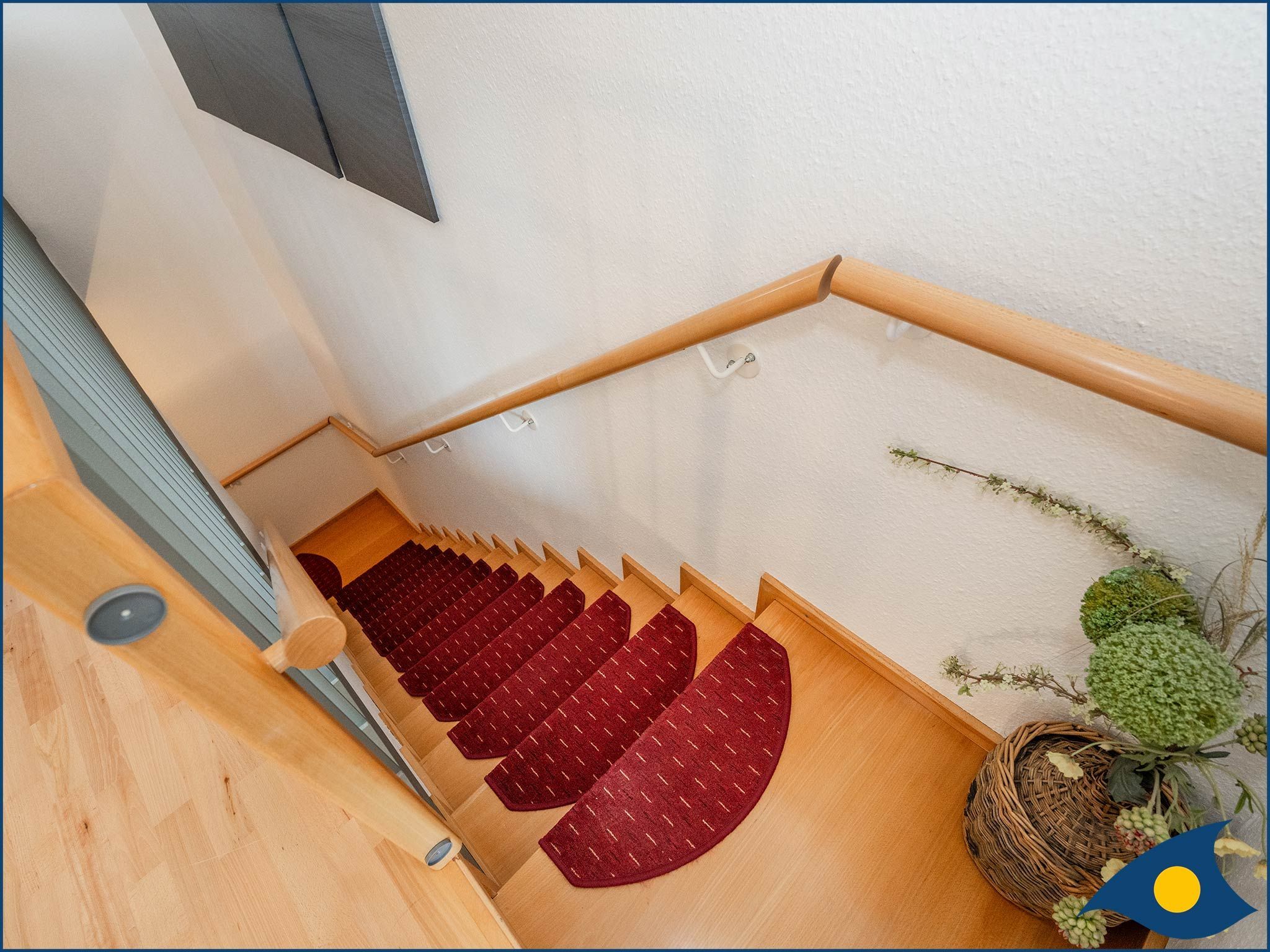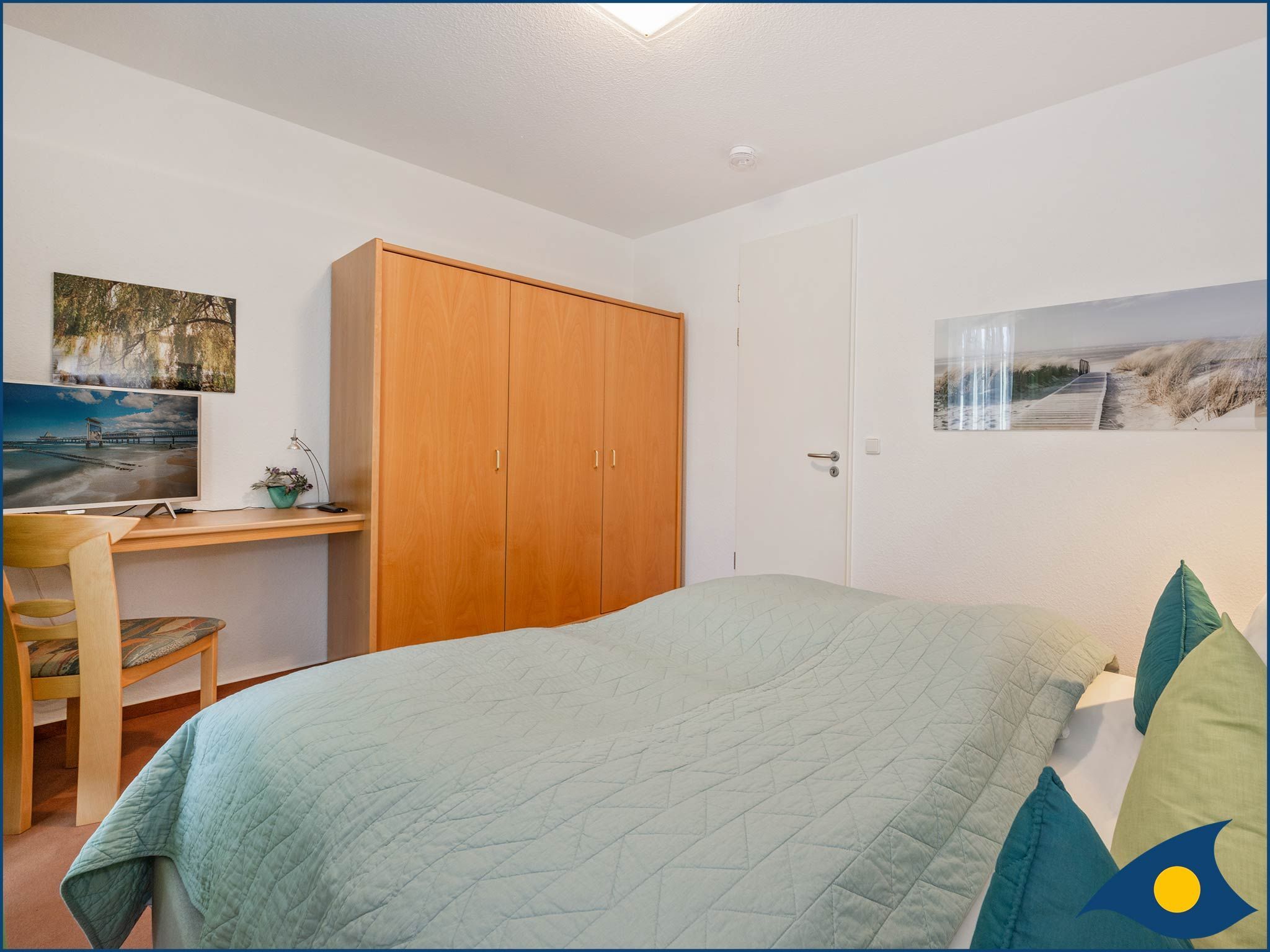 Über eine Treppe gelangen Sie in den unteren Bereich der Maisonette-Wohnung, in dem sich das Schlafzimmer mit einem bequemen Doppelbett, sowie einem weiteren TV-Gerät befindet.