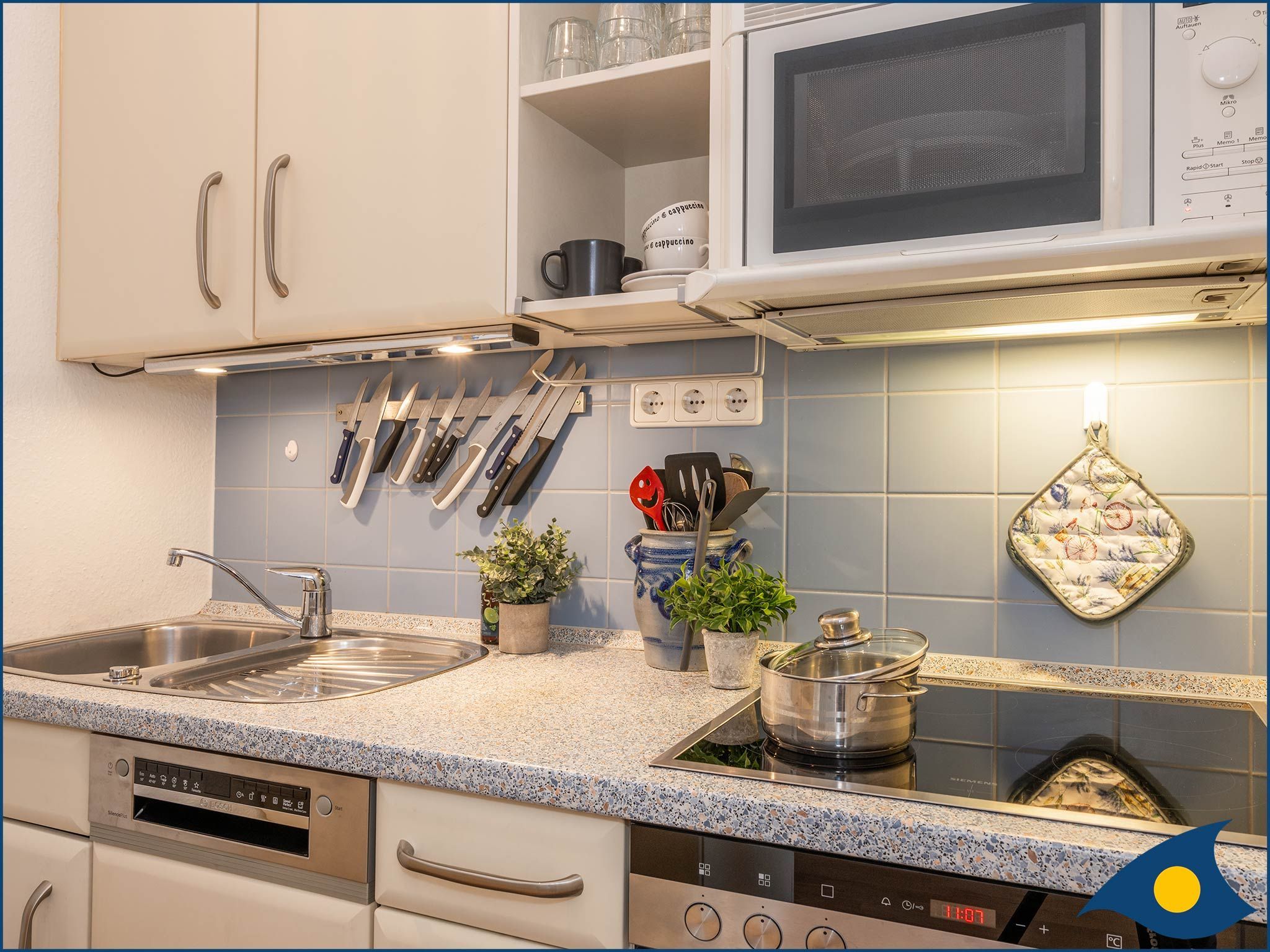 • offene vollausgestattete Küche mit Kühlschrank, Mirkrowelle, Geschirrspüler, Backofen und großem Ceran-Kochfeld