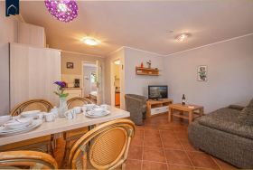 Diese gemütliche Ferienwohnung auf Usedom bietet auf 35 m² ein perfekt abgestimmtes Raumkonzept für bis zu 4 Personen. Mit einem separaten Schlafzimmer, einem komfortablen Wohnbereich mit Schlafsofa, einem modernen Badezimmer mit Dusche und einer voll ausgestatteten Küche eignet sich die Unterkunft ideal für Paare oder kleine Familien. Der gemütliche Esstisch lädt zu gemeinsamen Mahlzeiten ein, und ein Ganzkörperspiegel sowie zahlreiche Fenster sorgen für ein luftiges, freundliches Raumgefühl.