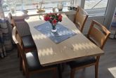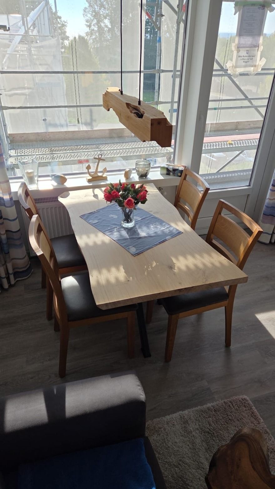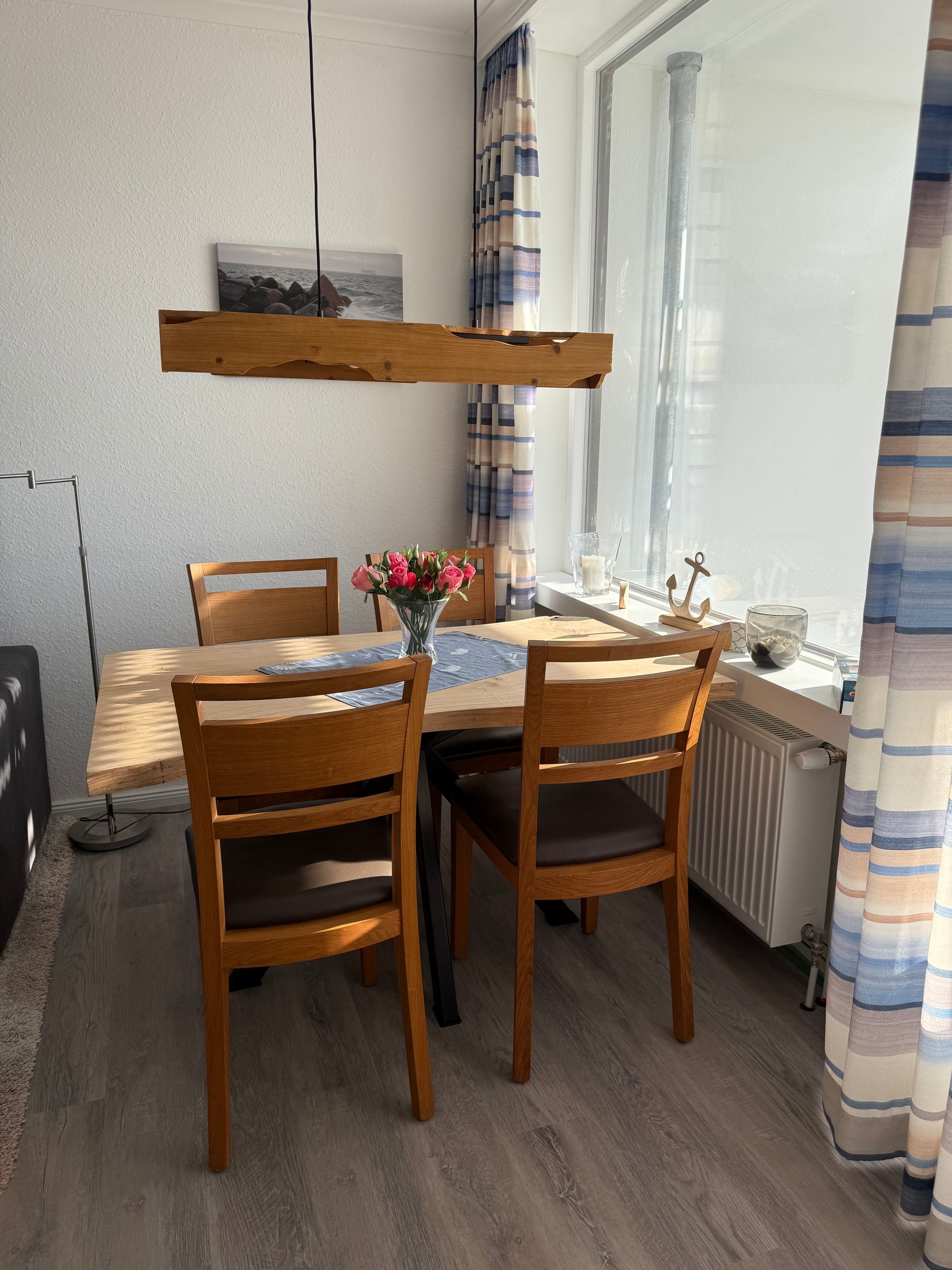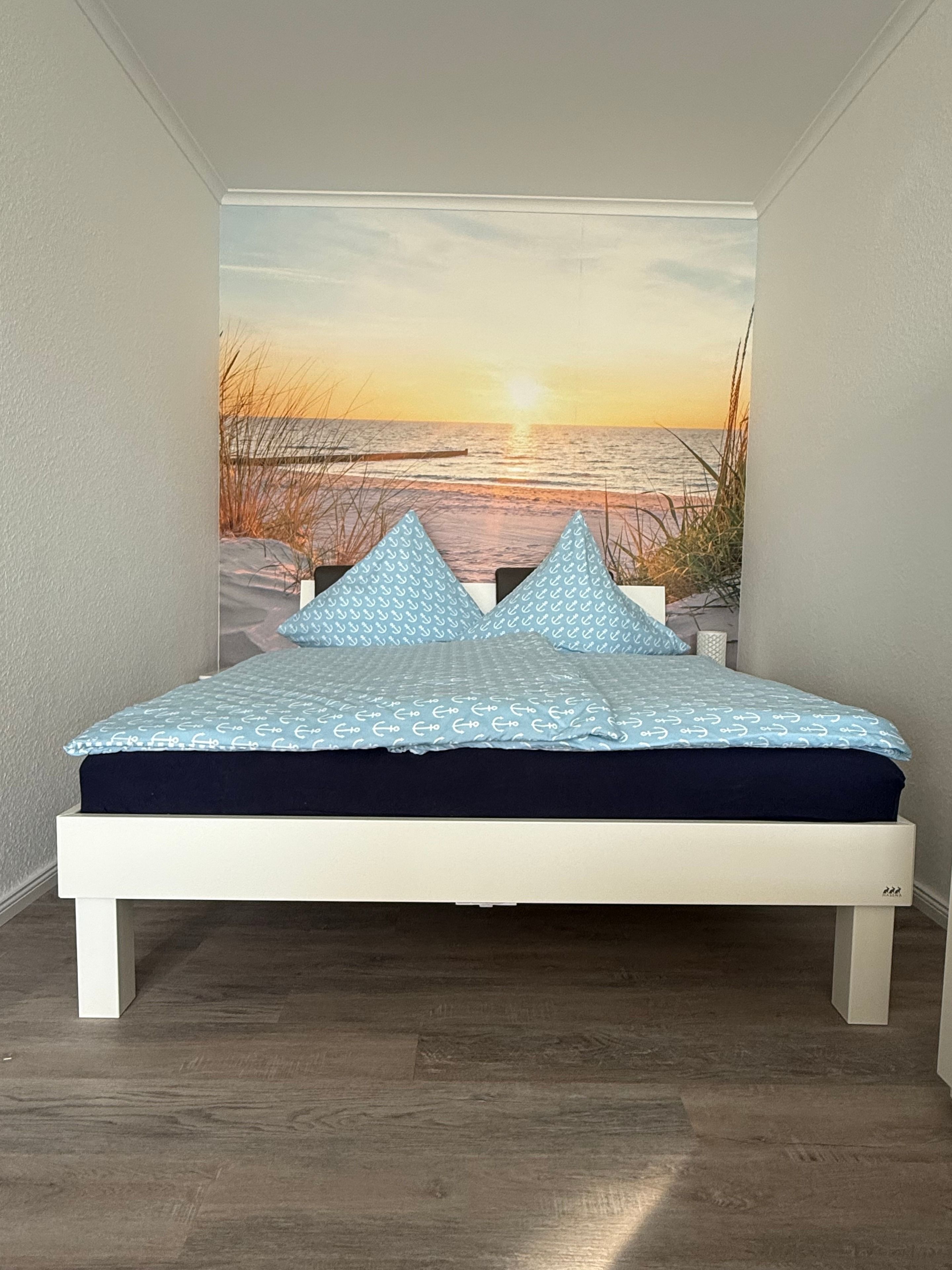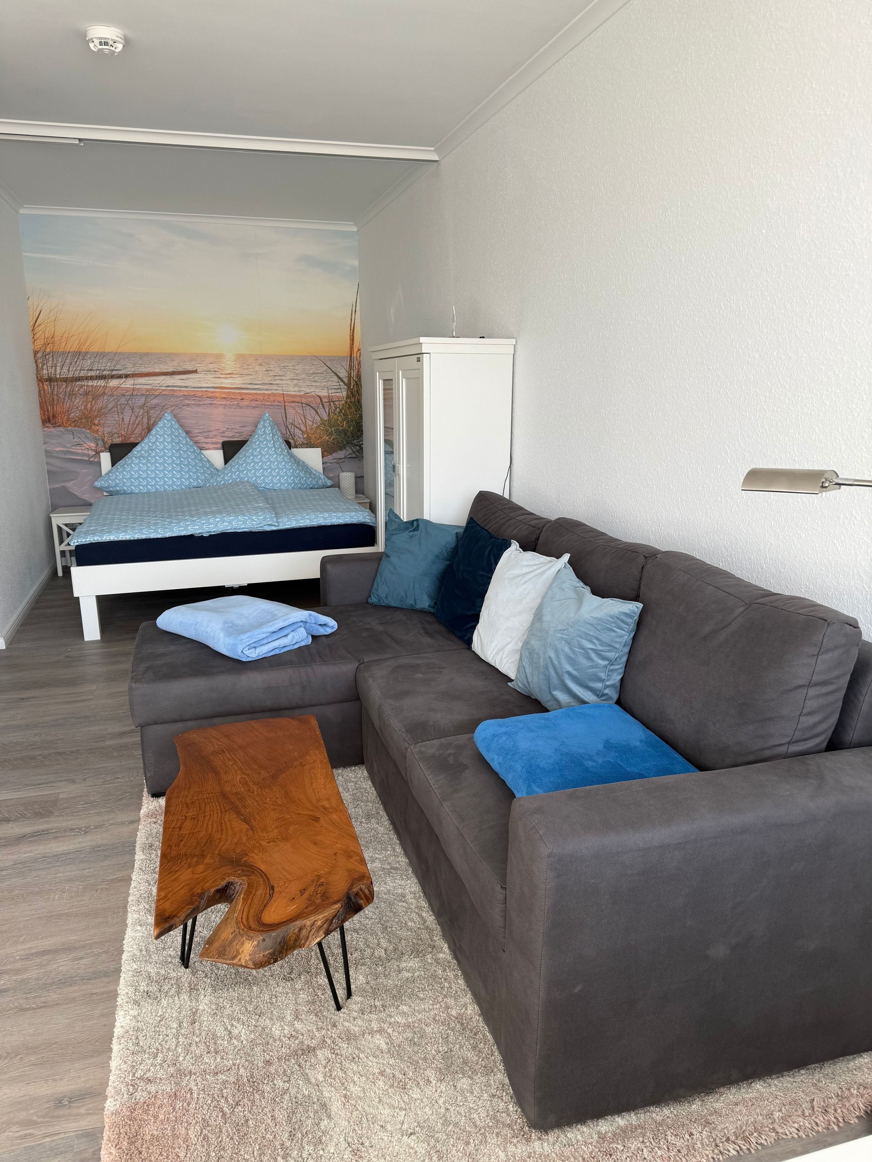 Im gemütlichen Wohn-Schlafraum befinden sich ein Doppelbett (160x200). Vor dem Fenster steht ein großer Esstisch mit 4 Stühlen für Sie bereit, so dass Sie den Ausblick genießen können.
