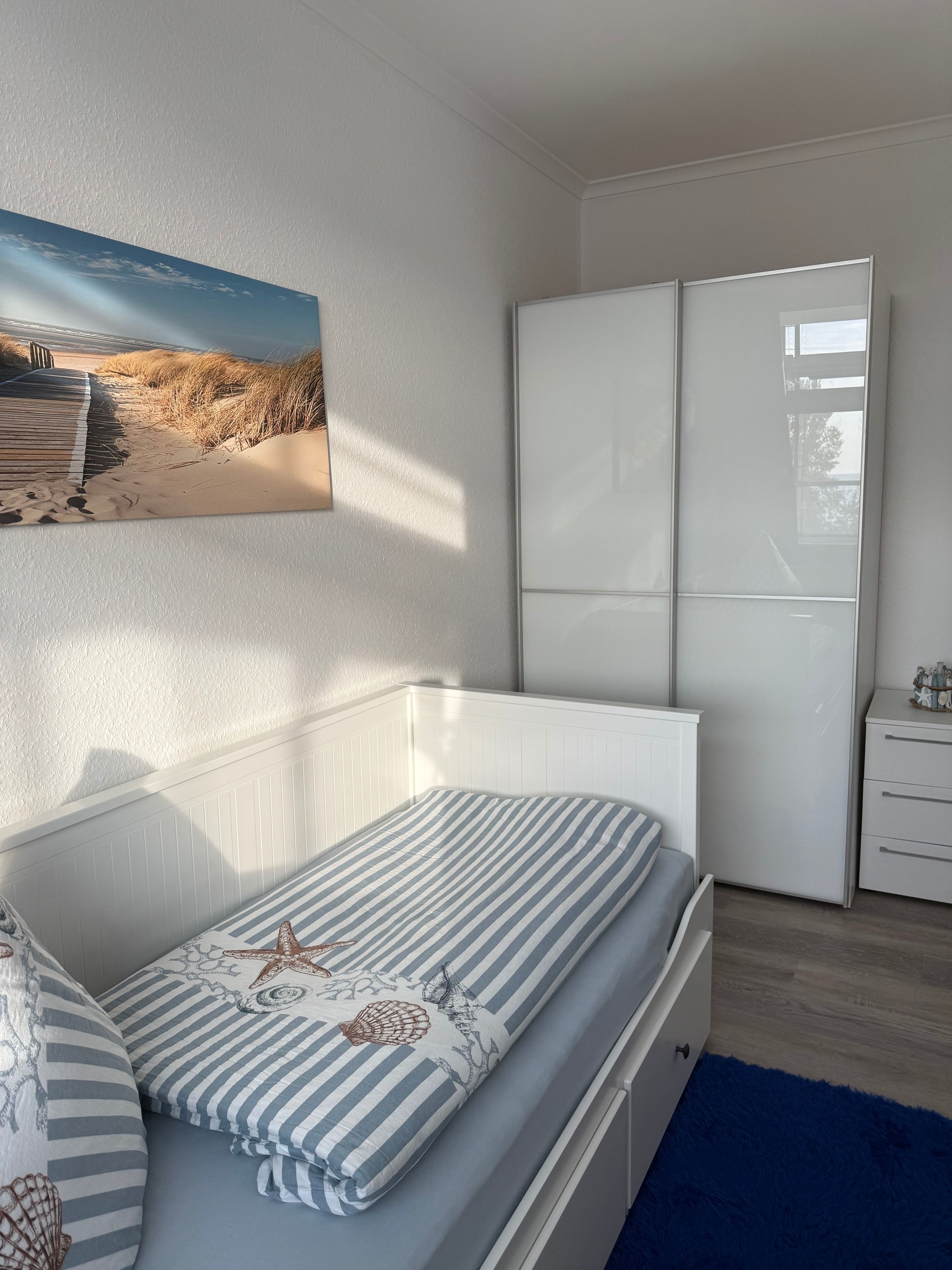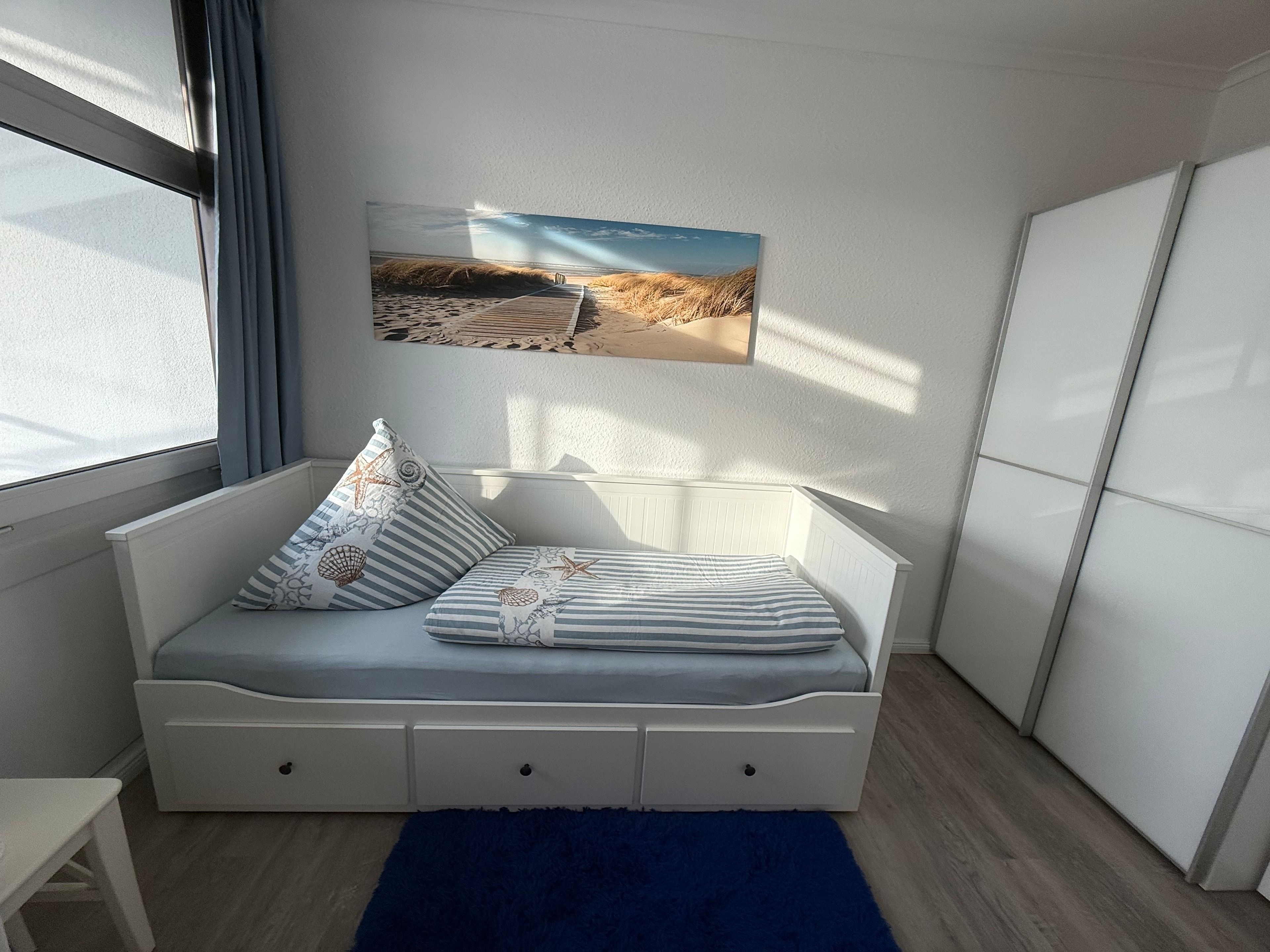 Im separaten Kinderzimmer gibt es ein Einzelbett (80x200) was man ausziehen kann für 2 Personen (160x200) und ein Kleiderschrank.
