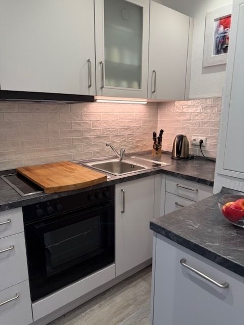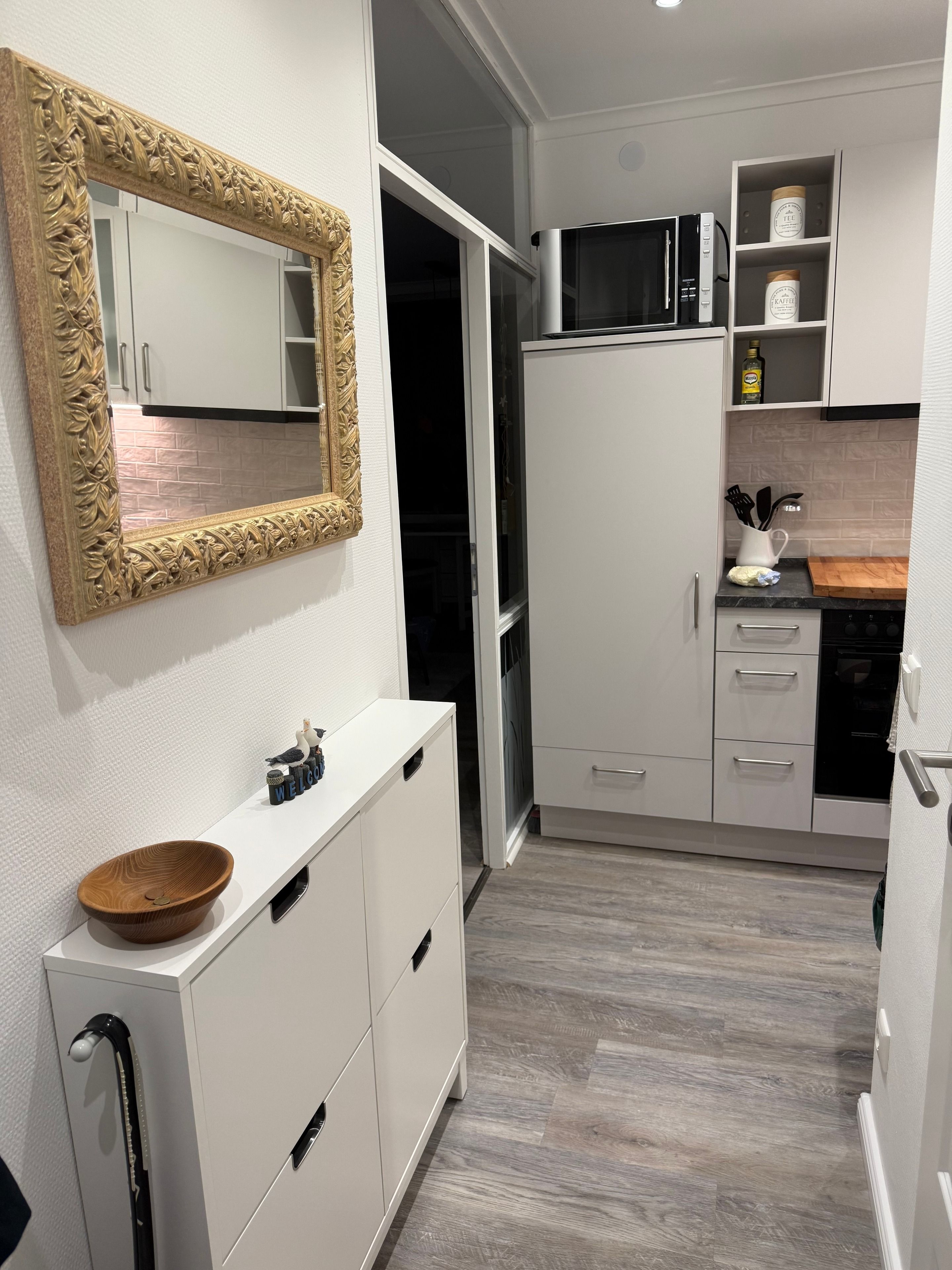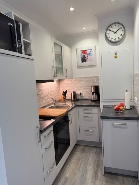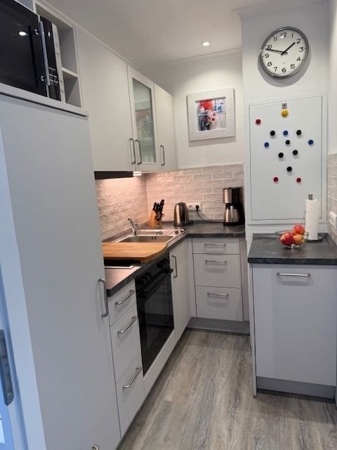 Vom Flur aus kommen Sie direkt in die Küche, die mit einem großen Geschirrspüler und einer Mikrowelle mit Grillfunktion ausgestattet ist. Sie finden dort fast alles was man zum Kochen braucht.