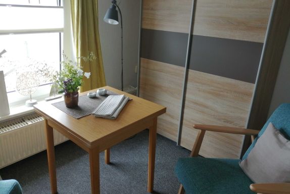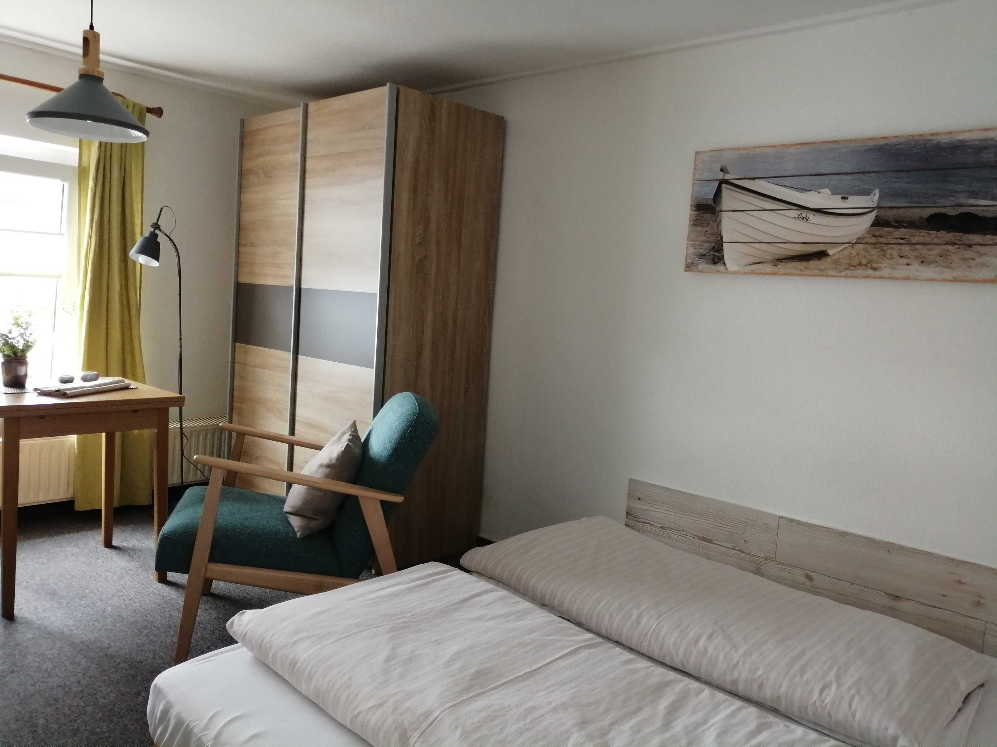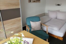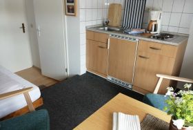 Das Ferienzimmer (Nichtraucher) ist 15 m² groß und ist ein kombiniertes Wohn-Schlaf-Zimmer (Doppelbett, 2 Sessel, Tisch, Sat-TV) mit integrierter Mini-Küche (2 Kochfelder, Kaffeemaschine, Kühlschrank, Toaster, Wasserkocher, Spüle). Dazu gehört ein Bad mit Dusche und WC. Bettwäsche (Erstausstattung) und Endreinigung sind inklusive. Handtücher bitte mitbringen. (Achtung: Die Treppe zum Zimmer hat an einer Stelle eine niedrige Durchgangshöhe ca. 1,70m) Keine Haustiere!