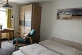 Das Ferienzimmer (Nichtraucher) hat eine Größe von 15 qm und ist gemütlich eingerichtet. Es befindet sich in der ersten Etage im Nebengebäude des Vermieters. Es ist ein kombiniertes Wohn-Schlaf-Zimmer mit integrierter Miniküche und einem Bad mit Dusche/WC. Im Garten gibt es eine gemeinschaftliche Sitzecke mit Grill. Haustiere können nicht beherbergt werden.