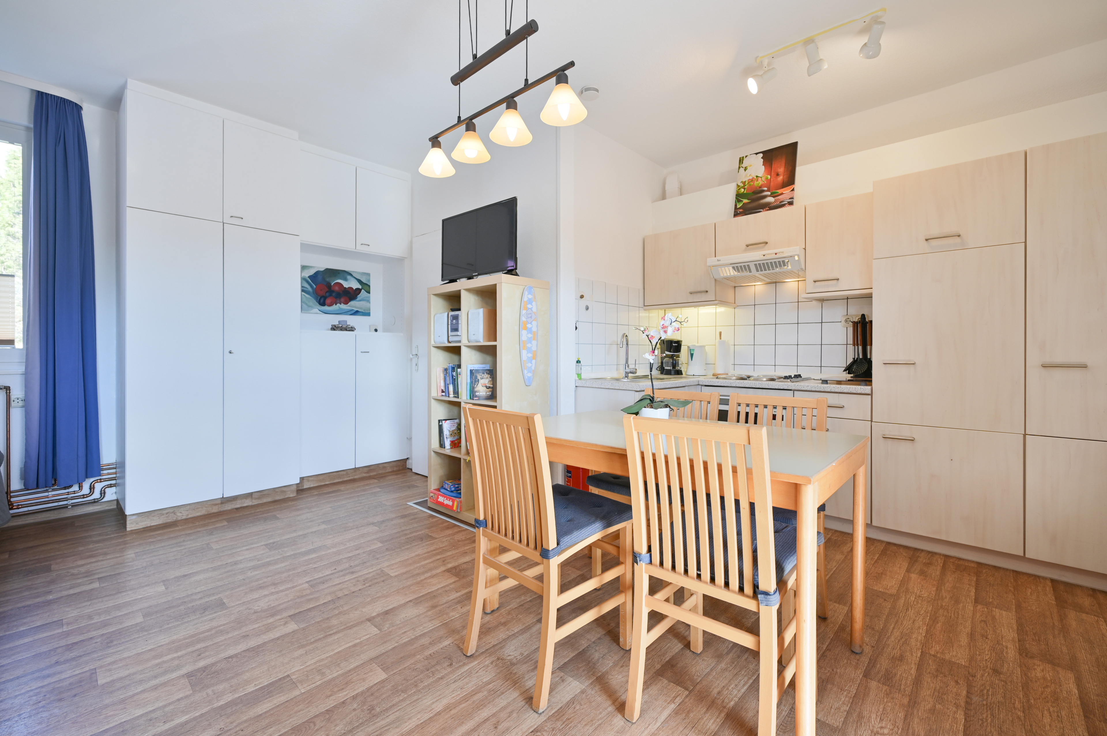 Der Wohn-Schlafbereich verfügt über eine Couch, TV-Möbel mit Flachbild-TV, eine integrierte Küchenzeile, einen Essbereich mit 4 Stühlen und ein Schrank-Doppelbett.