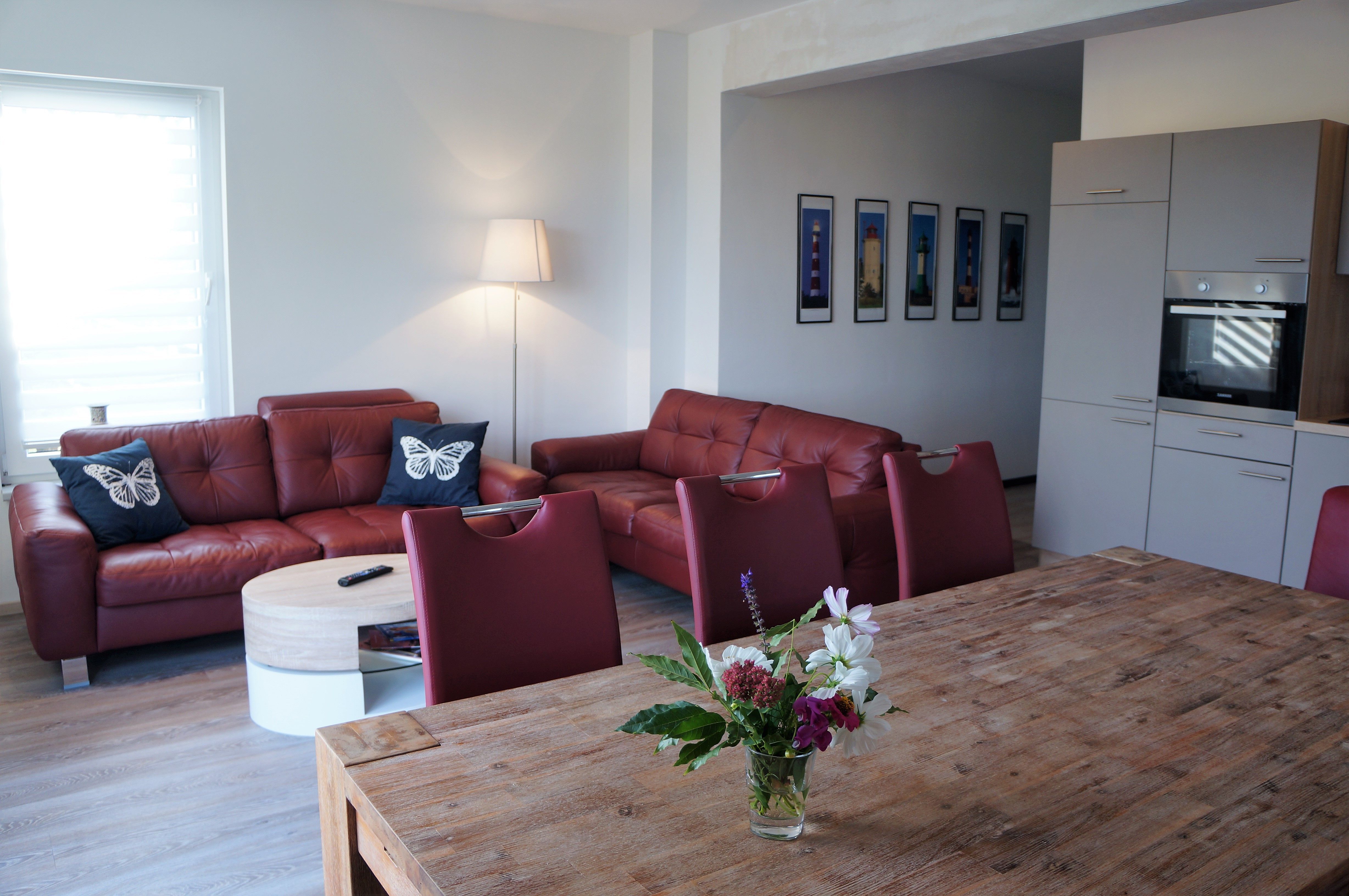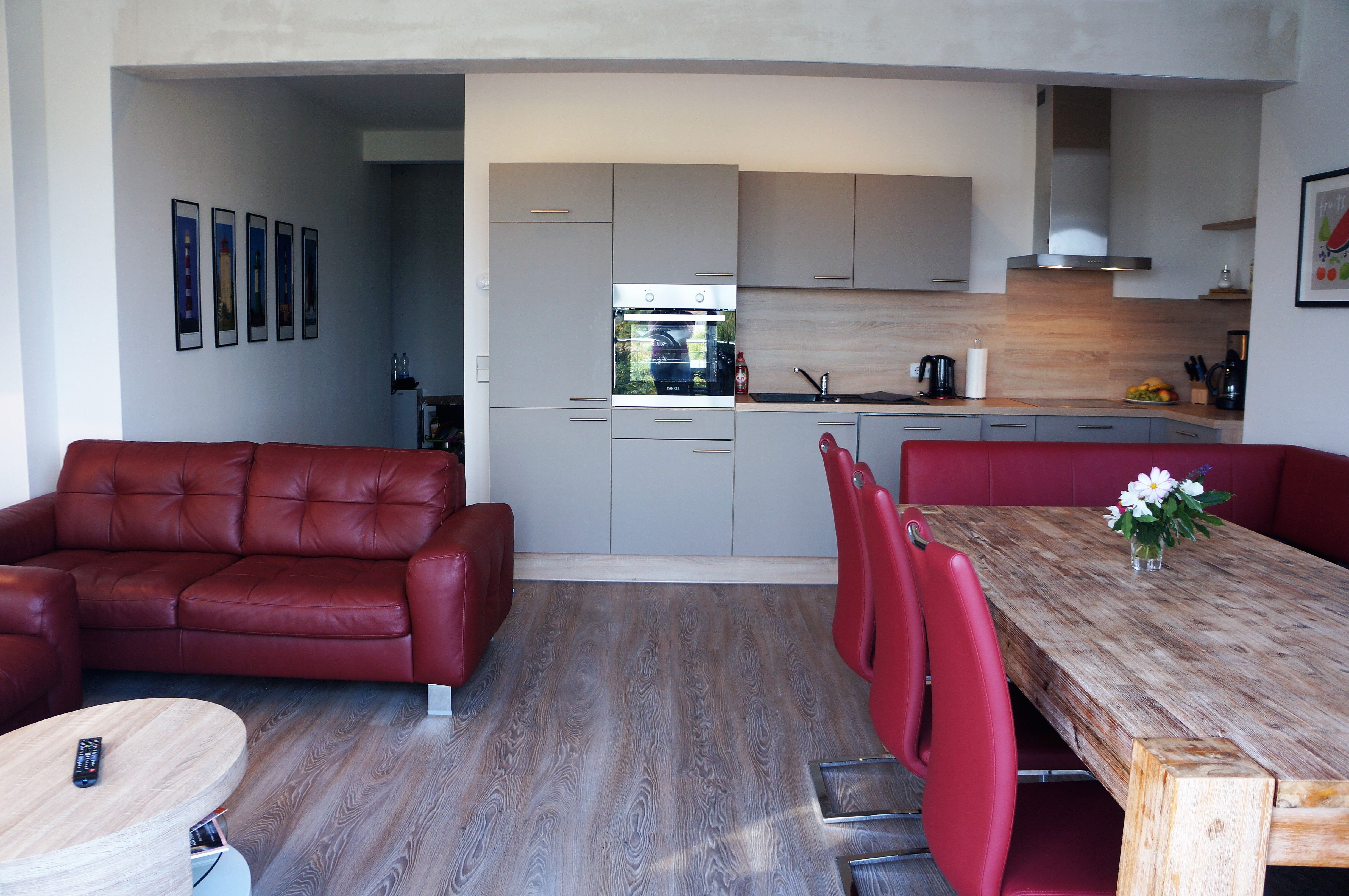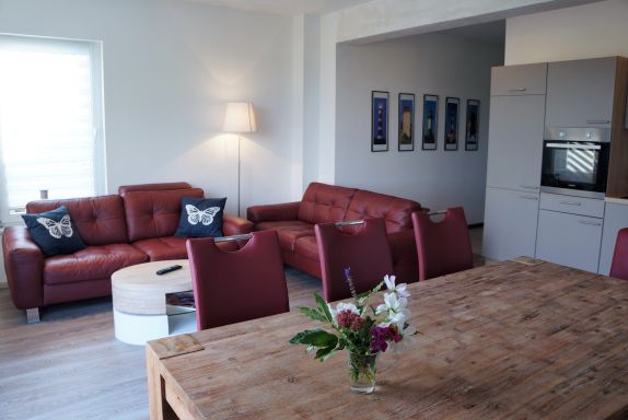 Der Wohnraum hat: offene Küche, Esstisch, Flachbildfernseher, Sitzecke und zwei große Sofas.