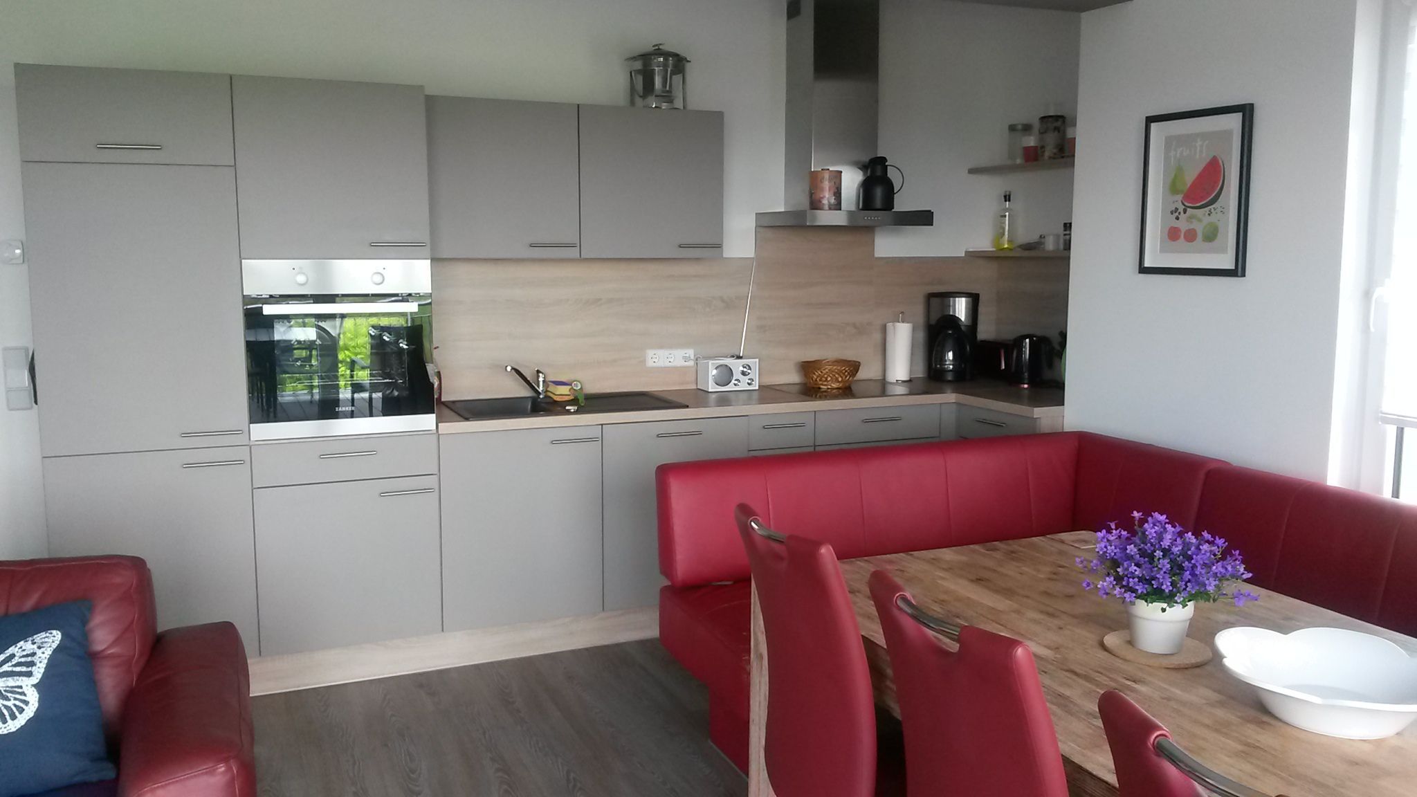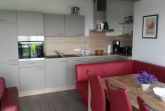Die Küche ist mit Spülmaschine, Backofen, Cerankochfeld mit Dunstabzugshaube und Kühlschrank mit Gefrierfächern, Wasserkocher, Kaffeemaschine und Toaster ausgestattet.