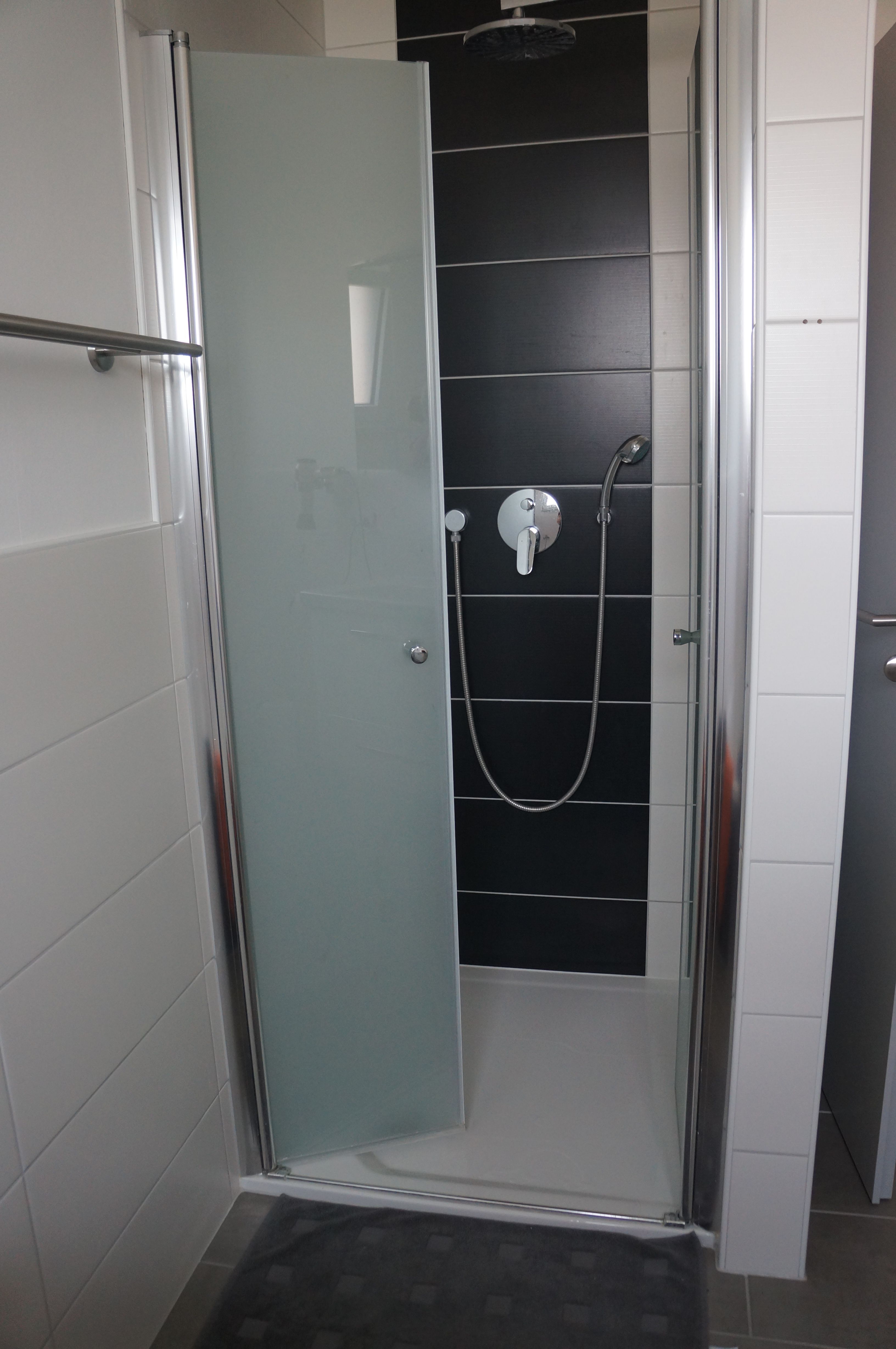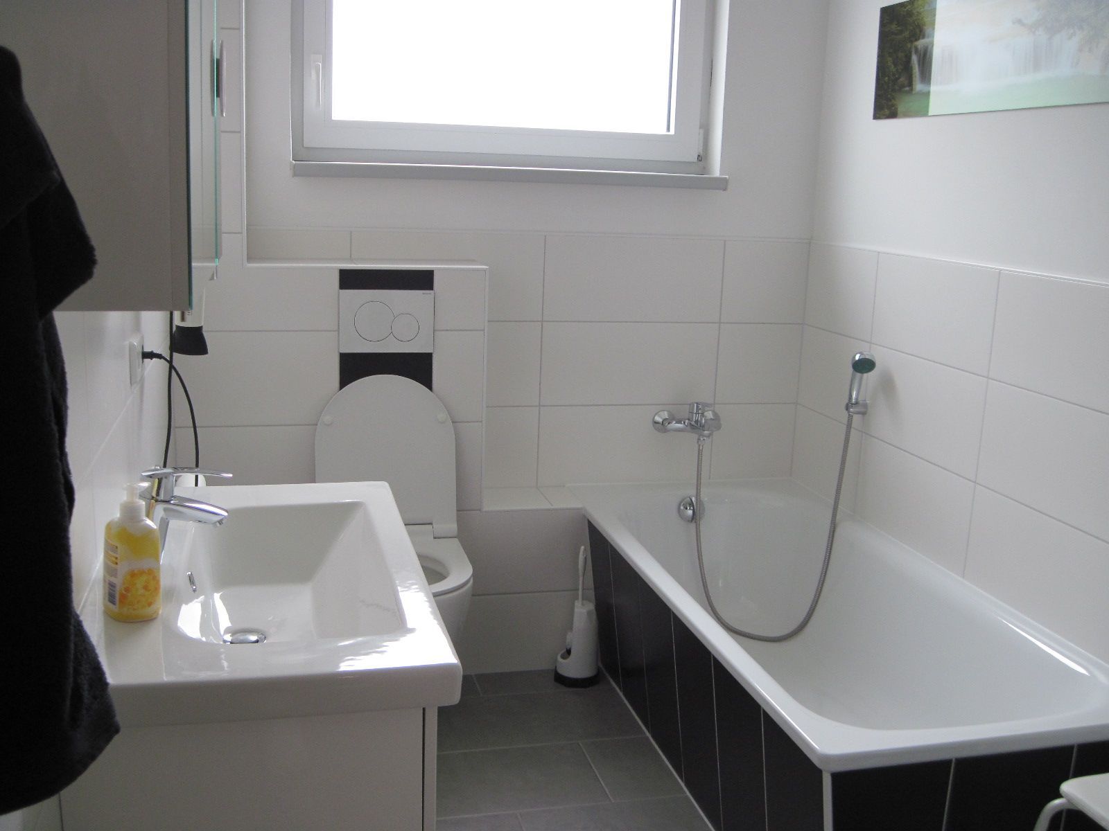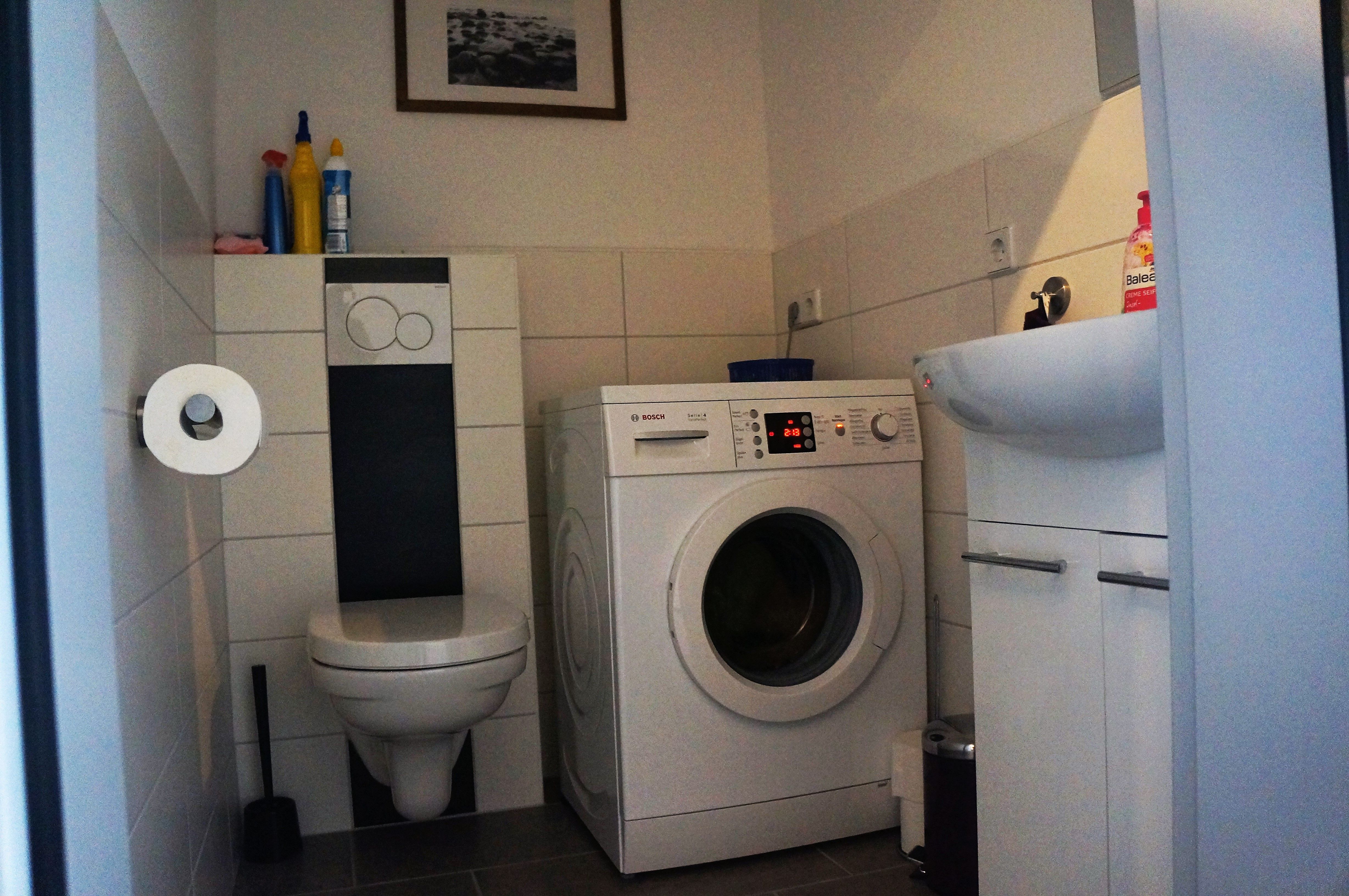 Ein modernes Badezimmer mit Badewanne und getrennter Dusche. Separates Gäste-WC sowie eine Waschmaschine.