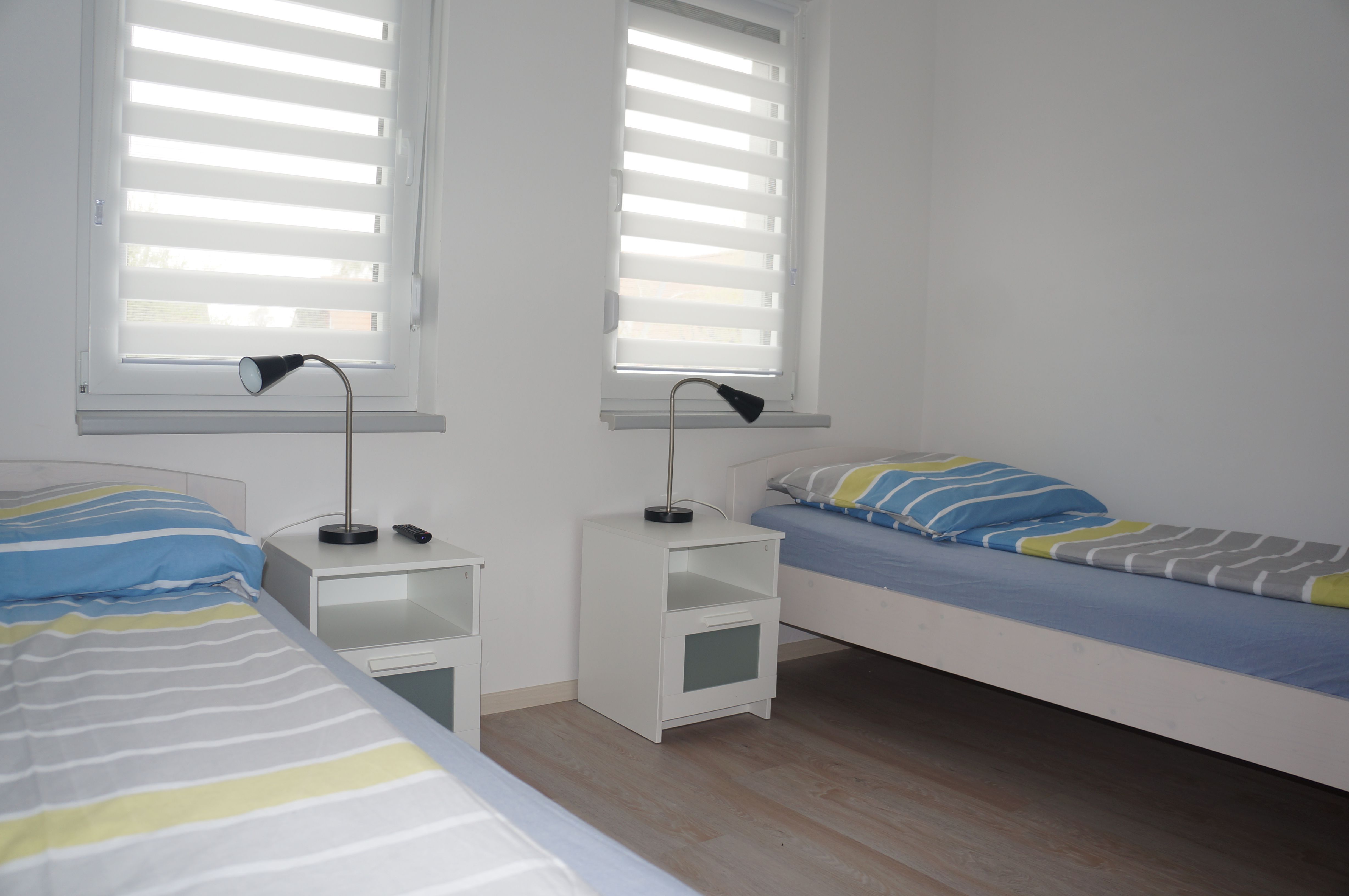Drei Schlafzimmer: ein Schlafzimmer mit Doppelbett, ein Schlafzimmer mit zwei Einzelbetten und ein Schlafzimmer mit einem Stockbett; in jedem Zimmer ist ein Flachbildfernseher.