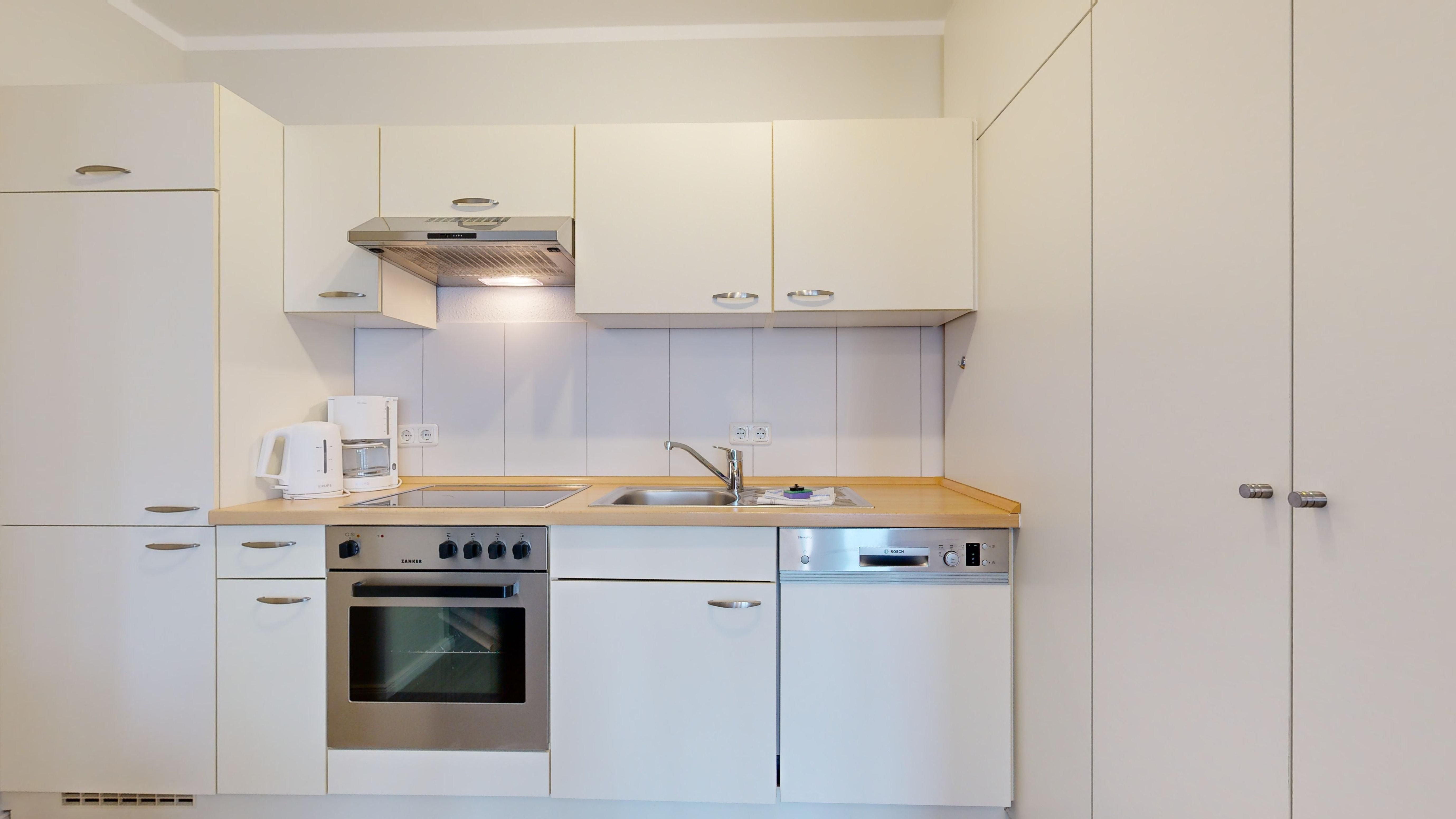 Küche mit Ceranfeld, Kühlschrank mit Gefrierfach, Backofen, Spülmaschine, Toaster, Wasserkocher, Kaffeemaschine