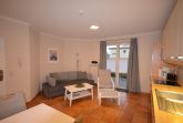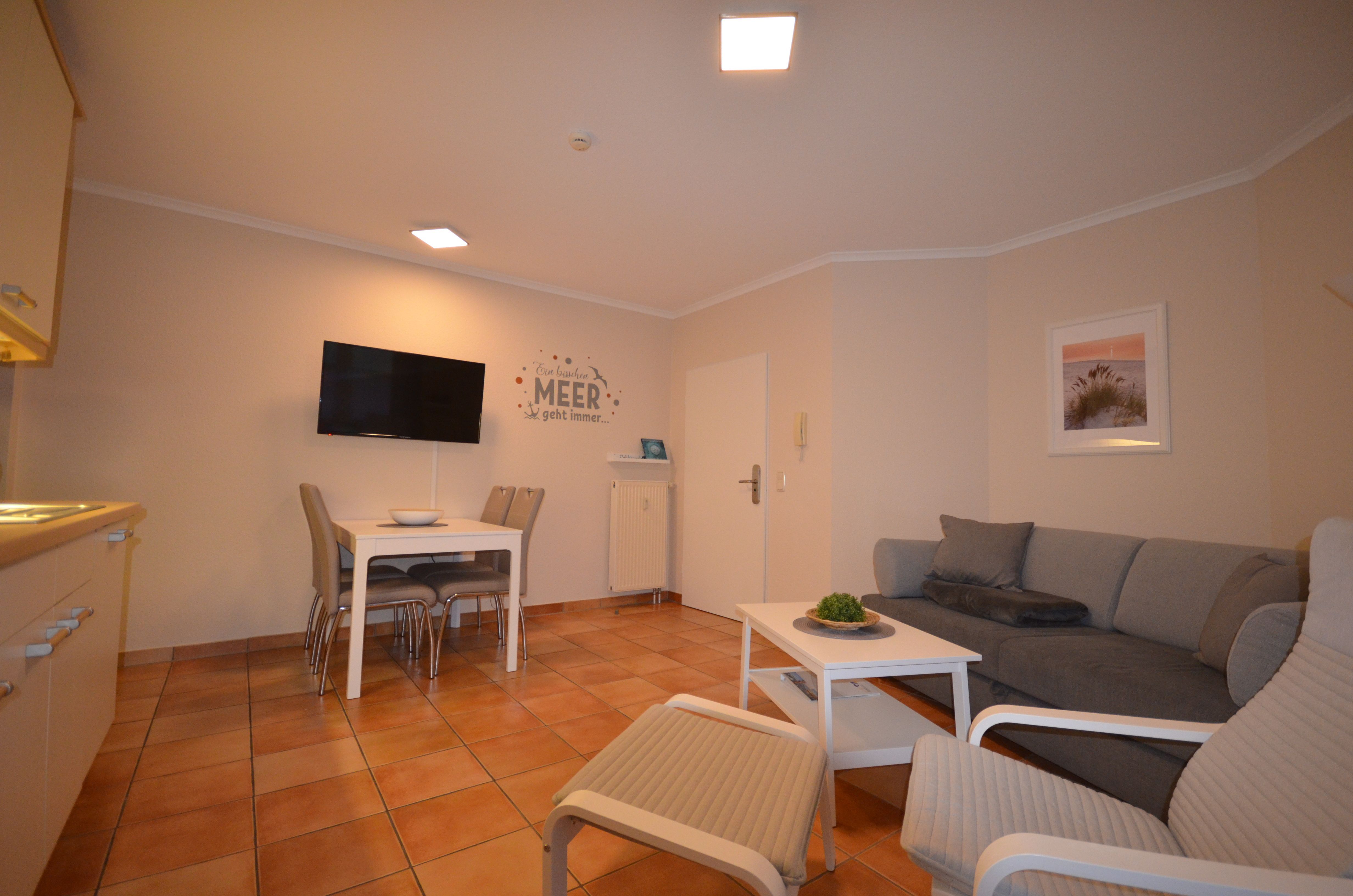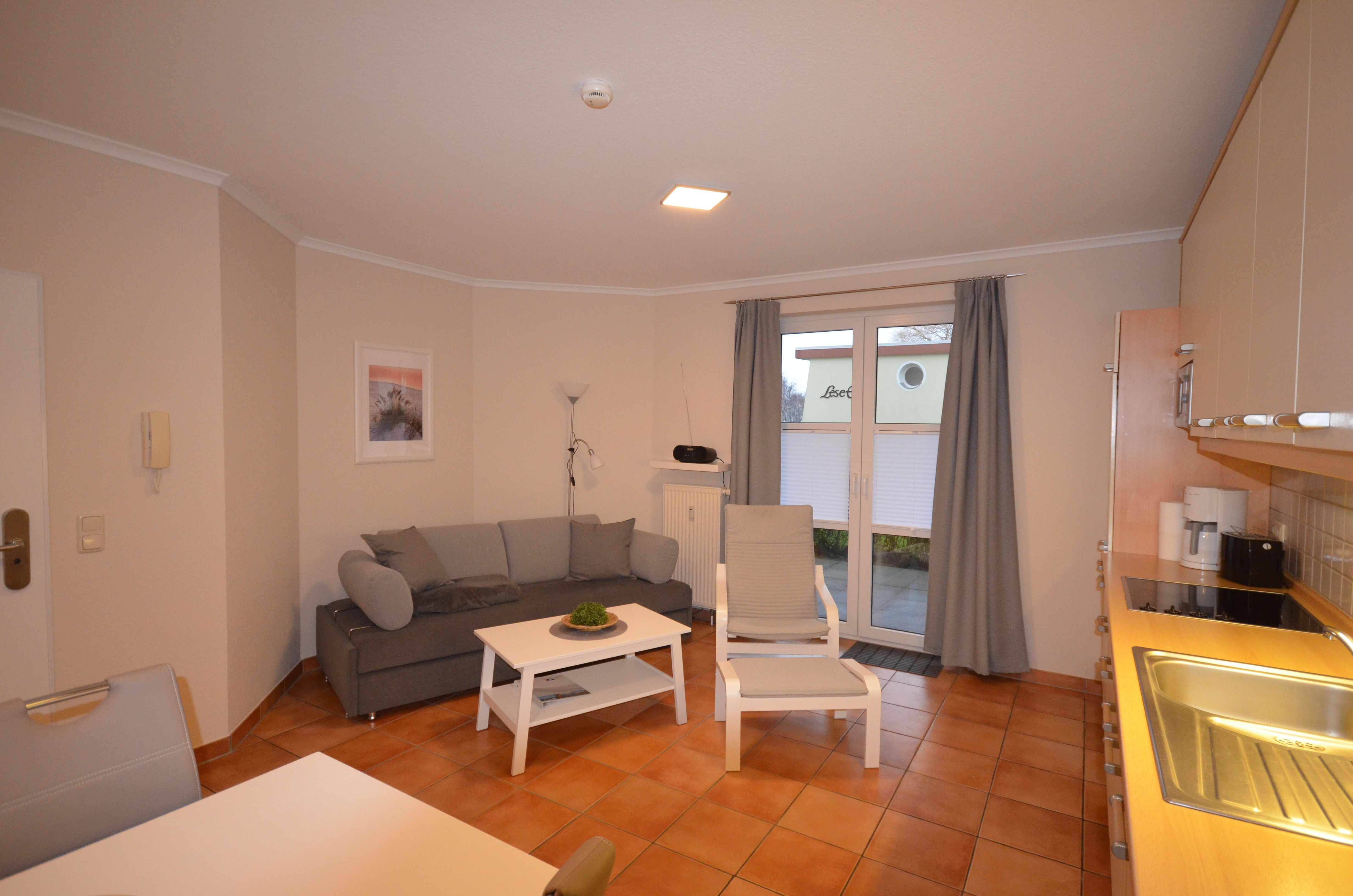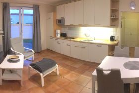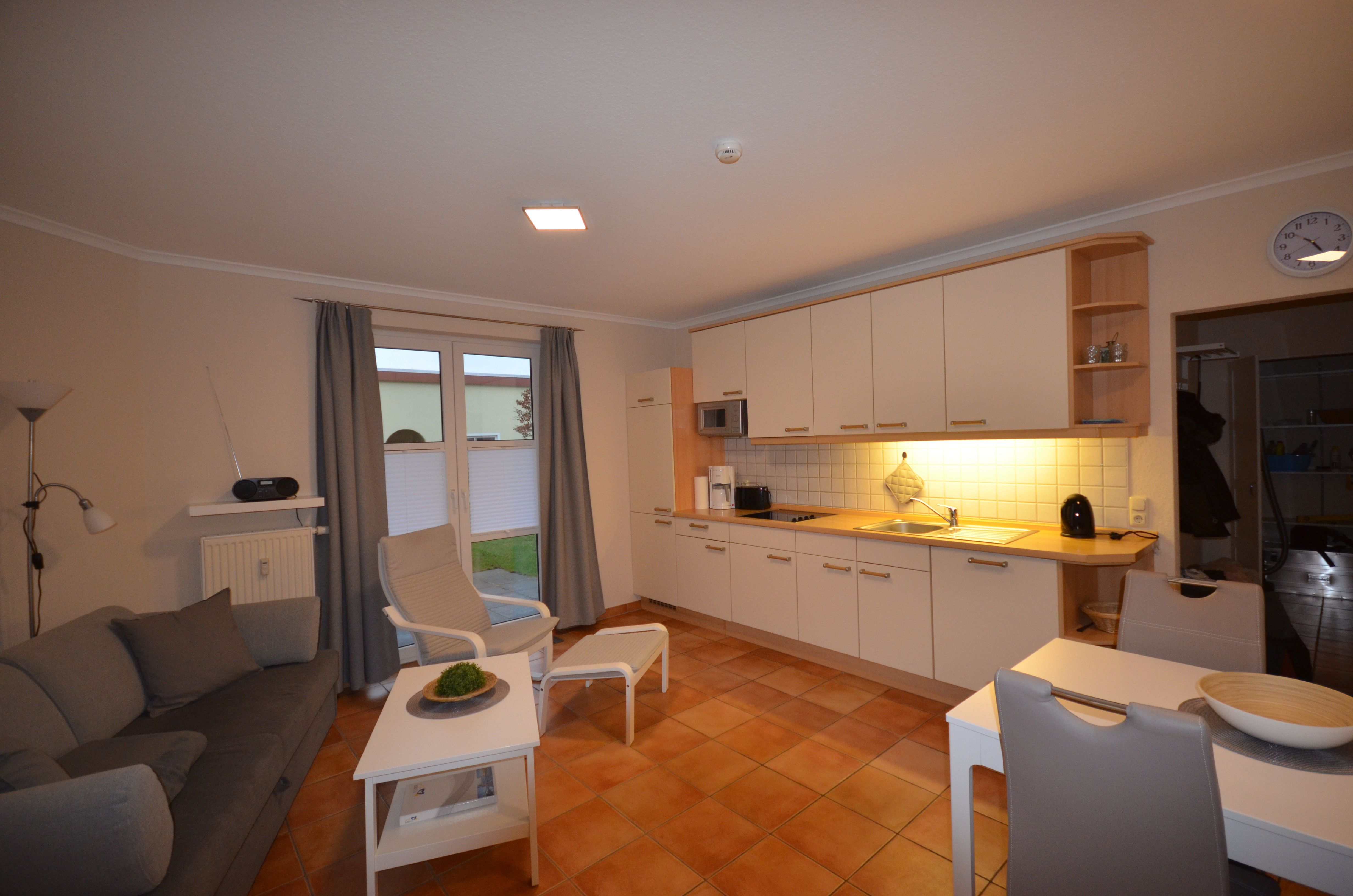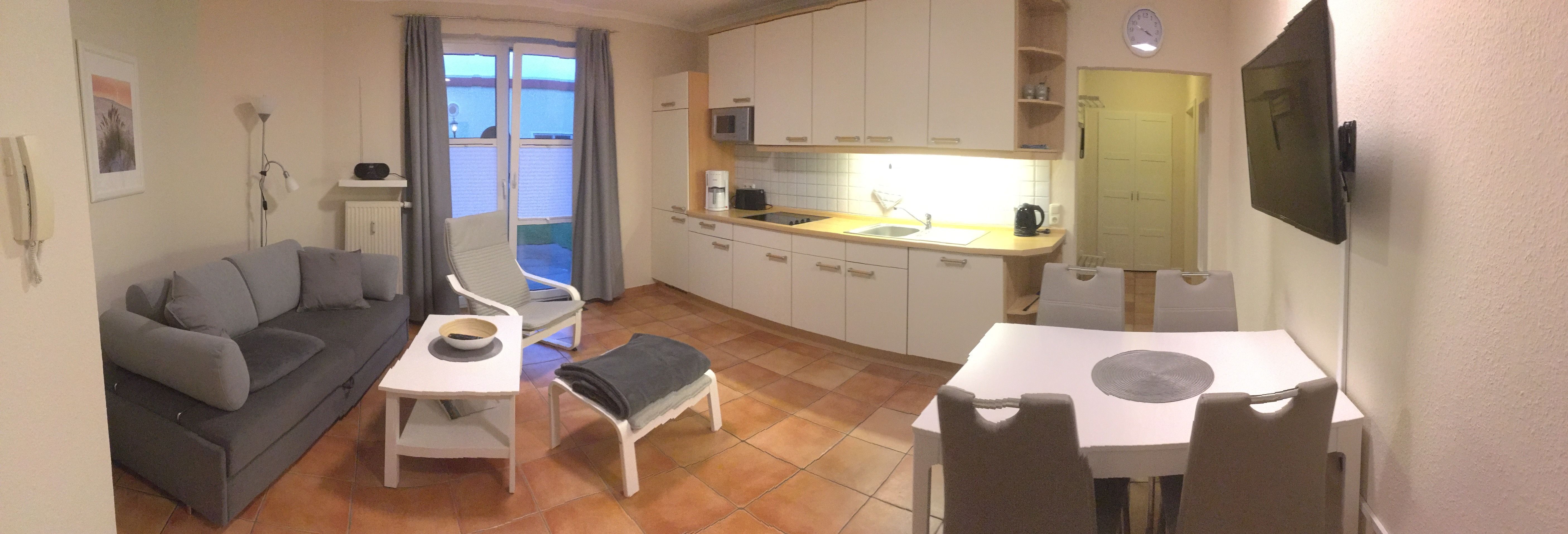 Kleine moderne Ferienwohnung mit Terrasse, einem Schlafzimmer sowie einer Schlafcouch im Wohn-Essbereich für insgesamt 4 Personen. In der Küchenzeile stehen neben der Spülmaschine und dem Herd natürlich auch eine Mikrowelle, eine Kaffee- und Senseo-Kaffeemaschine zur Verfügung. Fernseher, Radio, sind ebenso vorhanden, wie kostenfreies WLAN.