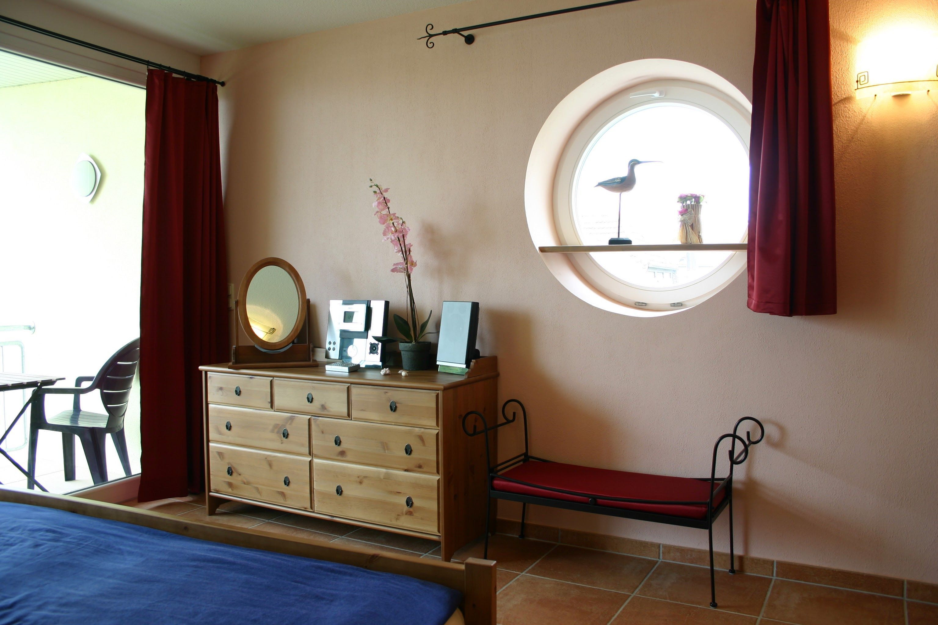 Es handelt sich um die ruhigste und abgeschiedenste der beiden Außenwohnungen mit markanten Bullaugen-Fenstern. Die FeWo ist eine von acht modernen Ferienapartments des historischen Lesecafés eines einstiges DDR-Cafés mit Bücherverleih, das ausbrannte und vollständig restauriert wurde.
