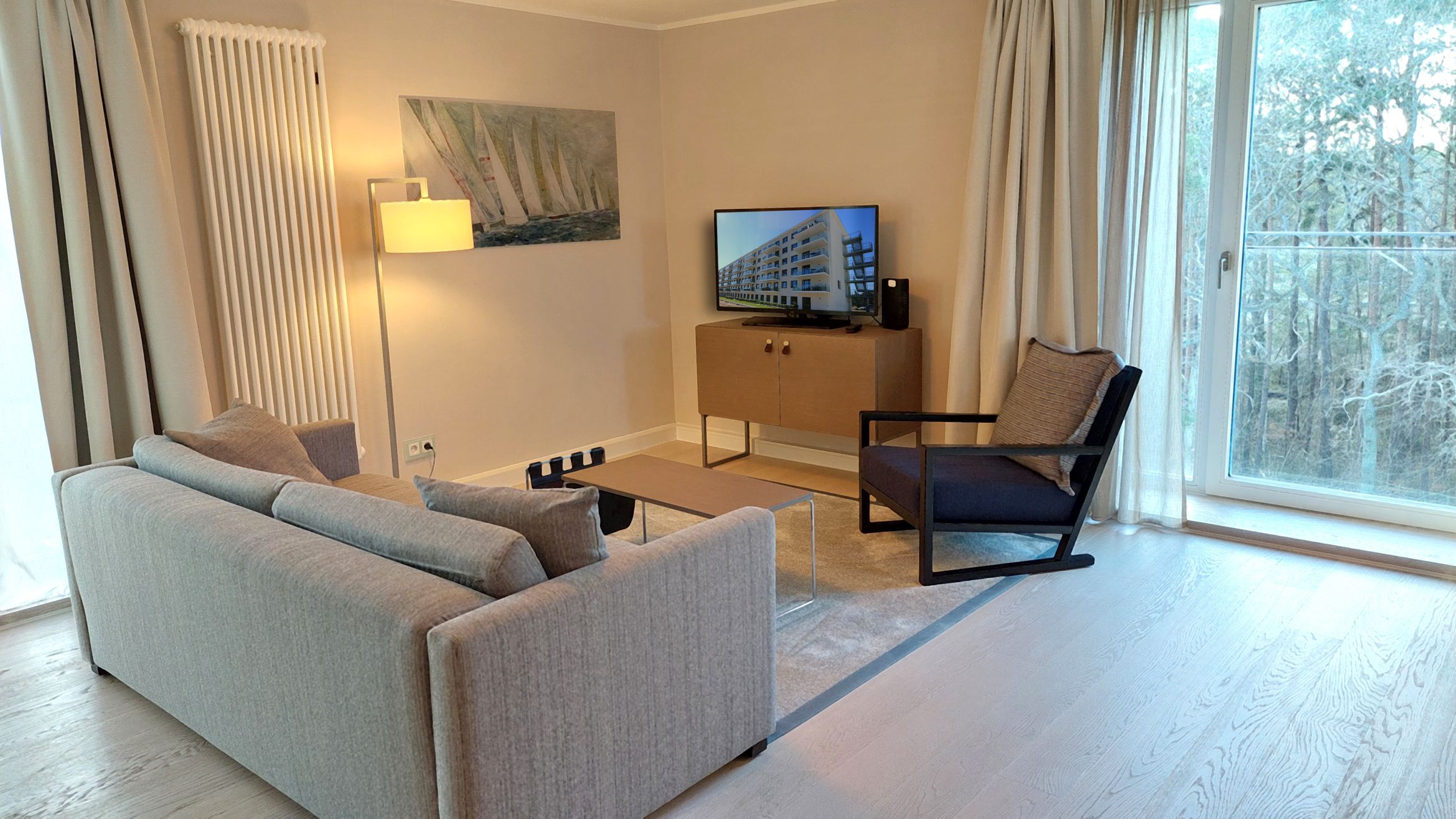 Die helle 2-Raum-Nichtaucherwohnung 104RB519 befindet im 5. Obergeschoss des Aufgangs 105 (Block I) und ist bequem per Fahrstuhl zu erreichen. Das Apartment ist zur Landseite ausgerichtet und somit, durch die zahlreichen fußhohen Fenster (franz. Balkone) den ganzen Tag lichtdurchflutet. Diese Unterkunft ist für 2 Personen optimal ausgelegt, aber auch 1-2 zusätzliche Kinder würden hier problemlos unterkommen.
