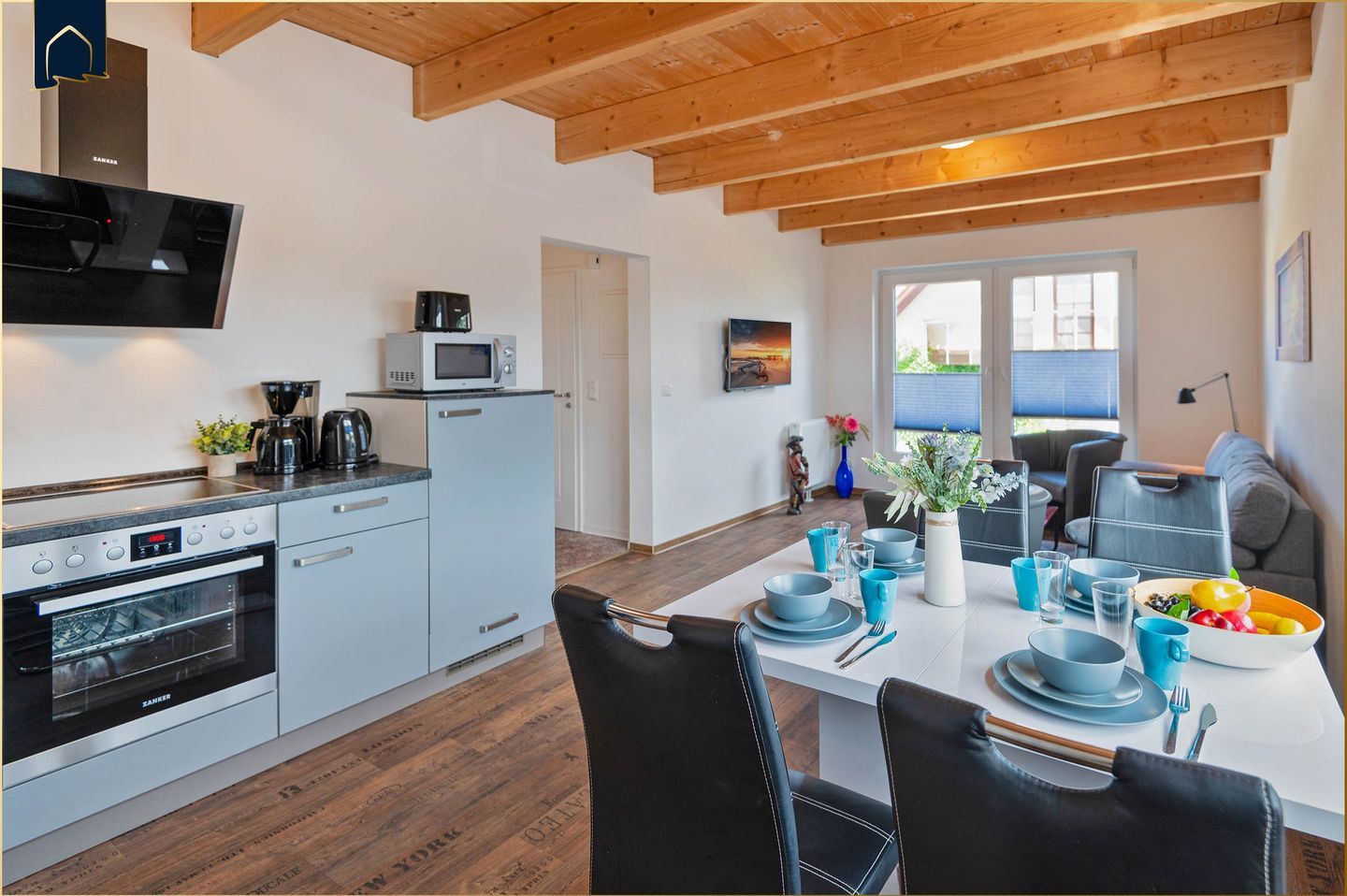 Die Ferienwohnung bietet ein separates Schlafzimmer mit Schlafgelegenheit für zwei Personen, ein modernes Badezimmer mit Dusche sowie einen offenen Wohn- und Essbereich. Die Küche ist funktional ausgestattet mit Herd, Backofen, Kühlschrank, Kaffeemaschine, Mikrowelle, Toaster und Wasserkocher – ideal, um sich selbst zu versorgen. Für gemütliche Abende steht ein TV zur Verfügung, und das schnelle WLAN sorgt dafür, dass Sie auch online bestens verbunden bleiben. Alle Fenster sind mit Sichtschutz und Fliegengittern ausgestattet – für ungestörte Nächte ohne Insekten.