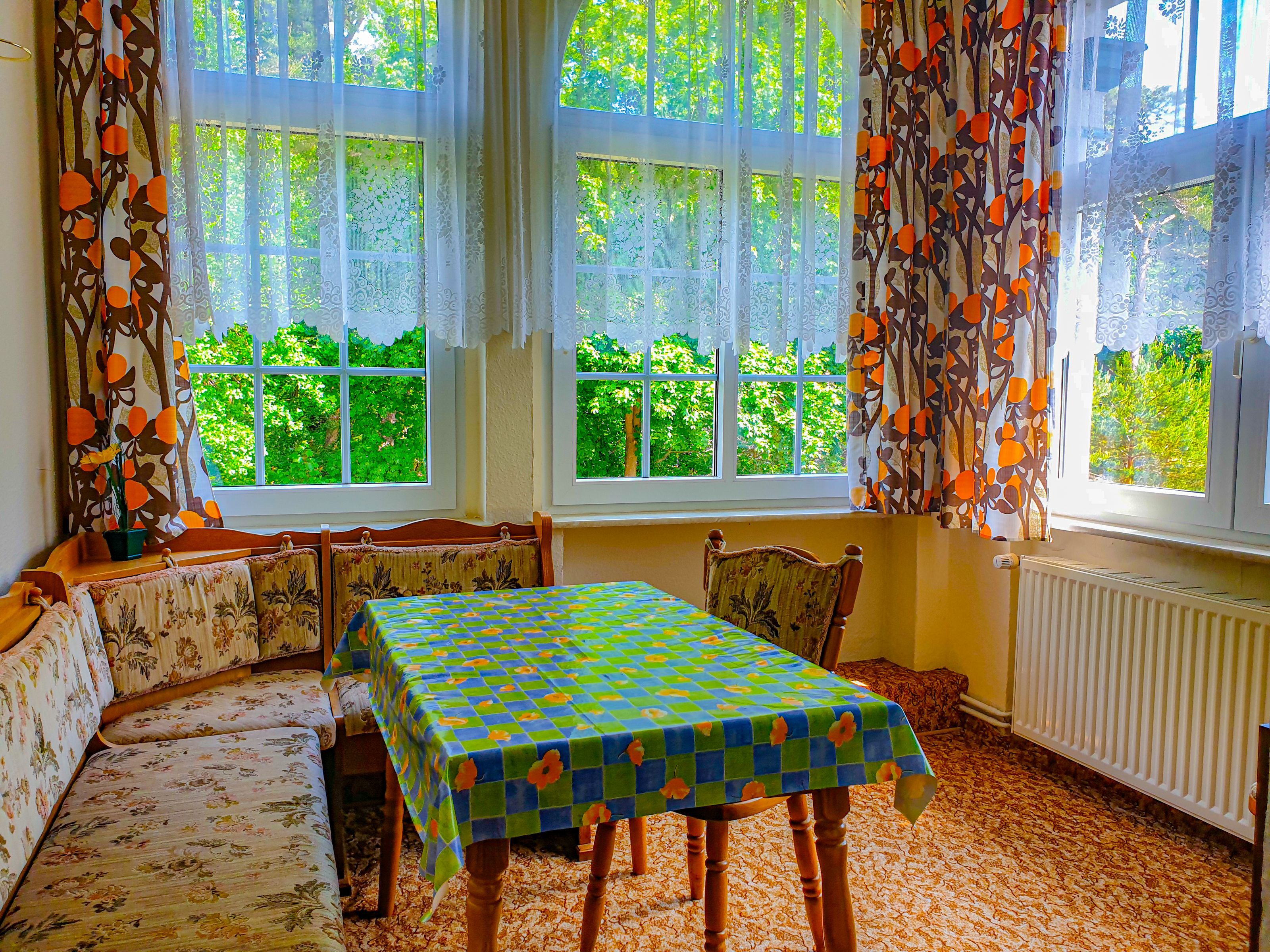 Unsere über 100 Jahre alte Villa versprüht ihren ganz eigenen Charme. Die historischen Dielen können an einigen Stellen sanft knarren - ein liebevolles Detail, das den Charakter des Hauses unterstreicht. Bad, Küche und Wohnzimmer teilen sich einen gemeinschaftlichen Flur mit der benachbarten Ferienwohnung. Im hinteren Bereich des Grundstücks lädt eine gemütliche Terrasse mit Sitzmöbeln und Grill zum Verweilen ein - perfekt für laue Sommernächte.