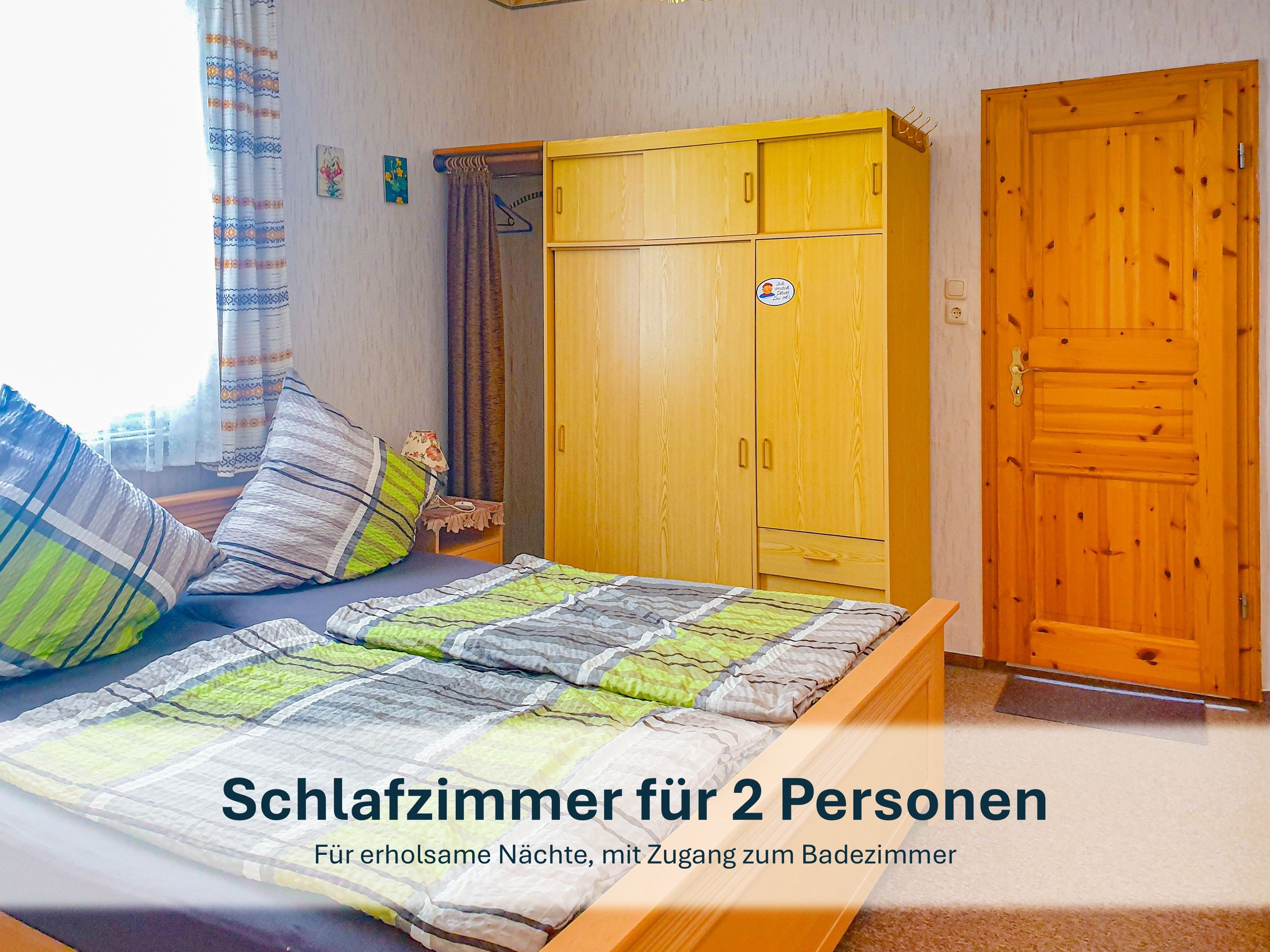 Vom Wohnbereich aus gelangen Sie in das Schlafzimmer, das mit einem bequemen Doppelbett ausgestattet ist - der perfekte Ort für erholsame Nächte und süße Träume. Falls zusätzliches Platzangebot benötigt wird, können Sie die Schlafcouch im Wohnzimmer als Aufbettungsmöglichkeit nutzen.