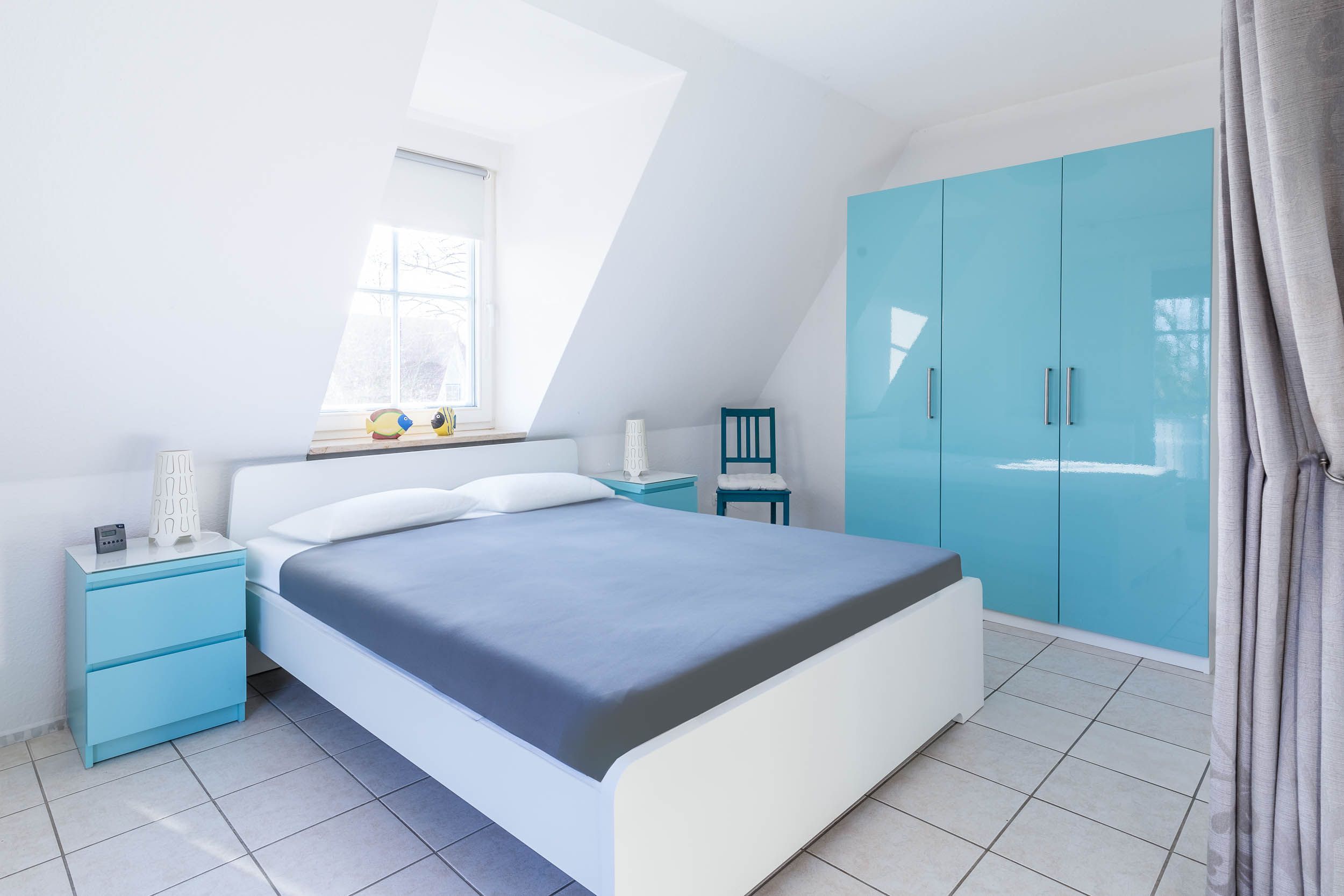 Das Schlafzimmer verfügt über ein Doppelbett und einen großen Kleiderschrank.