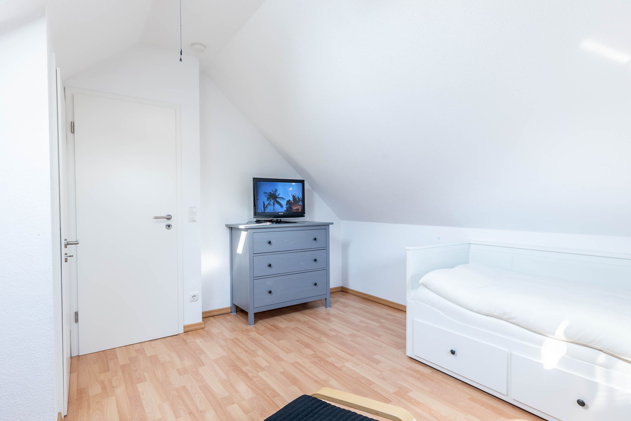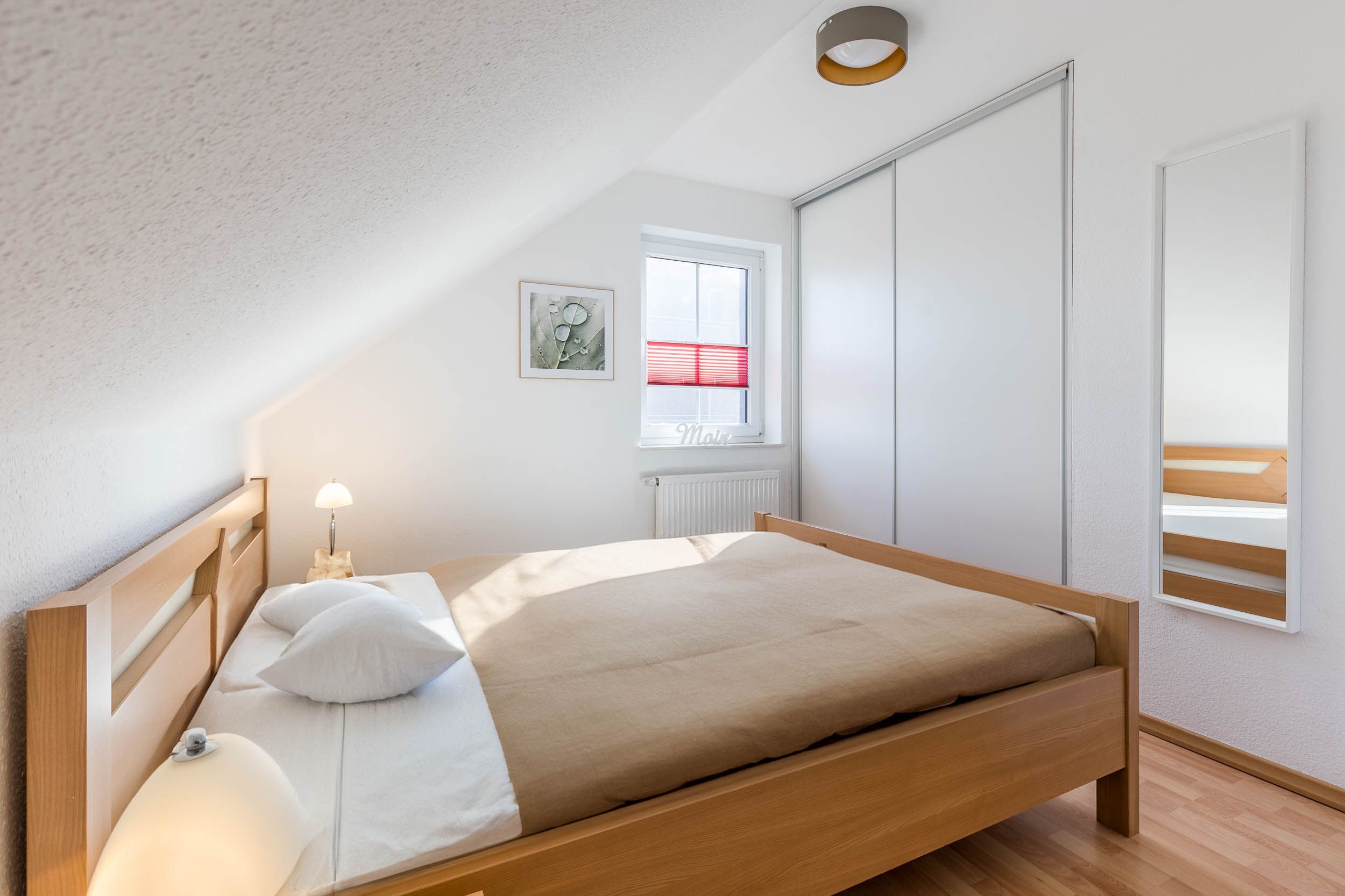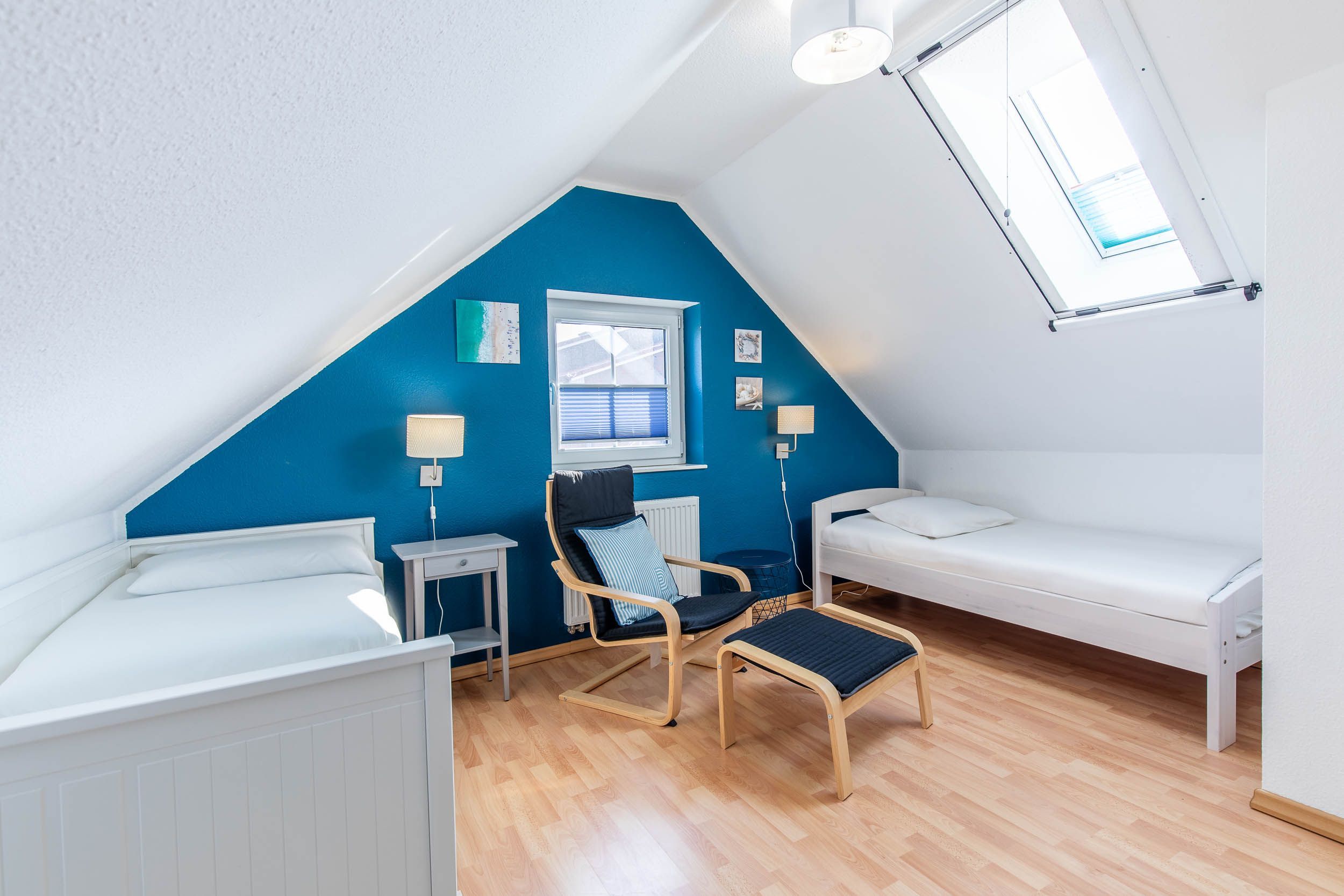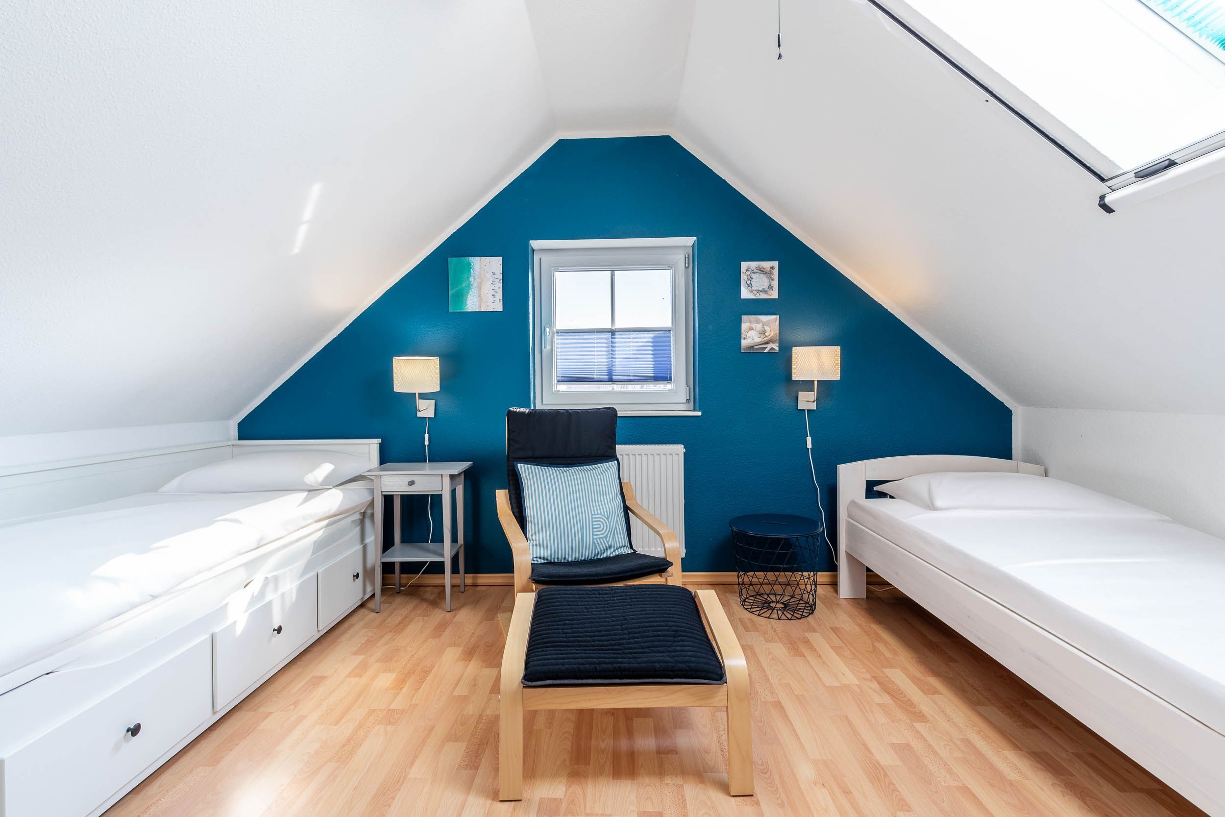 Das 1. Obergeschoss und das Dachgeschoss bieten Platz für bis zu 4 Erwachsene und 1 Kind auf 65qm. Hier befindet sich ein gemütlicher Wohnbereich mit Sofalandschaft, Flatscreen-SAT-TV und Musikanlage. Das Schlafzimmer verfügt über ein Doppelbett und im Dachgeschoss gibt es ein Gästezimmer zwei Einzelbetten sowie einem separaten Ausziehbett und eigenem Flatscreen-TV. Auch hier ist ausreichend Stauraum für Kleidung vorhanden. Das zweite Badezimmer verfügt über eine Dusche, WC und Waschmaschine. Im Dachgeschoss steht außerdem eine Sauna gegen Gebühr zur Verfügung.