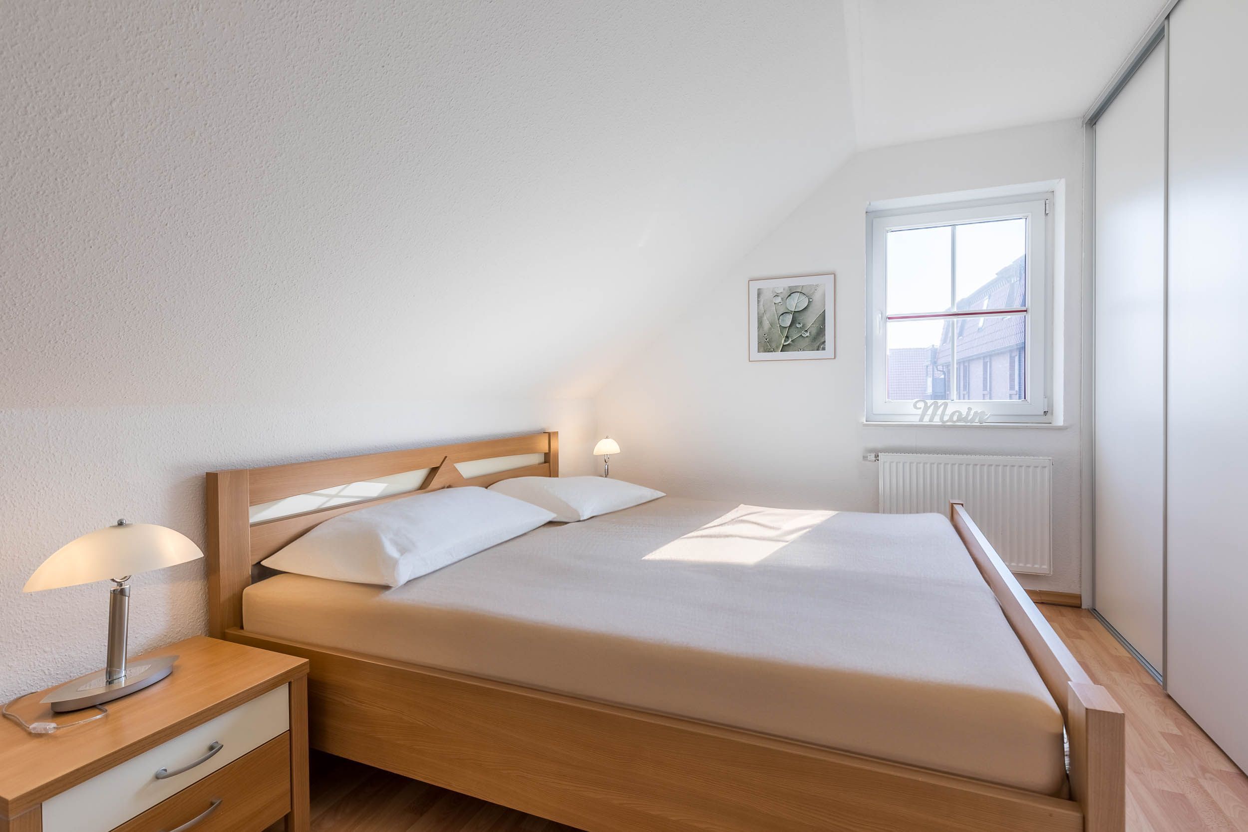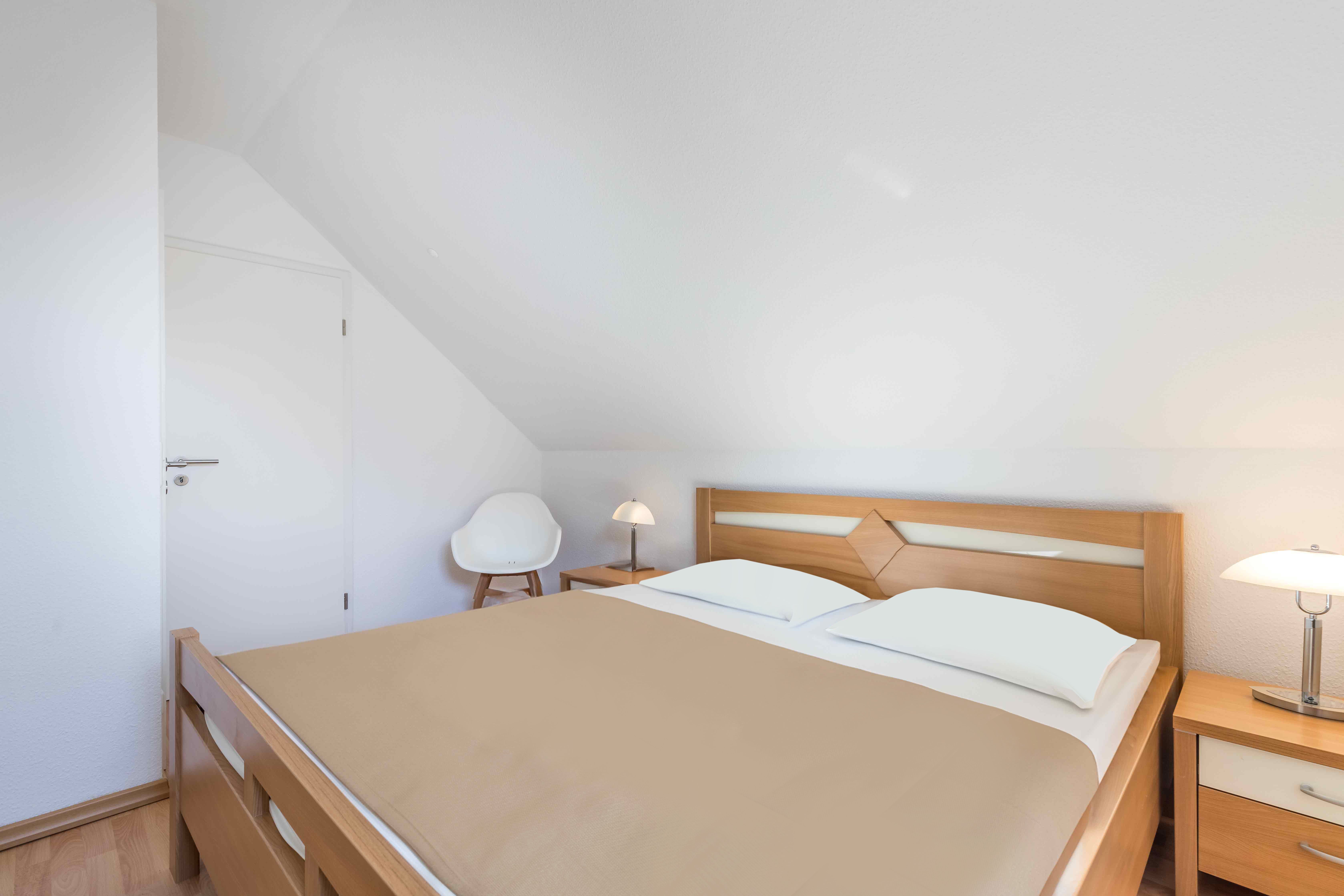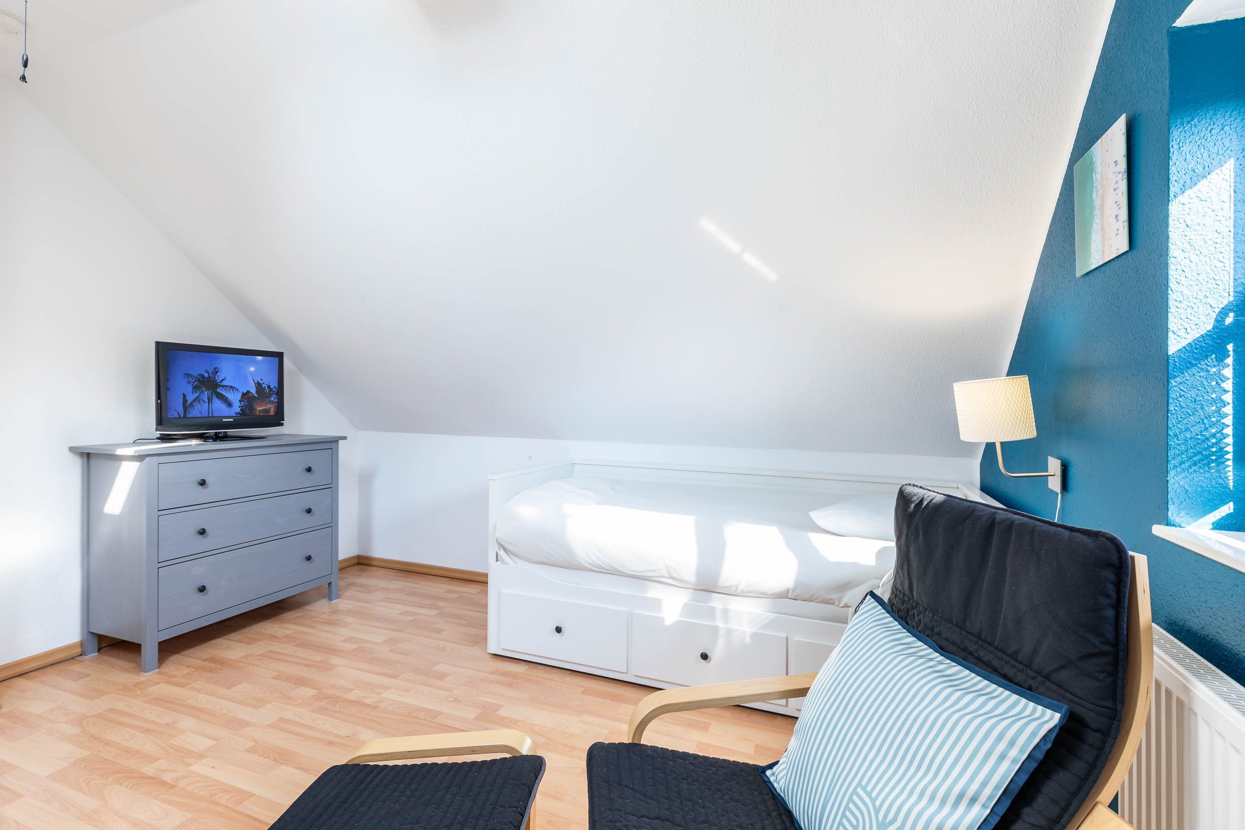 Das 1. Obergeschoss und das Dachgeschoss bieten Platz für bis zu 4 Erwachsene und 1 Kind auf 65qm. Hier befindet sich ein gemütlicher Wohnbereich mit Sofalandschaft, Flatscreen-SAT-TV und Musikanlage. Das Schlafzimmer verfügt über ein Doppelbett und im Dachgeschoss gibt es ein Gästezimmer zwei Einzelbetten sowie einem separaten Ausziehbett und eigenem Flatscreen-TV. Auch hier ist ausreichend Stauraum für Kleidung vorhanden. Das zweite Badezimmer verfügt über eine Dusche, WC und Waschmaschine. Im Dachgeschoss steht außerdem eine Sauna gegen Gebühr zur Verfügung.