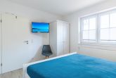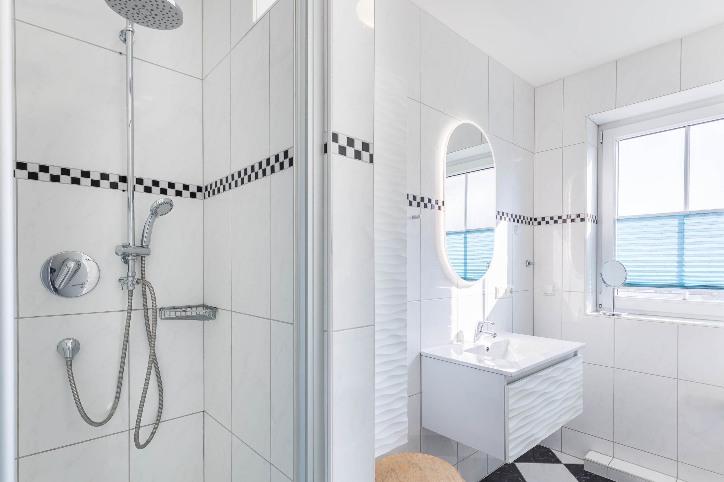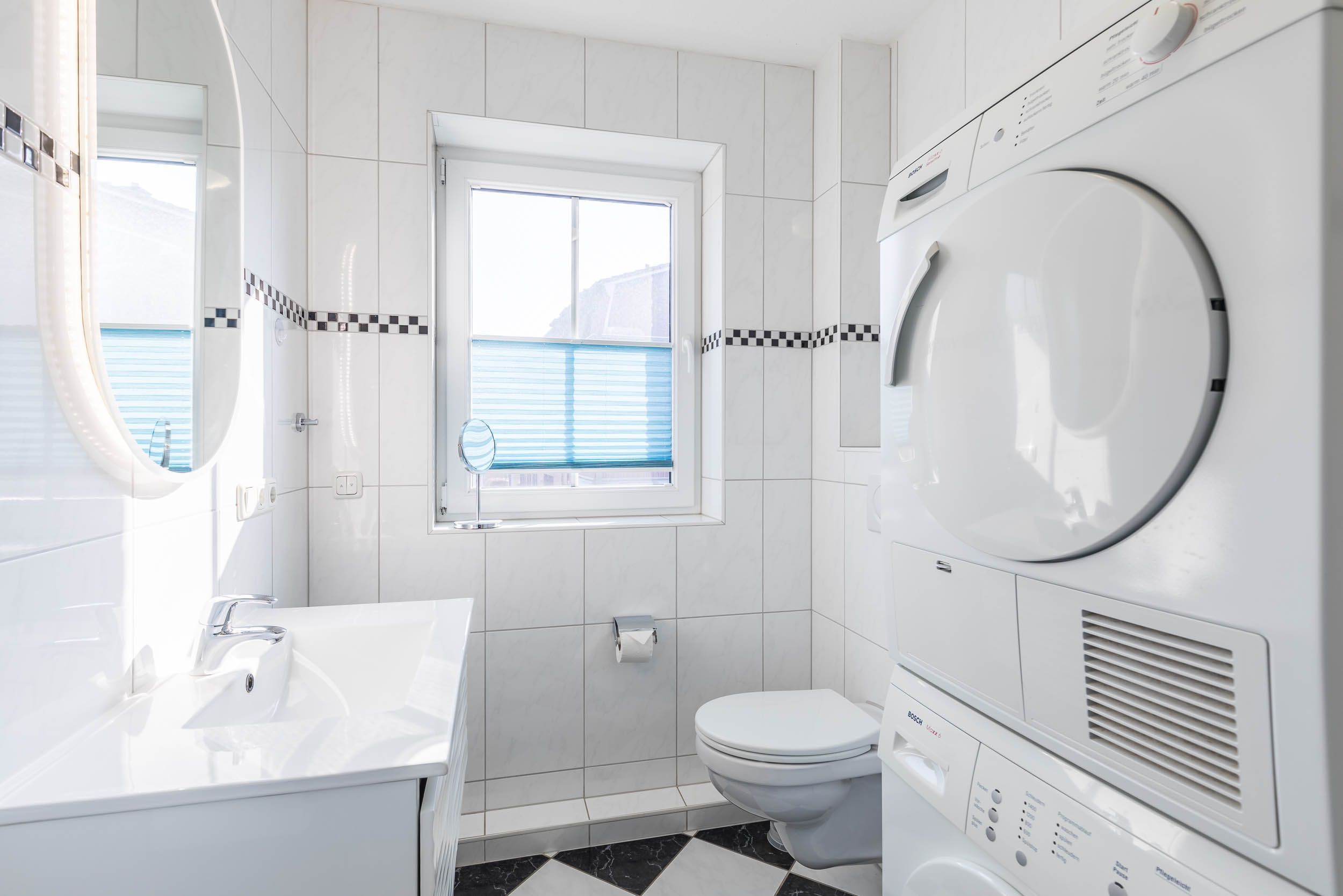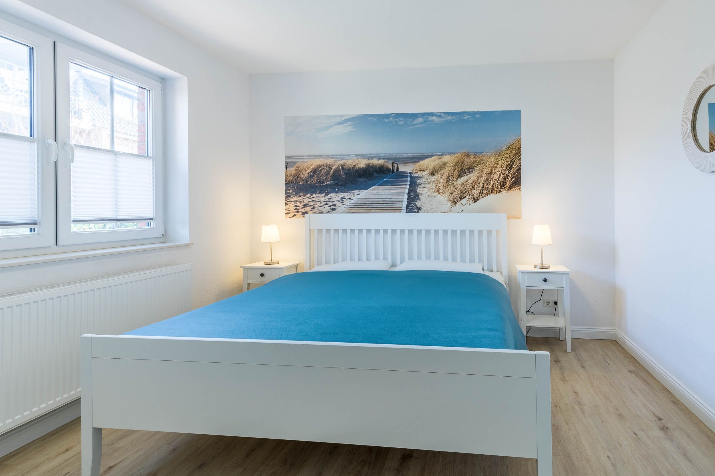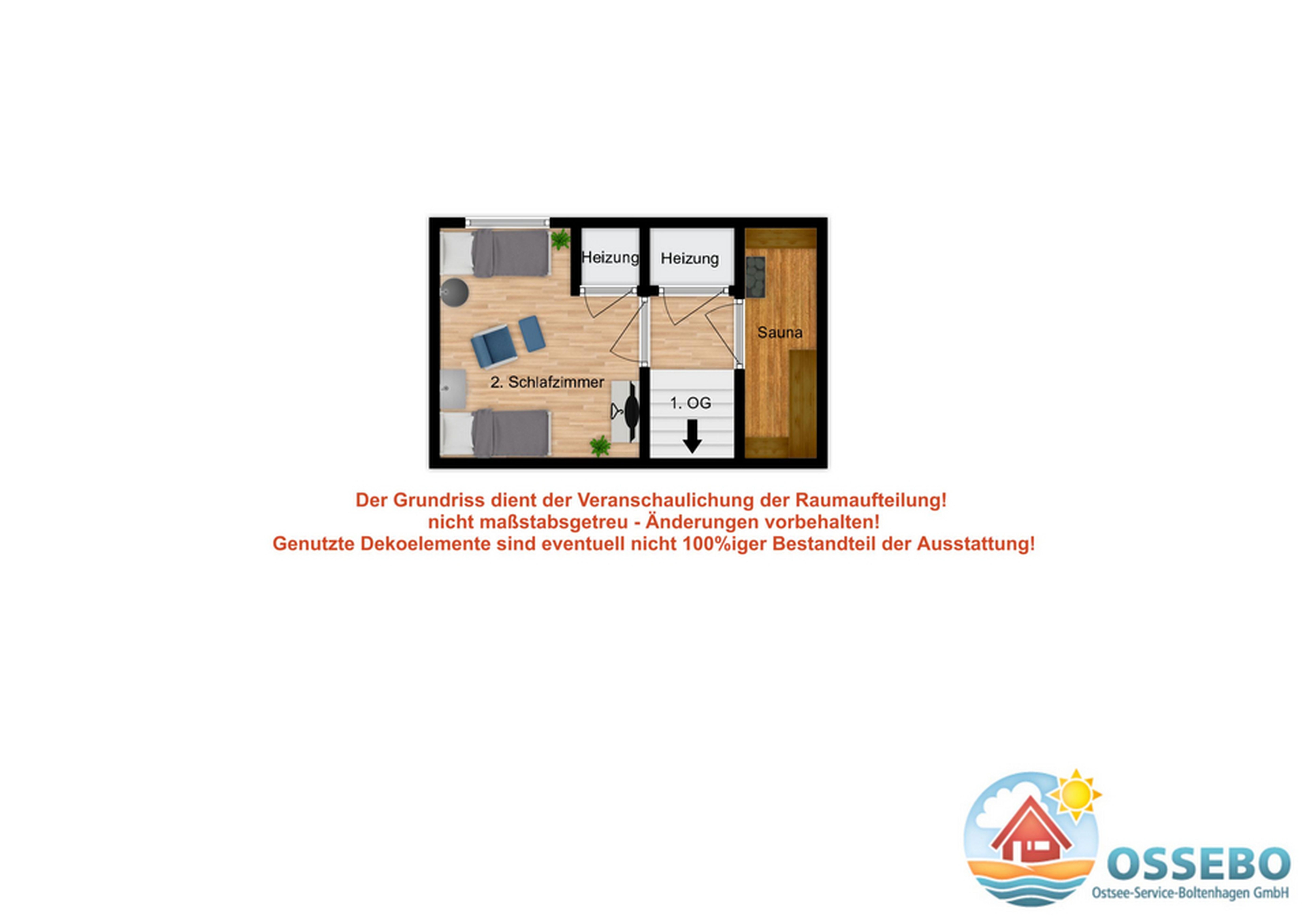 Das 1. Obergeschoss und das Dachgeschoss bieten Platz für bis zu 4 Erwachsene und 1 Kind auf 65qm. Hier befindet sich ein gemütlicher Wohnbereich mit Sofalandschaft, Flatscreen-SAT-TV und Musikanlage. Das Schlafzimmer verfügt über ein Doppelbett und im Dachgeschoss gibt es ein Gästezimmer zwei Einzelbetten sowie einem separaten Ausziehbett und eigenem Flatscreen-TV. Auch hier ist ausreichend Stauraum für Kleidung vorhanden. Das zweite Badezimmer verfügt über eine Dusche, WC und Waschmaschine. Im Dachgeschoss steht außerdem eine Sauna gegen Gebühr zur Verfügung.