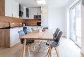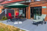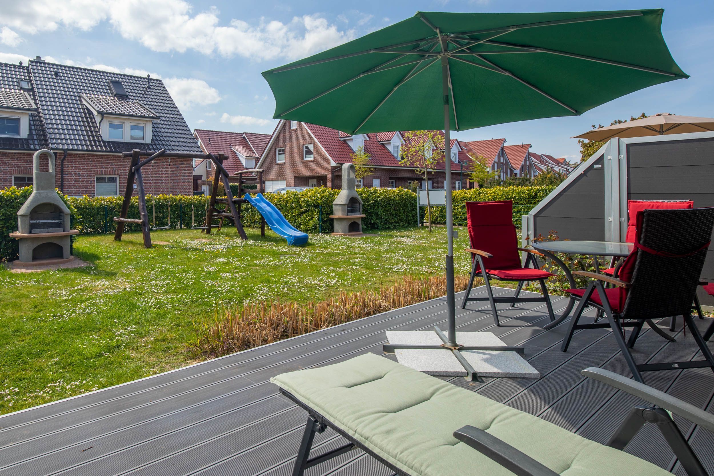Die hauseigene Südwest-Terrasse ist mit bequemen Gartenmöbeln ausgestattet und lädt zum Verweilen ein. Der komplett eingezäunte Gemeinschaftsgarten verfügt über einen kleinen Kinderspielplatz mit Schaukel und Rutsche, der von den Erdgeschoss-Wohnungen genutzt werden kann.