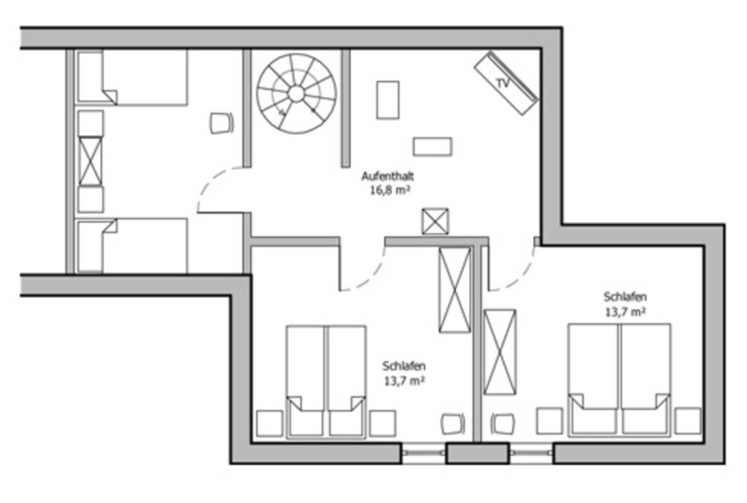 Über eine Wendeltreppe gelangen Sie in einen geräumigen Wohnflur des DG, von dem drei Schlafräume abzweigen. In dem Wohnflur befindet sich eine weitere gemütliche Sitzgelegenheit, darüber hinaus zweigt von hier ein weiterer Balkon mit Relaxliege ab. Alle Räume im DG haben Dachschrägen. Zwei Schlafzimmer sind mit Ehebetten (1,80x2,00) und eins mit Einzelbetten ausgestattet.