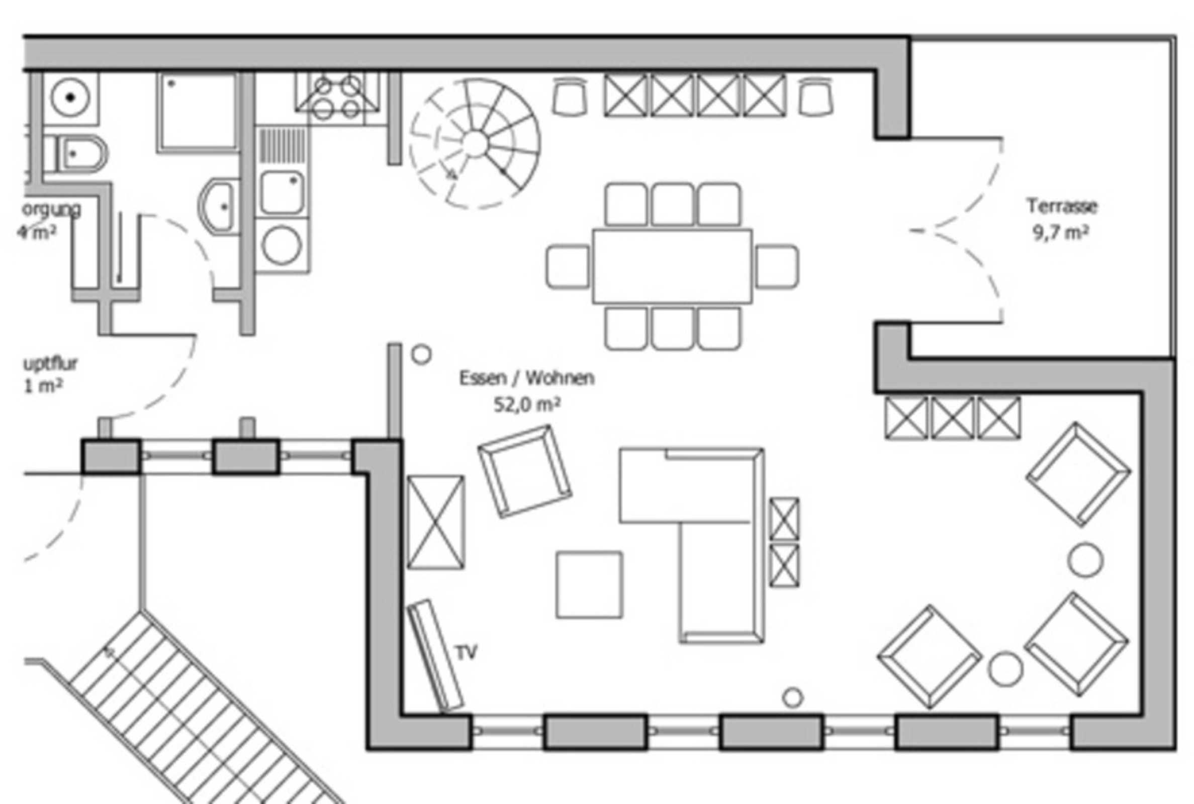 Die beiden komfortablen Nichtraucher-Fewo befinden sich in einem großzügigen Ferienhaus auf dem Grundstück des Vermieters. Über eine Außentreppe gelangen Sie in die nebeneinanderliegenden Fewo, die sich jeweils über zwei Etagen erstrecken. Durch einen gemeinsamen Hauptflur, als Windfang, gelangen Sie in die beiden Fewo und zwar nach rechts in die Milchkammer und nach links in die Käserei, jeweils mit eigenem Flur.