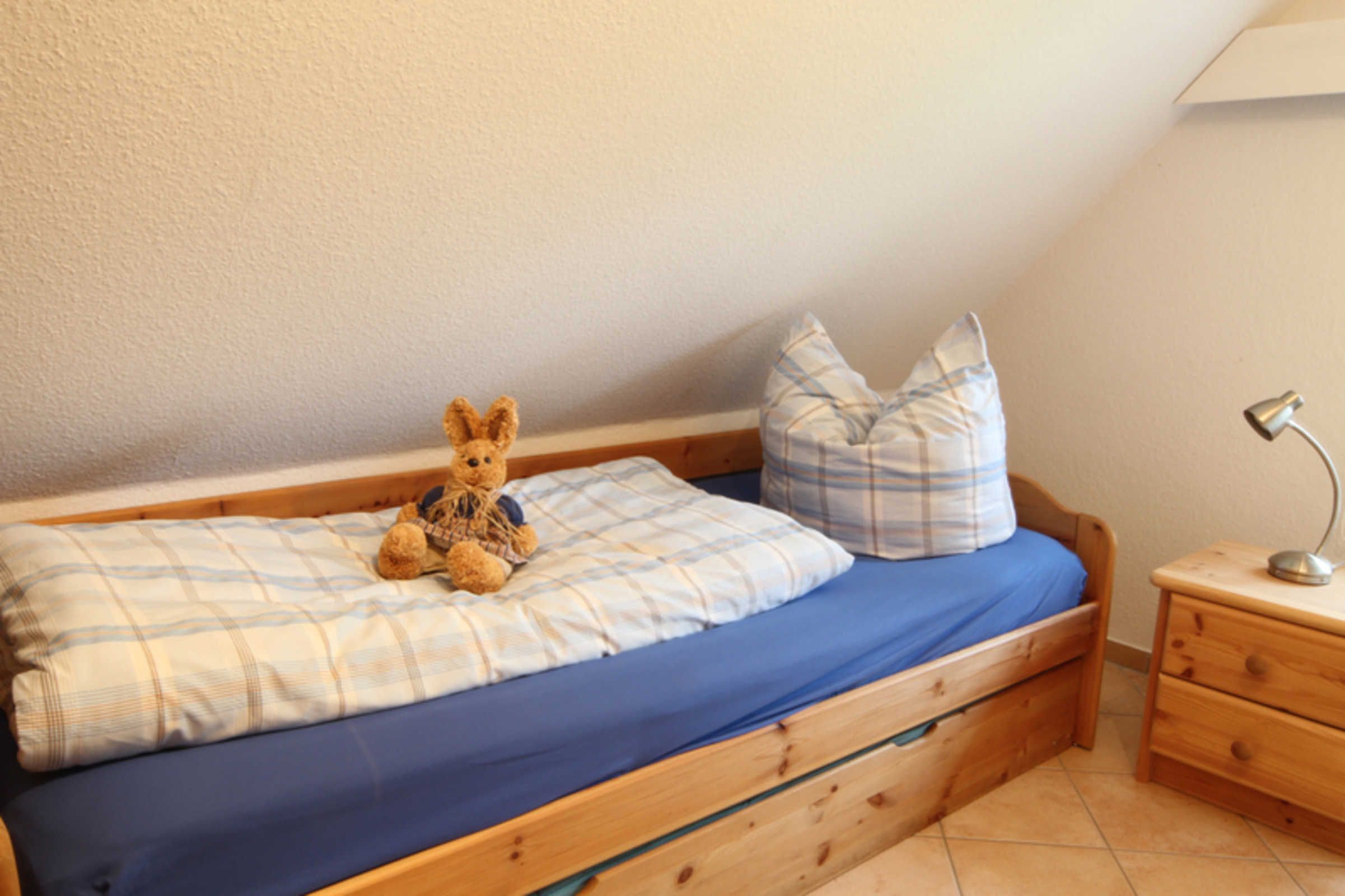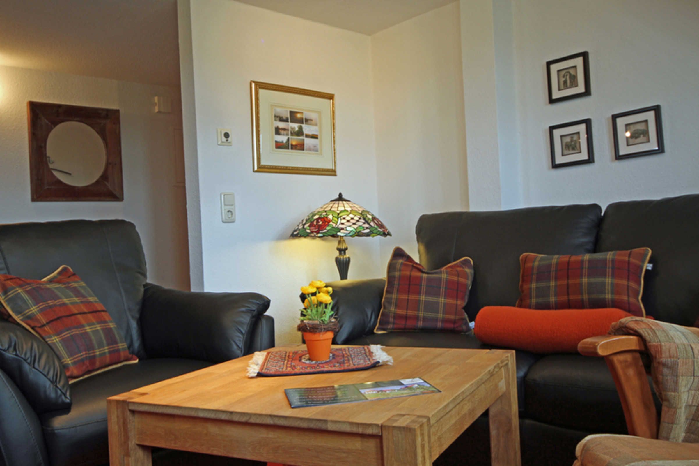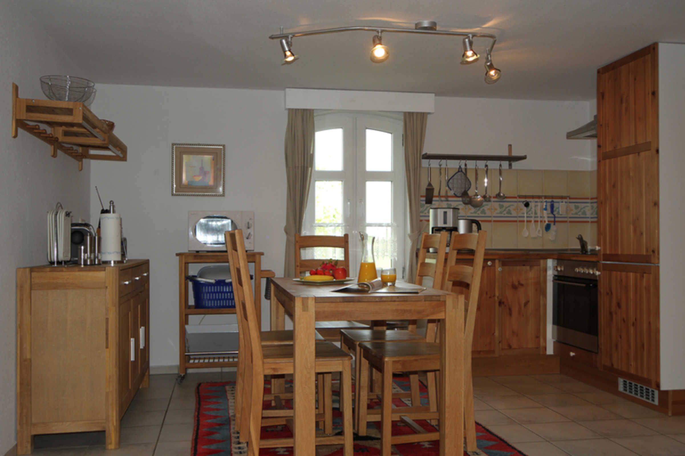 Die komfortable Nichtraucher-Fewo befindet sich im Hauptkomplex der Feriewohnanlage. Durch einen separaten Eingang gelangen Sie in den Gemeinschaftsflur der zu vier Wohnungen führt. Die Fewo liegt im DG und hat einen gemütlichen Wohnbereich mit Couchgarnitur, Stereoanlage, DVD-Player und SAT-TV, sowie einen vollständigen Küchenbereich mit Ceranfeld, Backofen, Geschirrspüler, Kühl-/Gefrierkombination, Mikrowelle, Kaffeemaschine, Toaster, Wasserkocher und Geschirr. Das Bad ist ausgestattet mit einer Dusche, Badewanne, WC, und Haarfön. Das Schlafzimmer ist mit Ehebetten und das Kinderzimmer mit einem Tandembetten ausgestattet. In der Fewo sind Dachschrägen vorhanden, die aber die Bewegungsfreiheit nicht einschränken. Genießen Sie in unseren 2500 qm großen Garten z.B. Ihr Frühstück. Grillmöglichkeit im Garten nach Absprache möglich.